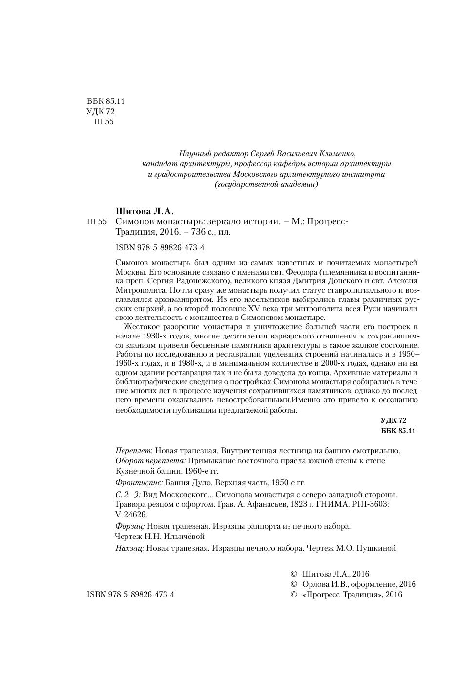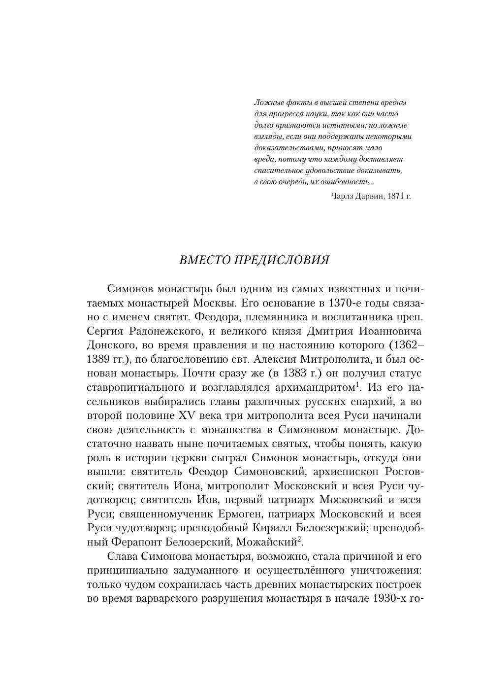 Симонов монастырь был одним из самых известных и почитаемых монастырей москвы. его основание связано с именами свт. Феодора (племянника и воспитанника преп. Сергия радонежского), великого князя Дмитрия Донского и свт. Алексия митрополита. почти сразу же монастырь получил статус ставропигиального и возглавлялся архимандритом. из его насельников выбирались главы различных русских епархий, а во второй половине XV века три митрополита всея руси начинали свою деятельность с монашества в Симоновом монастыре. Жестокое разорение монастыря и уничтожение большей части его построек в начале 1930-х годов, многие десятилетия варварского отношения к сохранившимся зданиям привели бесценные памятники архитектуры в самое жалкое состояние. работы по исследованию и реставрации уцелевших строений начинались и в 1950–1960-х годах, и в 1980-х, и в минимальном количестве в 2000-х годах, однако ни на одном здании реставрация так и не была доведена до конца. Архивные материалы и библиографические сведения о постройках Симонова монастыря собирались в течение многих лет в процессе изучения сохранившихся памятников, однако до последнего времени оказывались невостребованными.именно это привело к осознанию необходимости публикации предлагаемой работы.