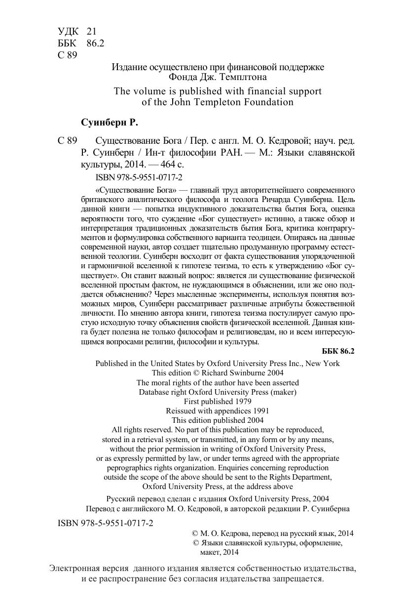 Существование Бога - главный труд авторитетнейшего современного британского аналитического философа и теолога Ричарда Суинберна. Цель данной книги - попытка индуктивного доказательства бытия Бога, оценка вероятности того, что суждение "Бог существует" истинно, а также обзор и интерпретация традиционных доказательств бытия Бога, критика контраргументов и формулировка собственного варианта теодицеи. Опираясь на данные современной науки, автор создает тщательно продуманную программу естественной теологии. Суинберн восходит от факта существования упорядоченной и гармоничной вселенной к гипотезе теизма, то есть к утверждению "Бог существует". Он ставит важный вопрос: является ли существование физической вселенной простым фактом, не нуждающимся в объяснении, или же оно поддается объяснению? Через мысленные эксперименты, используя понятия возможных миров. Суинберн рассматривает различные атрибуты божественной личности. По мнению автора книги, гипотеза теизма постулирует самую простую исходную точку объяснения свойств физической вселенной. Данная книга будет полезна не только философам и религиоведам, но и всем интересующимся вопросами религии, философии и культуры.