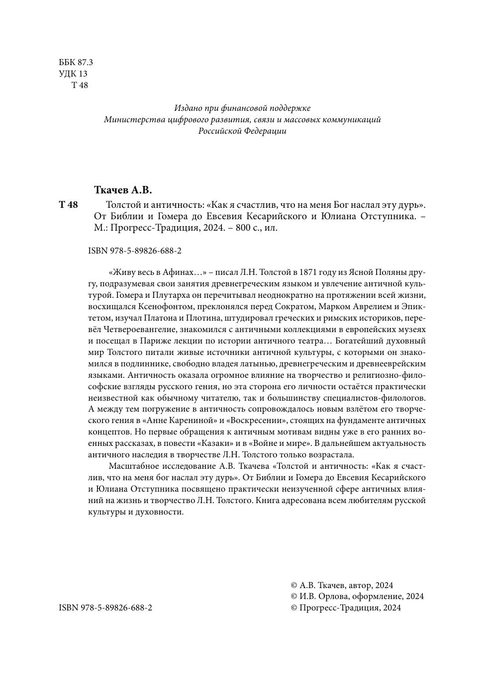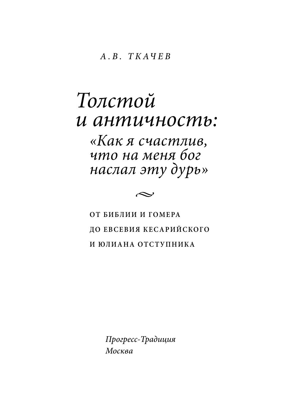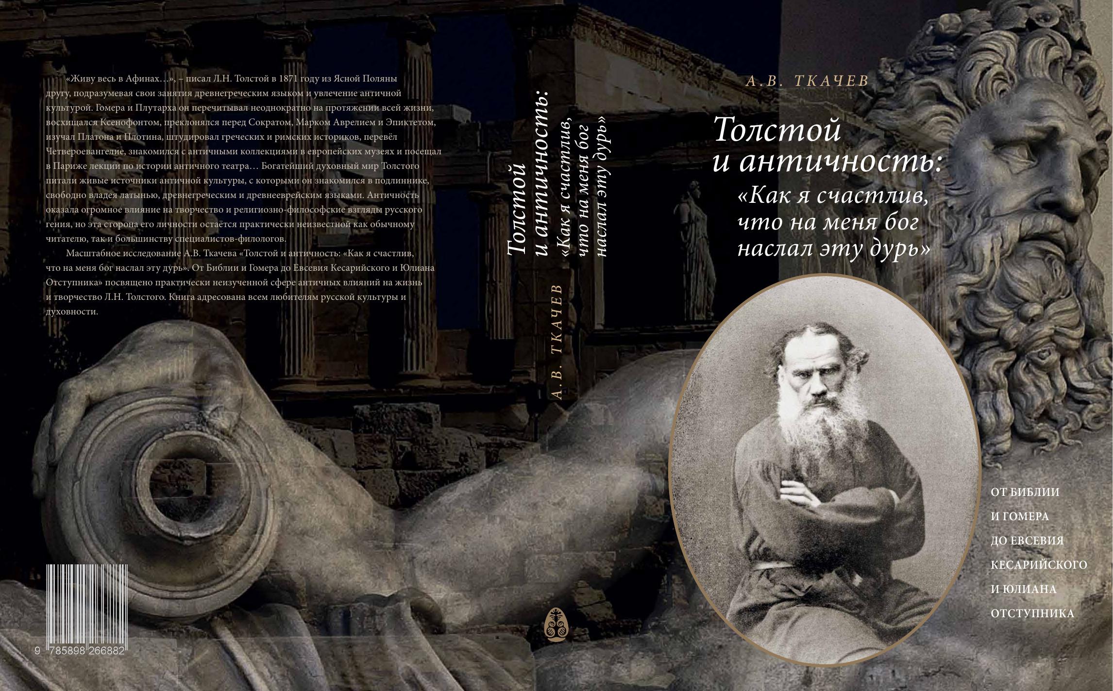 А между тем погружение в античность сопровождалось новым взлётом его творческого гения в «Анне Карениной» и «Воскресении», стоящих на фундаменте античных концептов. Но первые обращения к античным мотивам видны уже в его ранних военных рассказах, в повести «Казаки» и в «Войне и мире». В дальнейшем актуальность античного наследия в творчестве Л.Н. Толстого только возрастала. Масштабное исследование А.В. Ткачева «Толстой и античность: «Как я счастлив, что на меня бог наслал эту дурь». От Библии и Гомера до Евсевия Кесарийского и Юлиана Отступника посвящено практически неизученной сфере античных влияний на жизнь и творчество Л.Н. Толстого. Книга адресована всем любителям русской культуры и духовности.