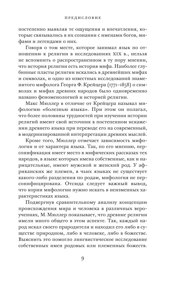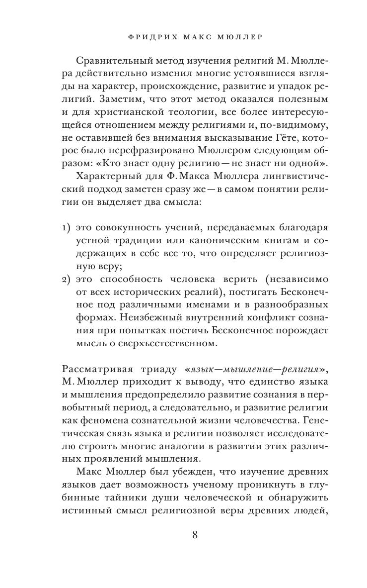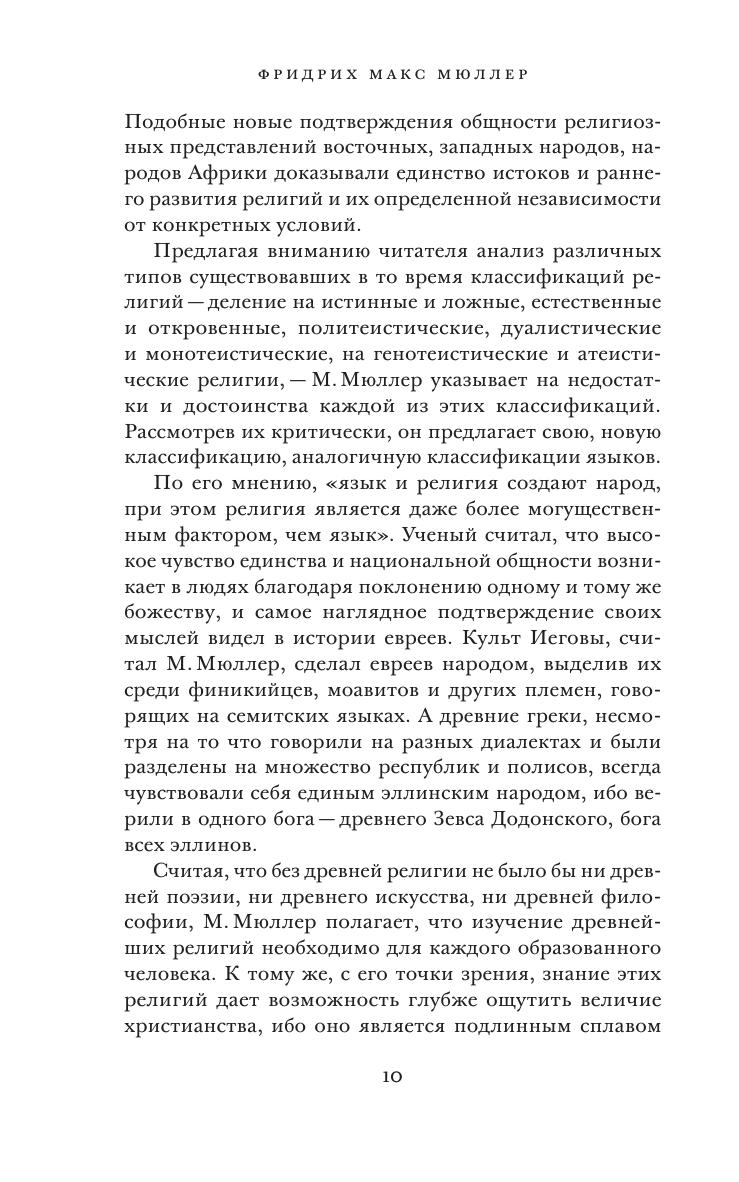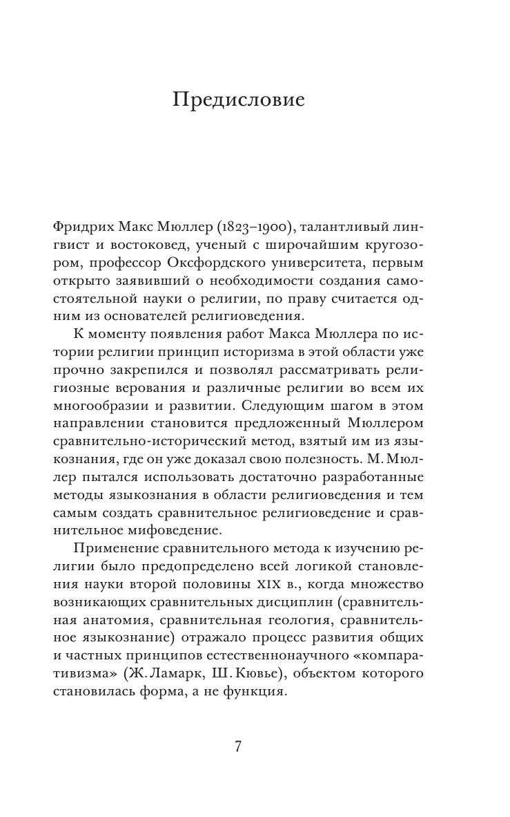 В книге основоположника компаративного религиоведения Ф. Макса Мюллера при анализе религиозных феноменов впервые использован сравнительный метод. Рассматривая развитие религии по аналогии с развитием языка и мышления, автор справедливо отмечает их генетическую связь и, исходя из нее, строит свое исследование, опираясь на огромный исторический материал. Он выделяет три языковых и религиозных центра: арийский, семитский и туранский, анализирует существующие в то время классификации религий, сопоставляет священные тексты различных религий, исследует то общее, что присуще им всем, и то, что составляет специфику каждого, выявляет то особенное, что позволяет говорить о религии в целом как социокультурном феномене. Книга рассчитана на религиоведов, филологов, культурологов, историков, этнологов, востоковедов — студентов, аспирантов, преподавателей, а также на широкий круг читательской аудитории, всех тех, кто интересуется проблемами религии и религиоведения.
