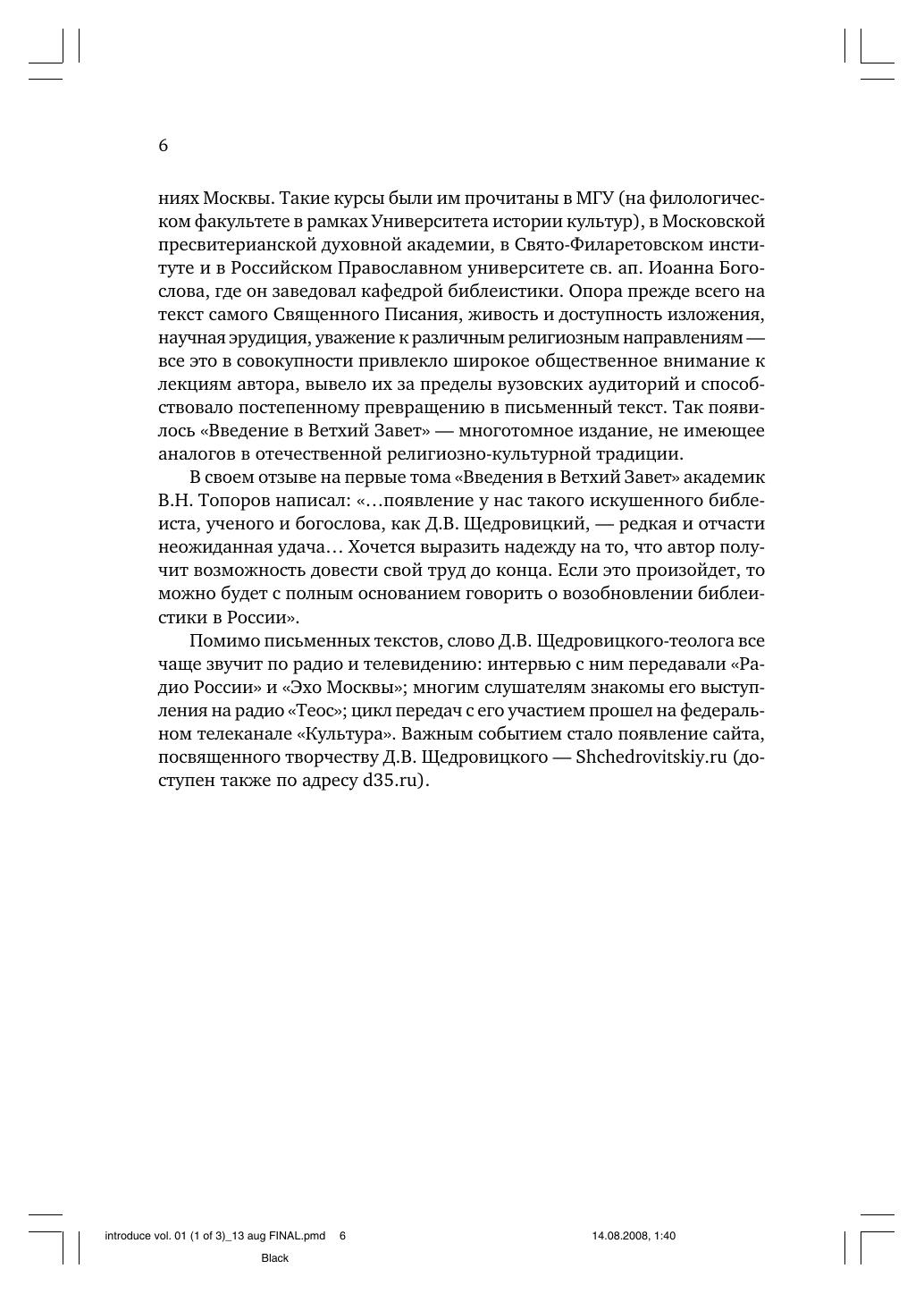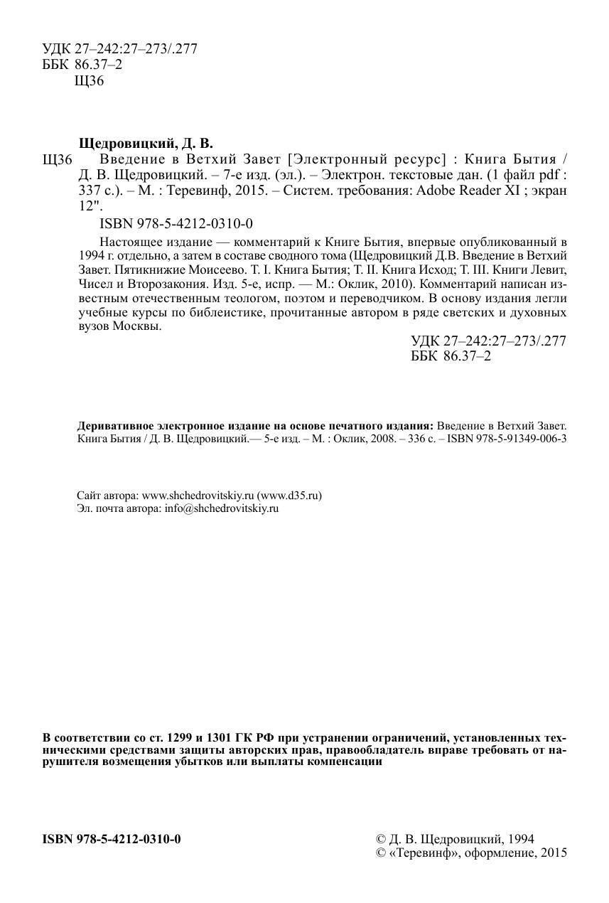 Настоящее издание — комментарий к Книге Бытия, впервые опубликованный в 1994 г. отдельно, а затем в составе сводного тома (Щедровицкий Д.В. Введение в Ветхий Завет. Пятикнижие Моисеево. Т. I. Книга Бытия; Т. II. Книга Исход; Т. III. Книги Левит, Чисел и Второзакония. Изд. 5-е, испр. — М.: Оклик, 2010). Комментарий написан известным отечественным теологом, поэтом и переводчиком. В основу издания легли учебные курсы по библеистике, прочитанные автором в ряде светских и духовных вузов Москвы.