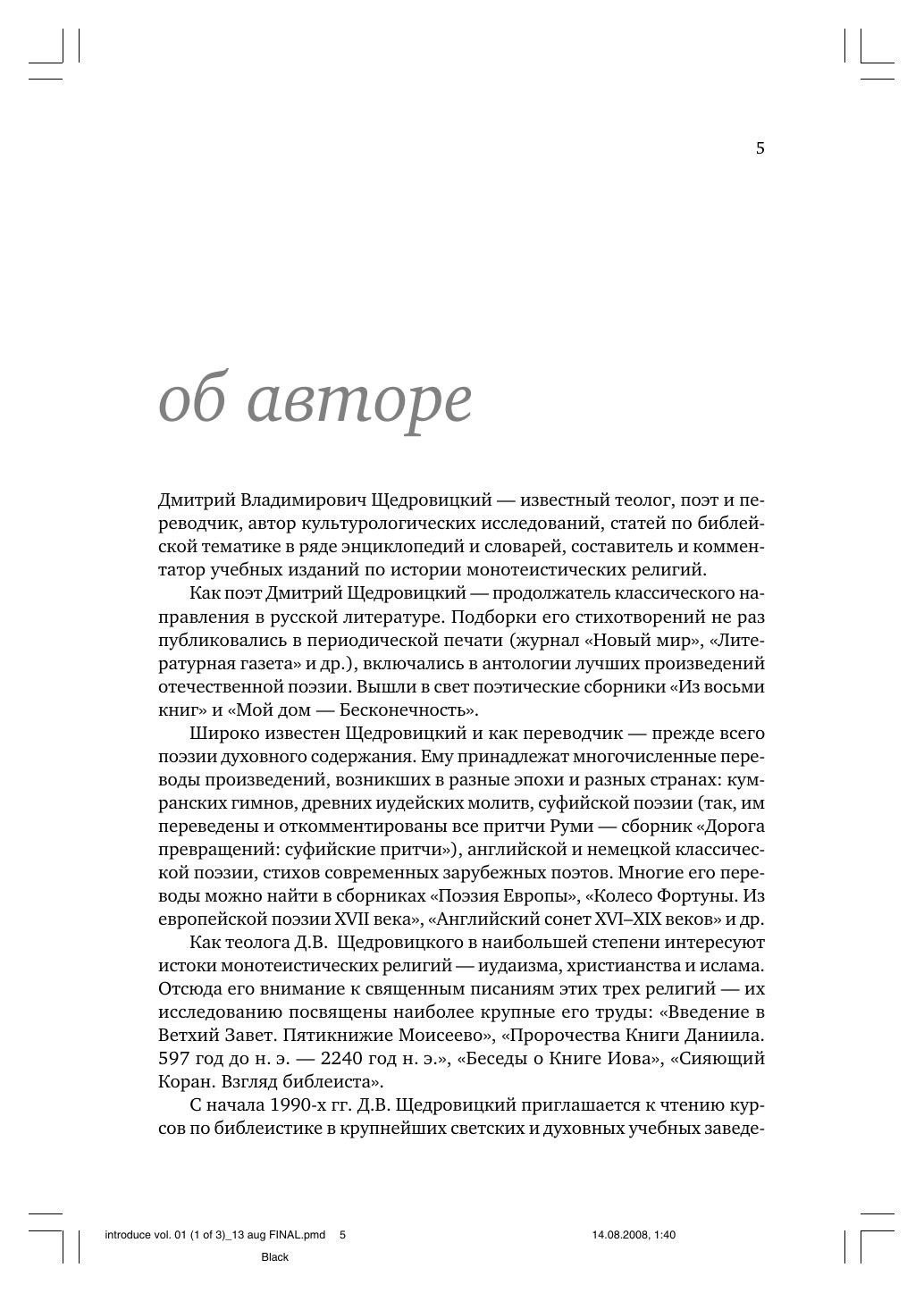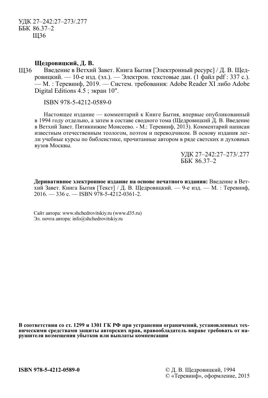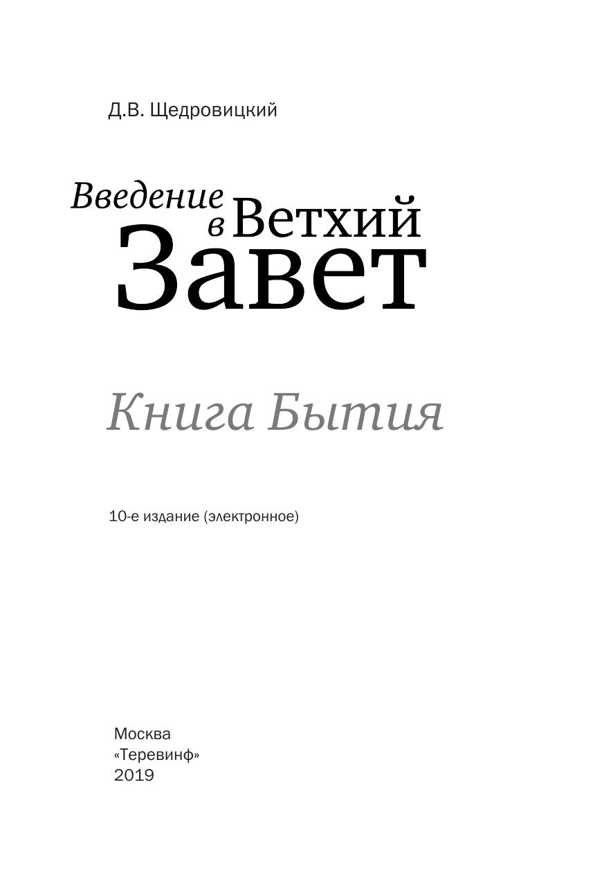 Настоящее издание — комментарий к Книге Бытия, впервые опубликованный в 1994 г. отдельно, а затем в составе сводного тома (Щедровицкий Д.В. Введение в Ветхий Завет. Пятикнижие Моисеево. Т. I. Книга Бытия; Т. II. Книга Исход; Т. III. Книги Левит, Чисел и Второзакония. Изд. 5-е, испр. — М.: Оклик, 2010). Комментарий написан известным отечественным теологом, поэтом и переводчиком. В основу издания легли учебные курсы по библеистике, прочитанные автором в ряде светских и духовных вузов Москвы.