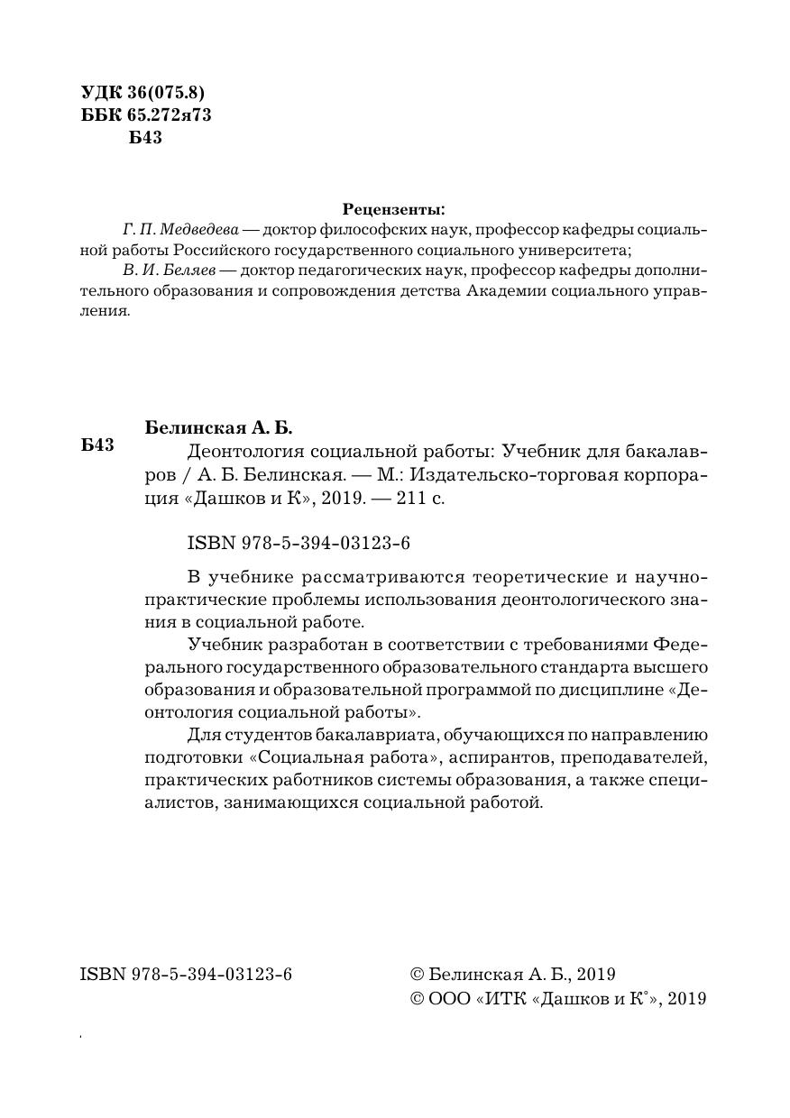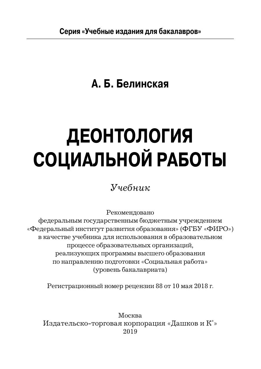 В учебнике рассматриваются теоретические и научно-практические проблемы использования деонтологического знания в социальной работе. Учебник разработан в соответствии с требованиями Федерального государственного образовательного стандарта высшего образования и образовательной программой по дисциплине «Деонтология социальной работы». Для студентов бакалавриата, обучающихся по направлению подготовки «Социальная работа», аспирантов, преподавателей, практических работников системы образования, а также специалистов, занимающихся социальной работой.