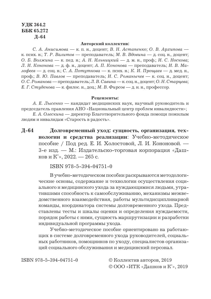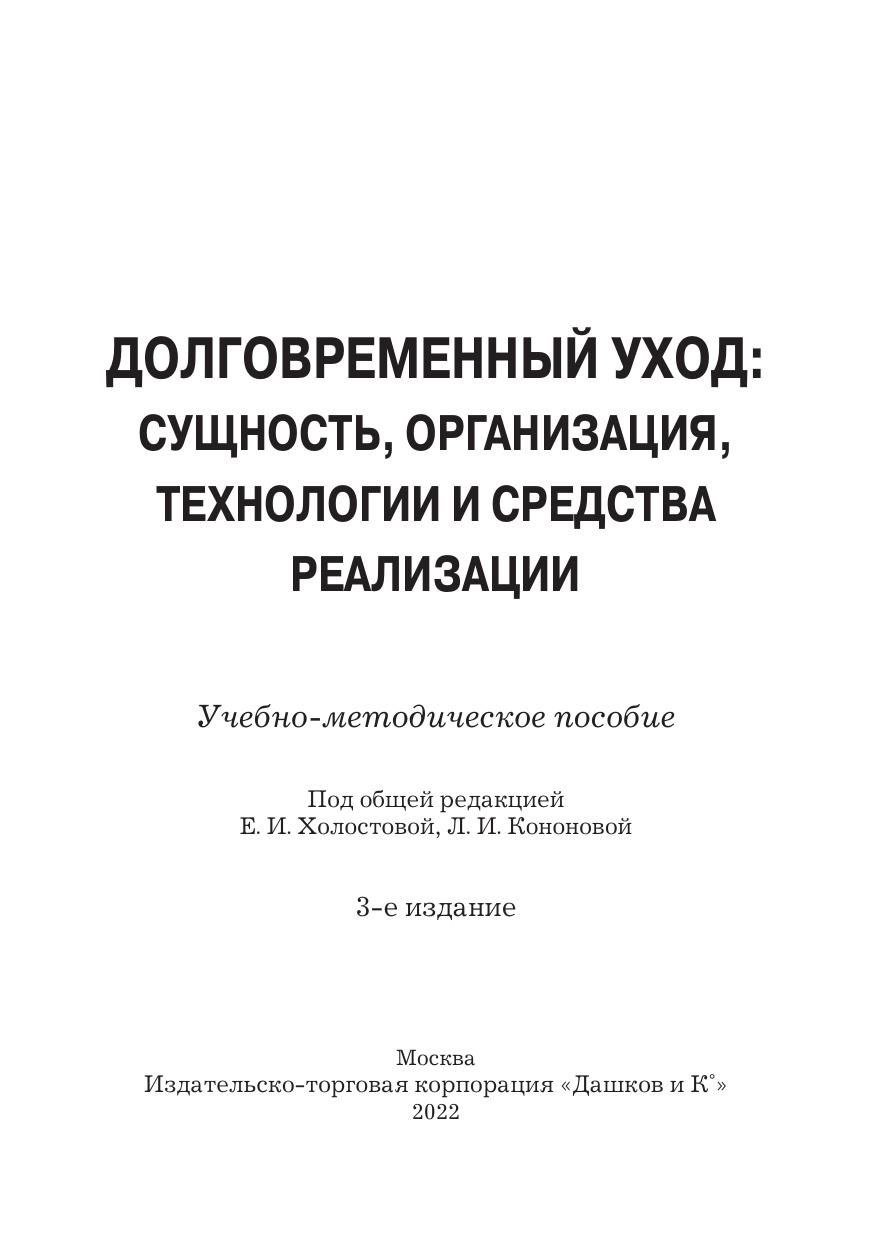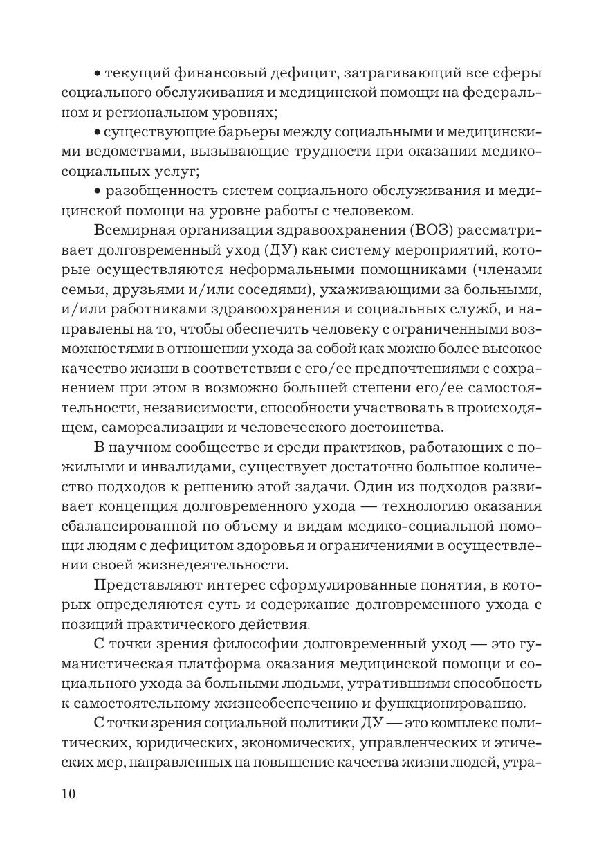 В учебно-методическом пособии раскрываются методологические основы, содержание и технологии осуществления социального и медицинского ухода за нуждающимися людьми, утратившими способность к самообслуживанию, механизмы межведомственного взаимодействия, работы мультидисциплинарной команды, координатора системы долговременного ухода. Представлены тесты и шкалы оценки и определения нуждаемости, порядок работы с ними, сущность маршрутизации и разработки индивидуальной программы ухода. Учебно-методическое пособие ориентировано на работающих в системе долговременного ухода руководителей, социальных работников, помощников по уходу, специалистов организаций социального обслуживания и медицинский персонал.