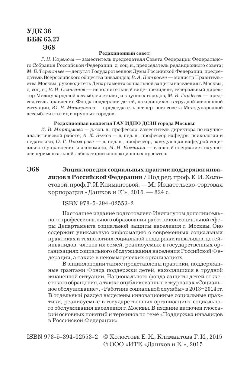 Настоящее издание подготовлено Институтом дополнительного профессионального образования работников социальной сферы Департамента социальной защиты населения города Москвы. Оно содержит уникальную информацию о современных социальных практиках и технологиях социальной поддержки инвалидов, детей-инвалидов, членов их семей, реализуемых в государственных организациях социального обслуживания населения Российской Федерации, а также в некоммерческих организациях. В энциклопедии также представлены и практики, поддержанные грантами Фонда поддержки детей, находящихся в трудной жизненной ситуации, Национального фонда защиты детей от жестокого обращения, а также опубликованные в журнале "Социальное обслуживание", "Работник социальной службы" в 2013-2014 годах. В отдельный раздел выделены инновационные социальные практики, реализуемые в государственных организациях социального обслуживания населения города Москвы. В издании включен глоссарий основных понятий и терминов по теме "Поддержка инвалидов в Российской Федерации".