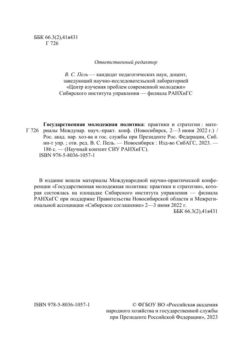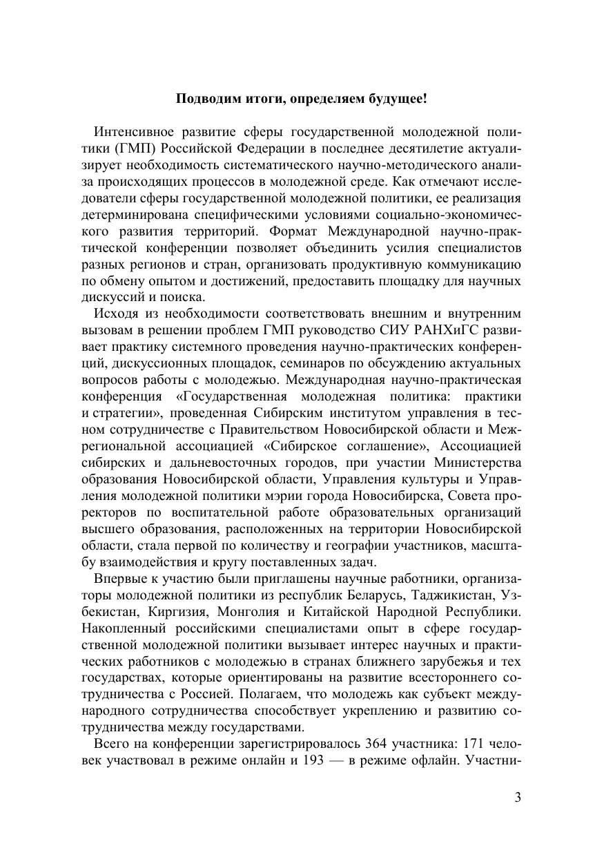 В издание вошли материалы Международной научно-практической конфе-ренции «Государственная молодежная политика: практики и стратегии», кото-рая состоялась на площадке Сибирского института управления — филиала РАНХиГС при поддержке Правительства Новосибирской области и Межреги-ональной ассоциации «Сибирское соглашение» 2—3 июня 2022 г.
