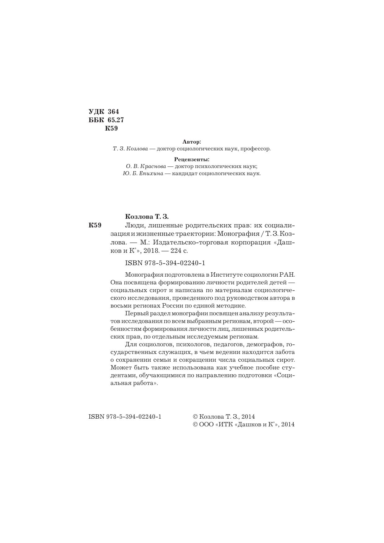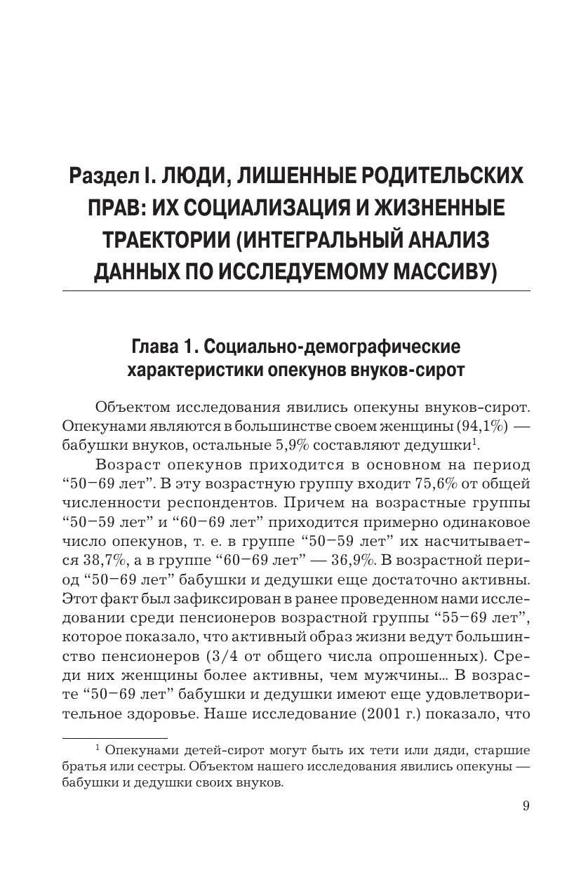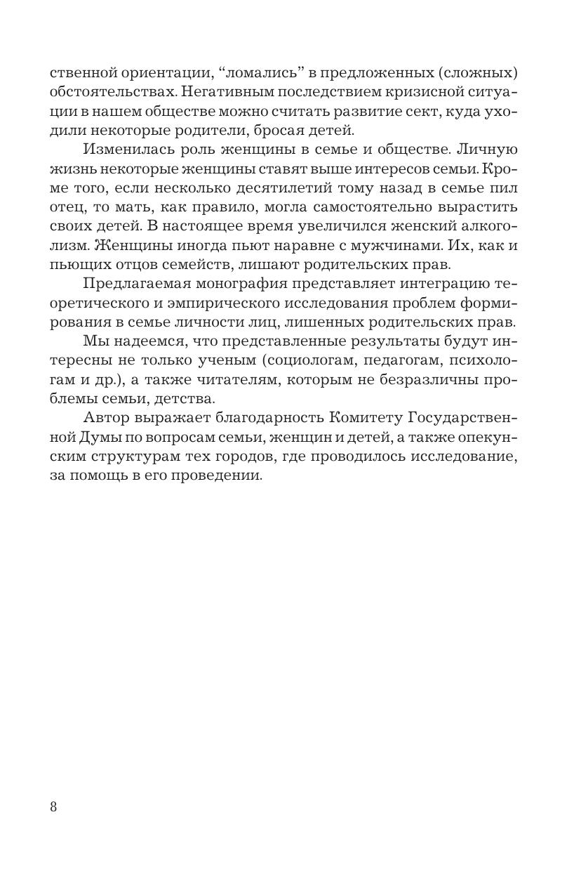 Монография подготовлена в Институте социологии РАН. Она посвящена формированию личности родителей детей — социальных сирот и написана по материалам социологического исследования, проведенного под руководством автора в восьми регионах России по единой методике. Первый раздел монографии посвящен анализу результатов исследования по всем выбранным регионам, второй — особенностям формирования личности лиц, лишенных родительских прав, по отдельным исследуемым регионам. Для социологов, психологов, педагогов, демографов, государственных служащих, в чьем ведении находится забота о сохранении семьи и сокращении числа социальных сирот. Может быть также использована как учебное пособие студентами, обучающимися по направлению подготовки «Социальная работа».
