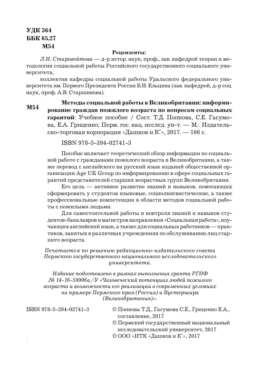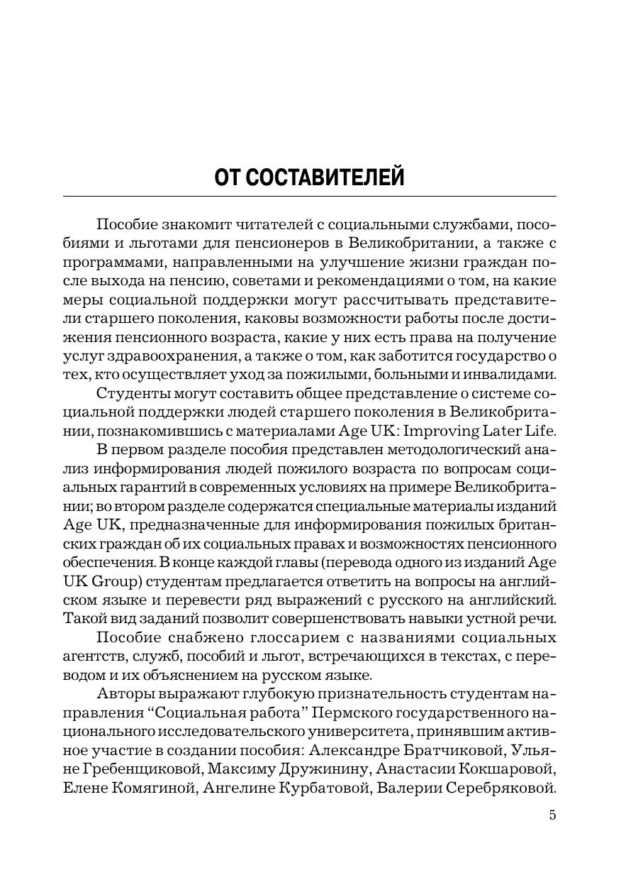 Пособие включает теоретический обзор информации по социальной работе с гражданами пожилого возраста в Великобритании, а также перевод с английского на русский язык изданий общественной организации Age UK Group по информированию в сфере социальных гарантий представителей старших возрастных групп Великобритании.