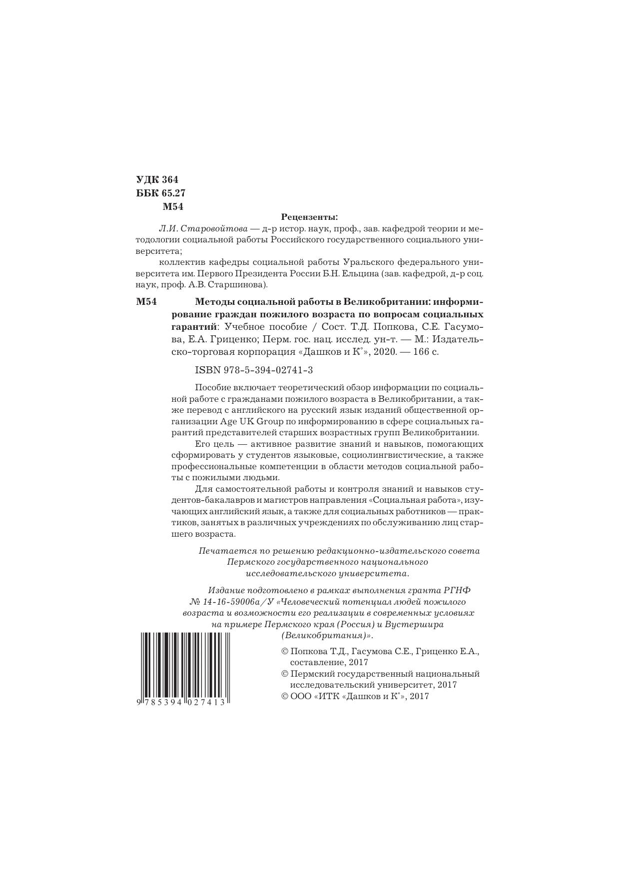 Пособие включает теоретический обзор информации по социальной работе с гражданами пожилого возраста в Великобритании, а также перевод с английского на русский язык изданий общественной организации Age UK Group по информированию в сфере социальных гарантий представителей старших возрастных групп Великобритании. Его цель- активное развитие знаний и навыков, помогающих сформировать у студентов языковые, социолингвистические, а также профессиональные компетенции в области методов социальной работы с пожилыми людьми. Для самостоятельной работы и контроля знаний и навыков студентов-бакалавров и магистров направлений "Социальная работа", изучающих английский язык, а также для социальных работников - практиков, занятых в различных учреждениях по обслуживанию лиц старшего возраста.