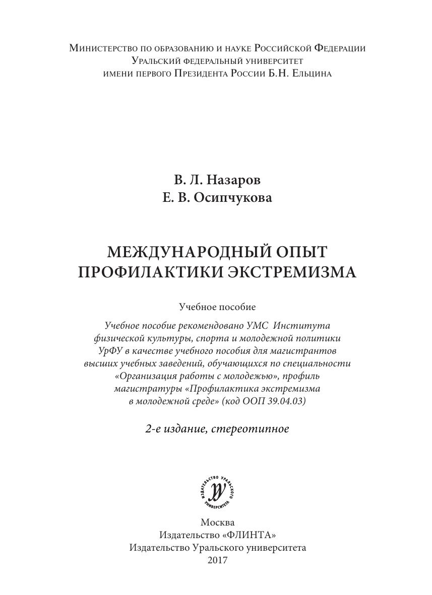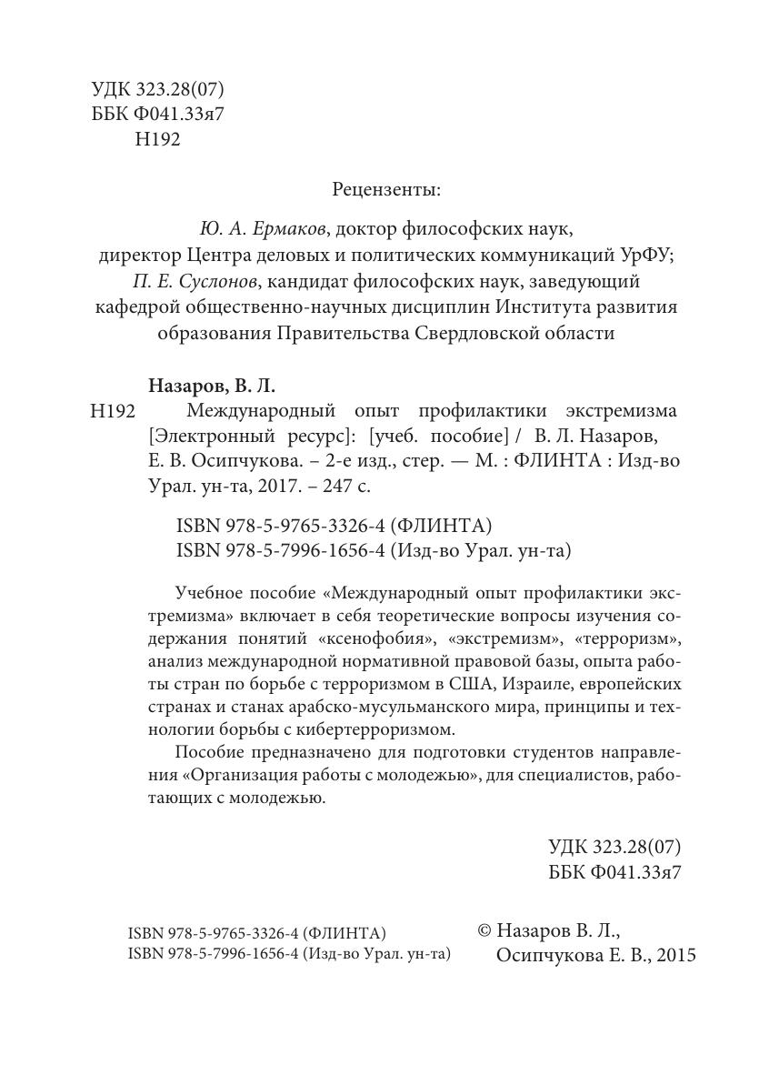 Учебное пособие «Международный опыт профилактики экстремизма» включает в себя теоретические вопросы изучения содержания понятий «ксенофобия», «экстремизм», «терроризм», анализ международной нормативной правовой базы, опыта работы стран по борьбе с терроризмом в США, Израиле, европейских странах и станах арабско-мусульманского мира, принципы и технологии борьбы с кибертерроризмом. Пособие предназначено для подготовки студентов направления «Организация работы с молодежью», для специалистов, работающих с молодежью.
