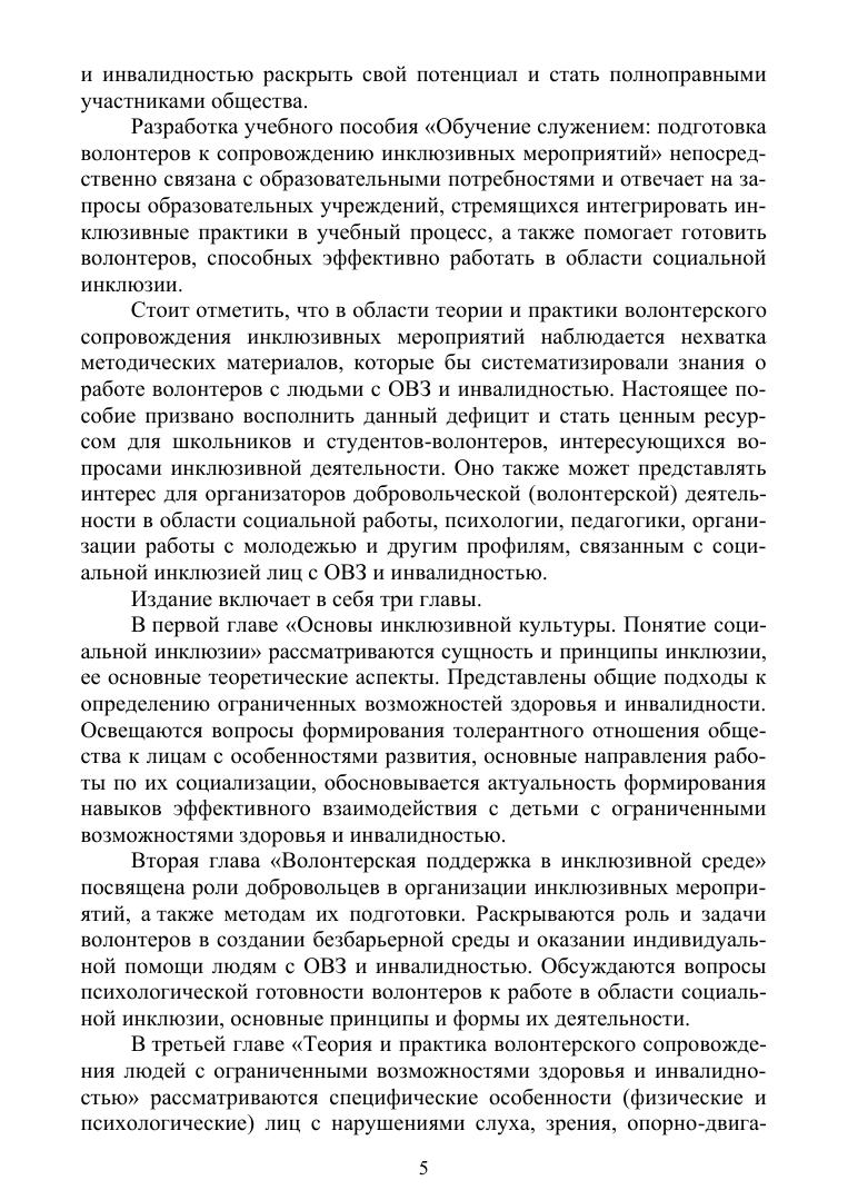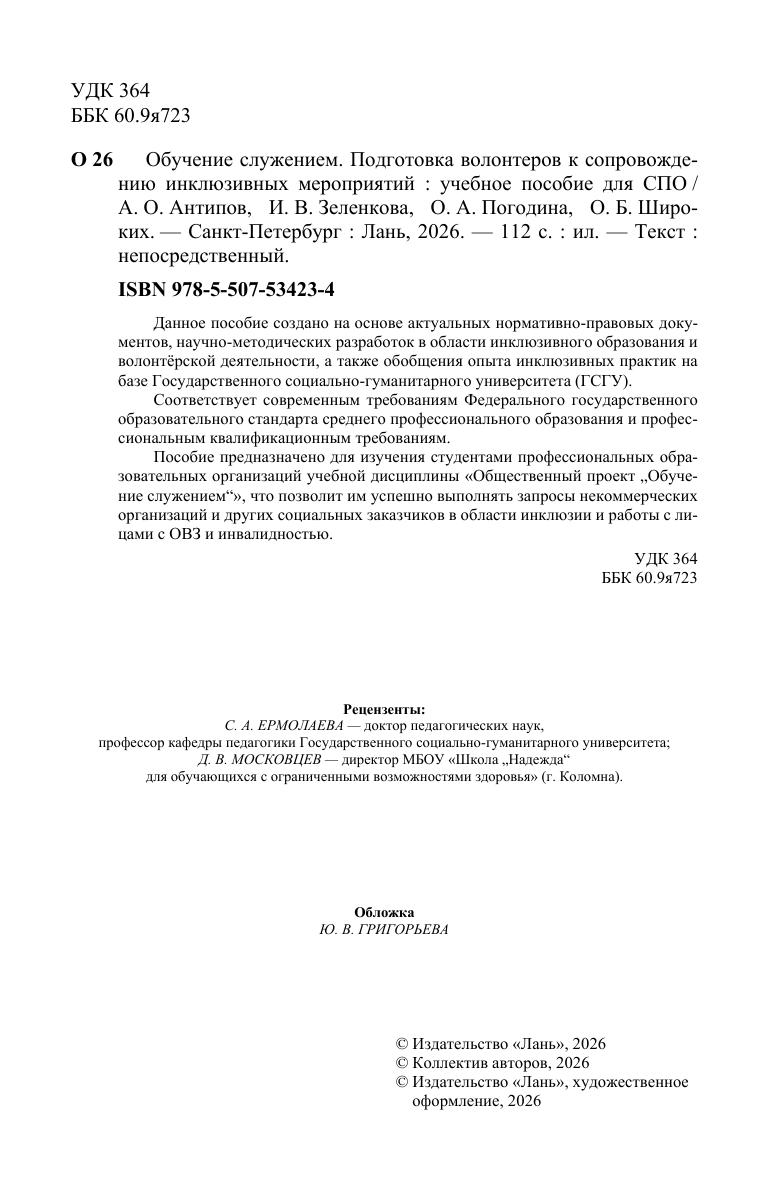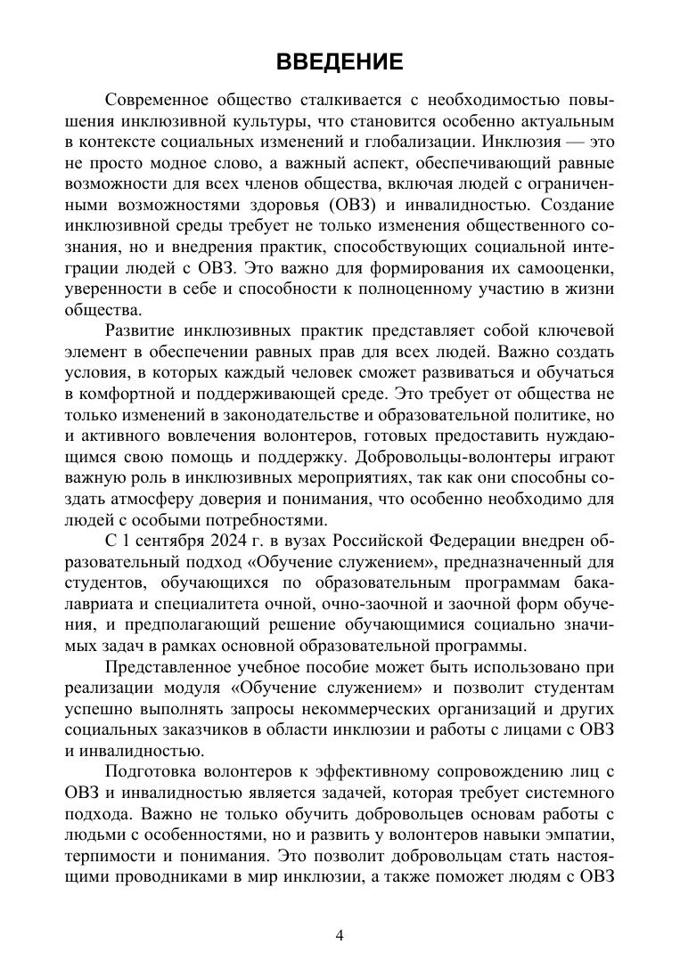 Данное пособие создано на основе актуальных нормативно-правовых документов, научно-методических разработок в области инклюзивного образования и волонтёрской деятельности, а также обобщения опыта инклюзивных практик на базе Государственного социально-гуманитарного университета (ГСГУ). Соответствует современным требованиям Федерального государственного образовательного стандарта среднего профессионального образования и профессиональным квалификационным требованиям. Пособие предназначено для изучения студентами профессиональных образовательных организаций учебной дисциплины «Общественный проект „Обучение служением“», что позволит им успешно выполнять запросы некоммерческих организаций и других социальных заказчиков в области инклюзии и работы с лицами с ОВЗ и инвалидностью.