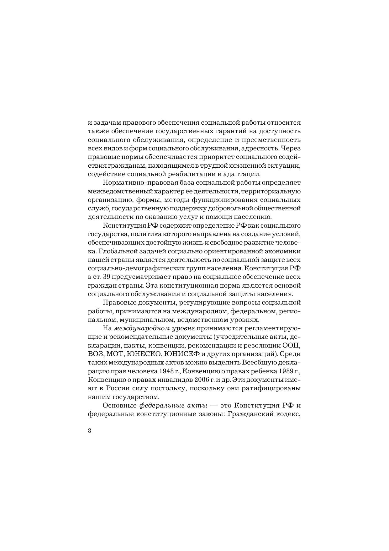 Учебник составлен в соответствии с требованиями Федерального государственного образовательного стандарта третьего поколения, с учетом при изложении материала предусмотренных стандартом общекультурных и профессиональных компетенций специалистов по социальной работе. Для студентов бакалавриата, обучающихся по направлению подготовки «Социальная работа», руководителей и специалистов социальной сферы, а также тех, кто интересуется проблемами современного правового обеспечения в социальной работе и стремится к тому, чтобы его социальное учреждение работало более эффективно.