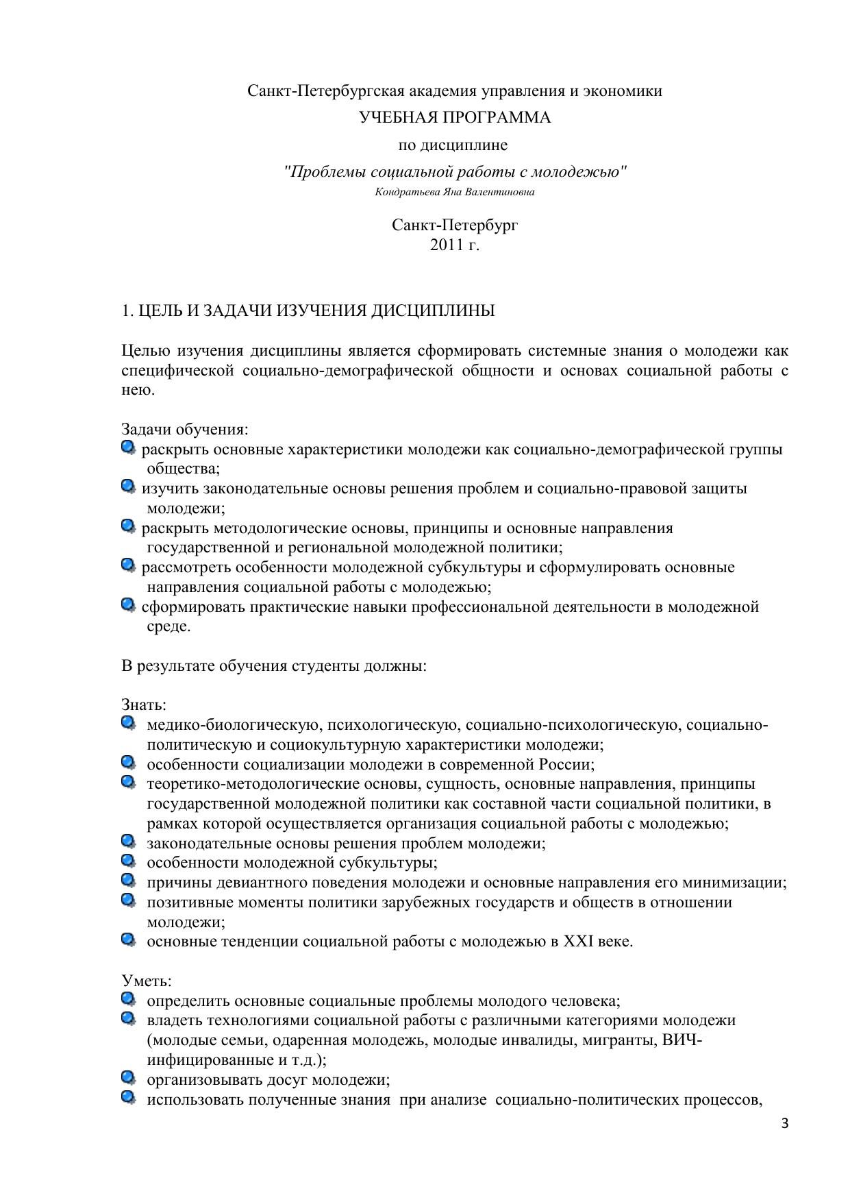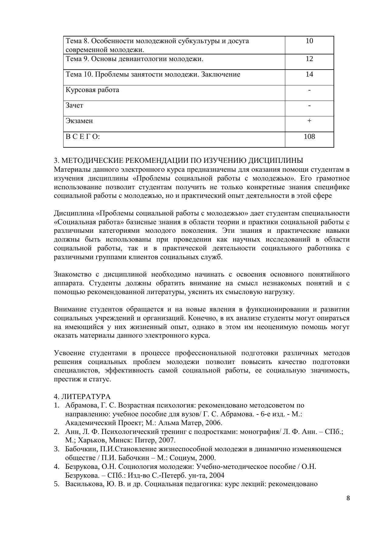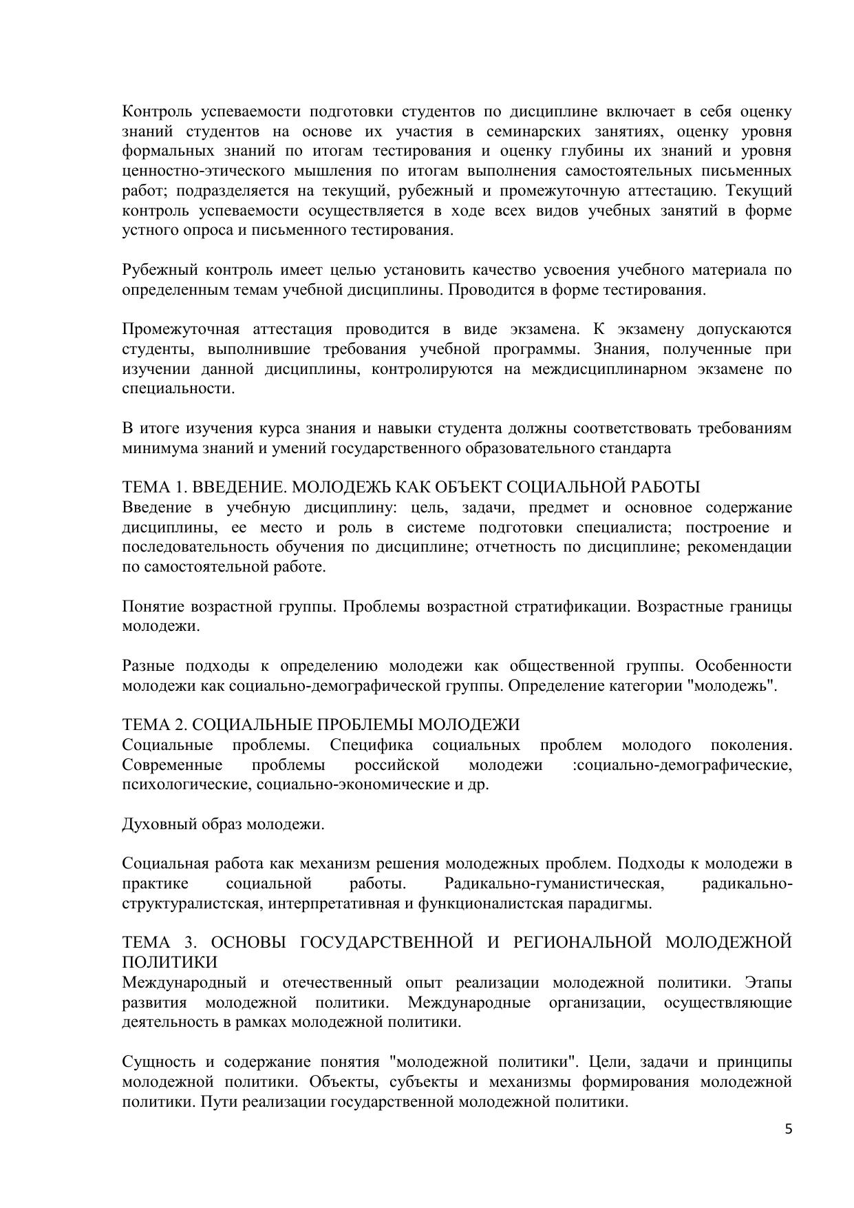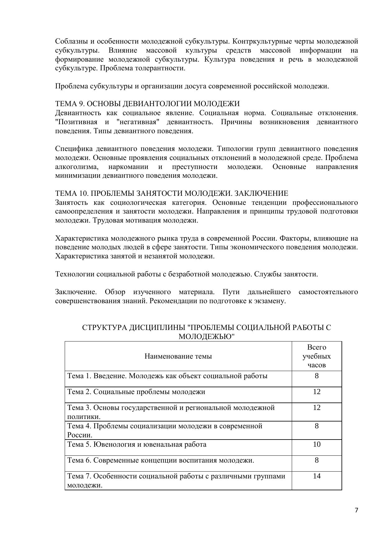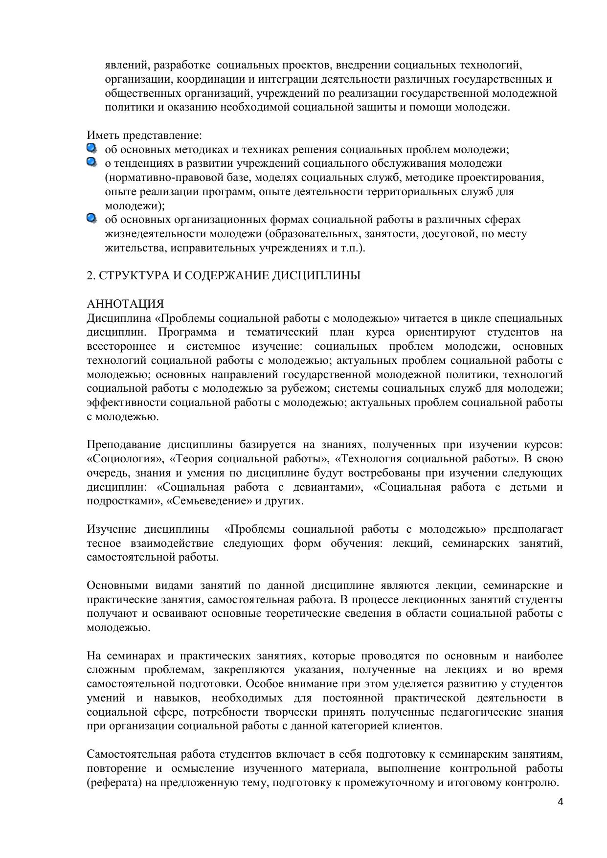 Электронный курс разработан на основании Государственного образовательного стандарта высшего профессионального образования по специальности 040101 – «Социальная работа» и рабочей программы по дисциплине «Проблемы социальной работы с молодежью». Учебное пособие дает систематизированное представление о содержании и основных направлениях социальной работы с молодежью. Излагаются основные понятия социальной работы с подрастающим поколением, технологии и методы, специфика работы с различными категориями молодежи. Содержит рабочую учебную программу дисциплины, общие методические рекомендации по изучению дисциплины, порядок проведения контроля качества подготовки студентов. Курс предназначен для студентов всех форм обучения, изучающих дисциплину «Проблемы социальной работы с молодежью».