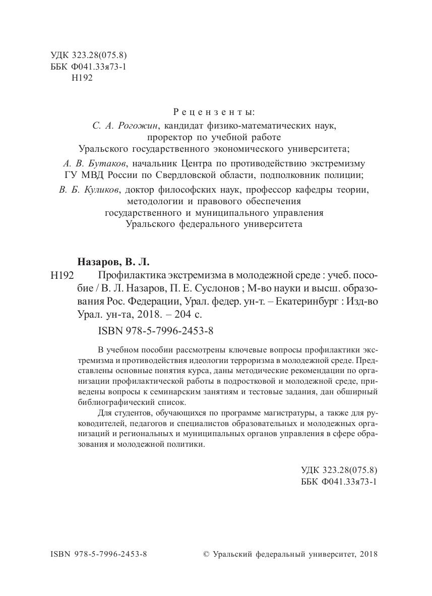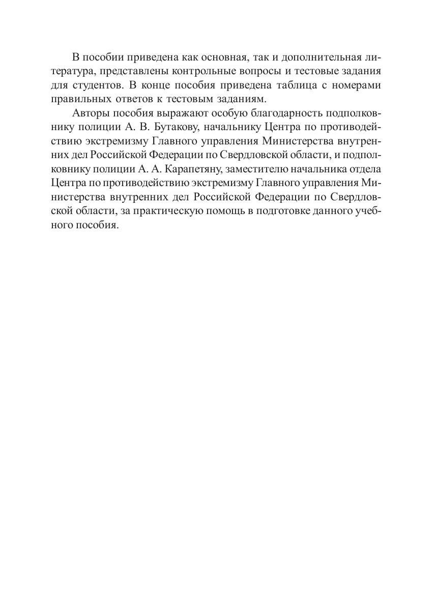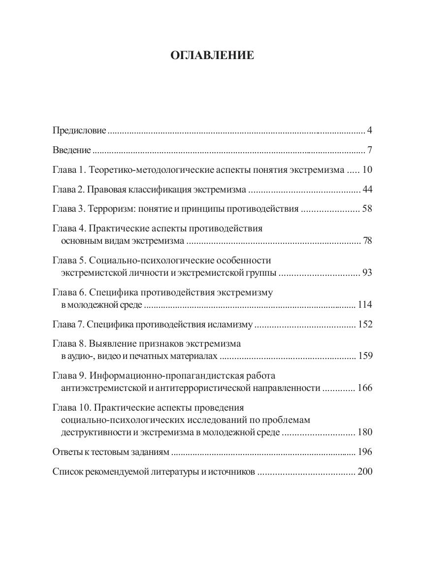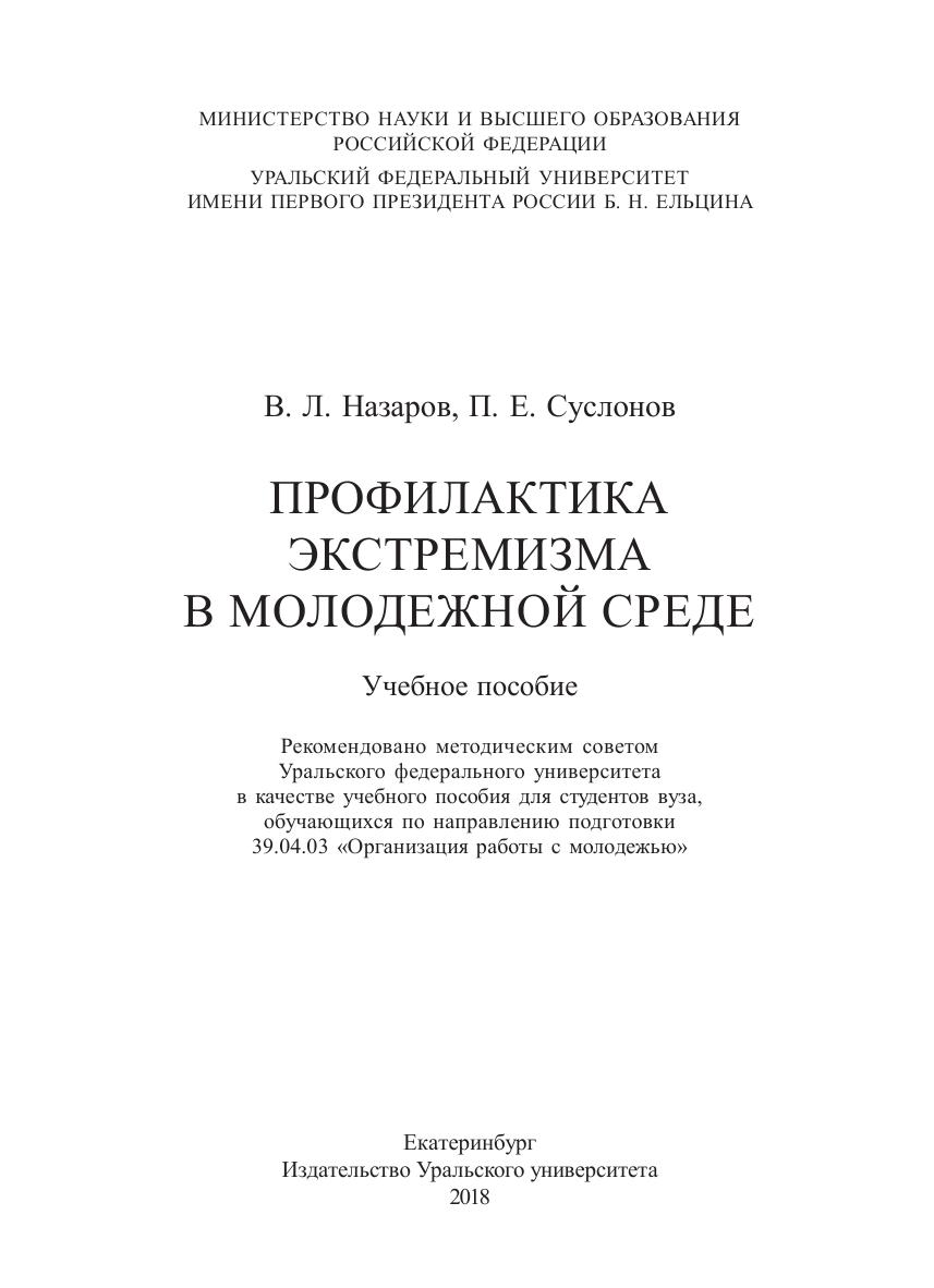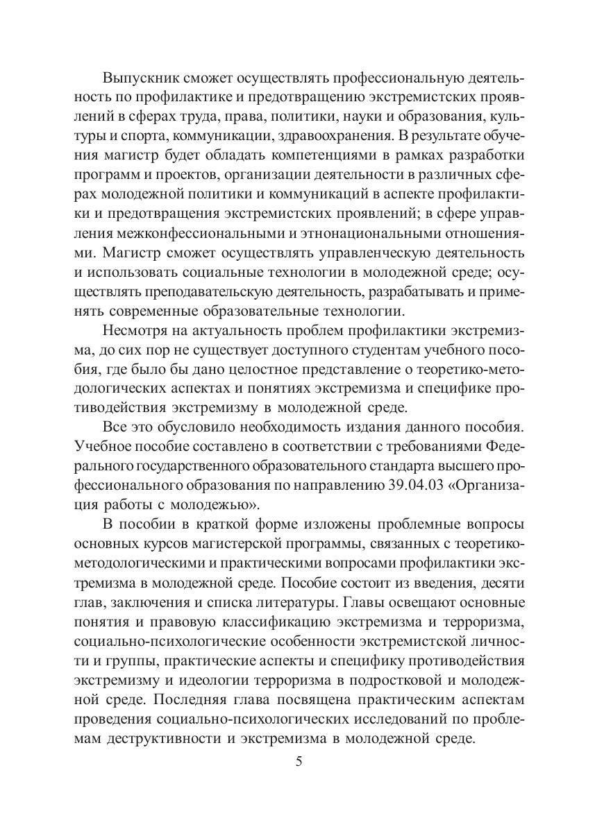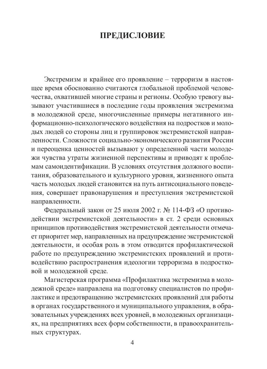 В учебном пособии рассмотрены ключевые вопросы профилактики экстремизма и противодействия идеологии терроризма в молодежной среде. Представлены основные понятия курса, даны методические рекомендации по организации профилактической работы в подростковой и молодежной среде, приведены вопросы к семинарским занятиям и тестовые задания, дан обширный библиографический список. Для студентов, обучающихся по программе магистратуры, а также для руководителей, педагогов и специалистов образовательных и молодежных организаций и региональных и муниципальных органов управления в сфере образования и молодежной политики.