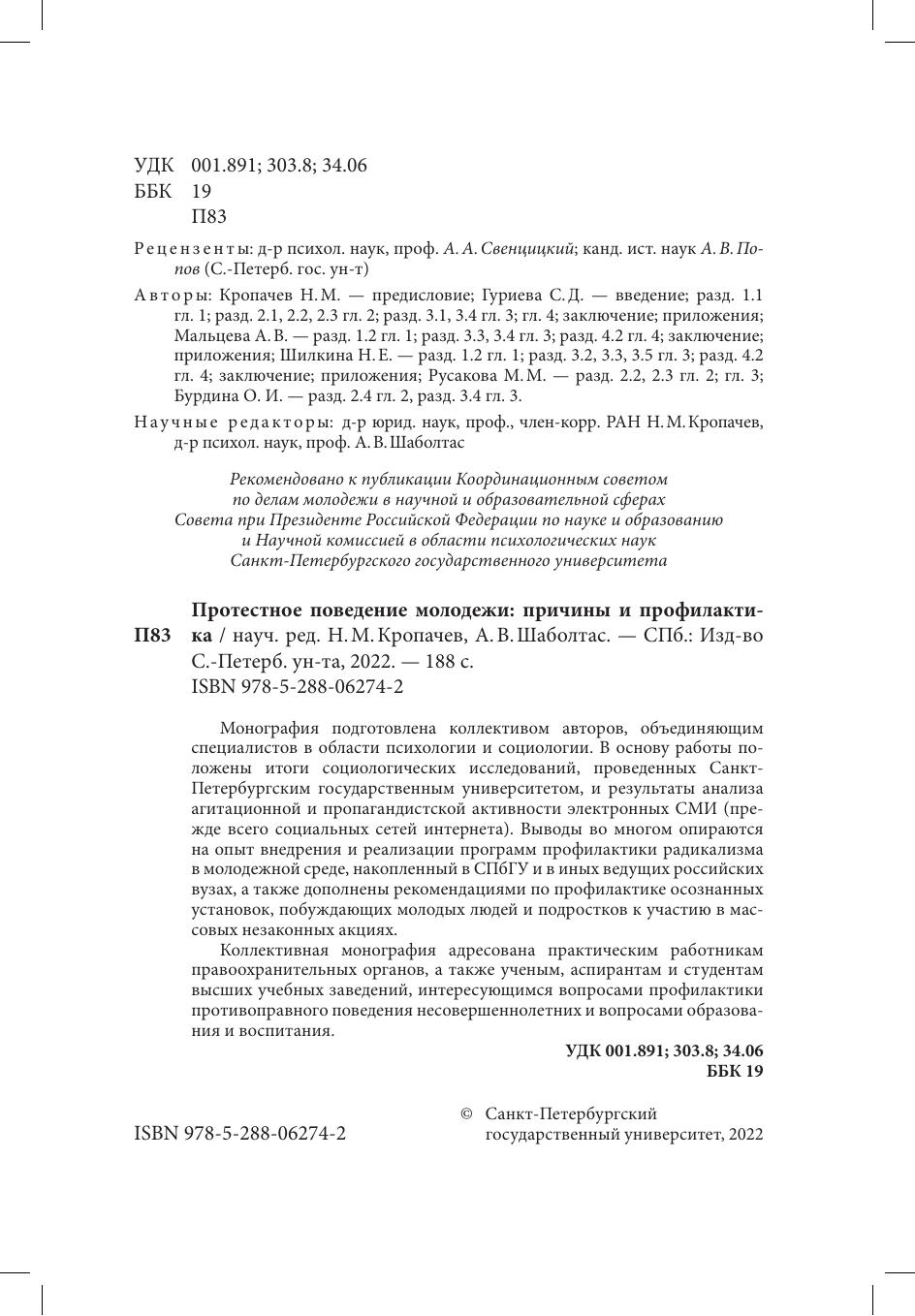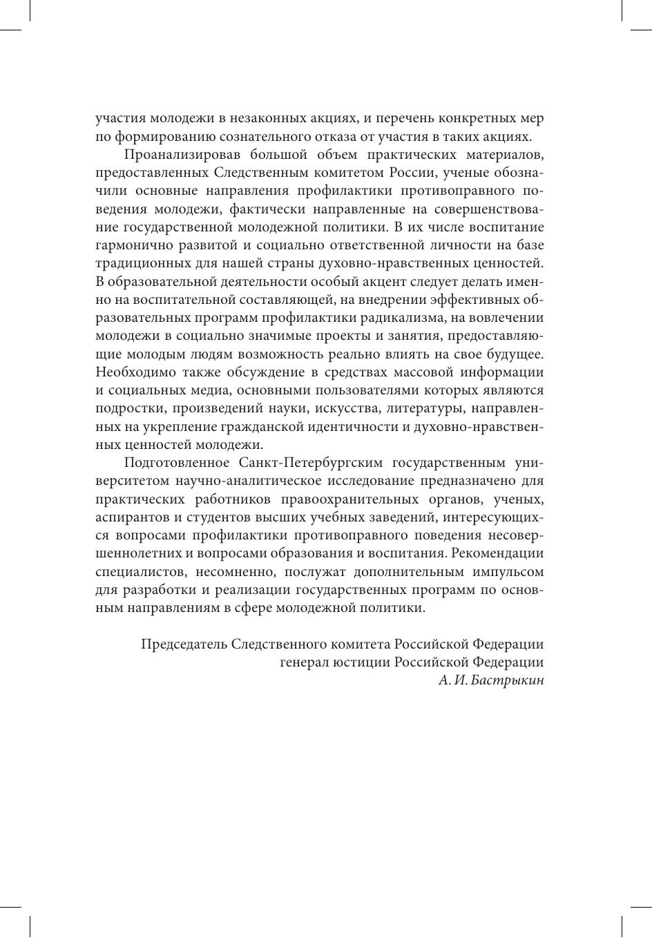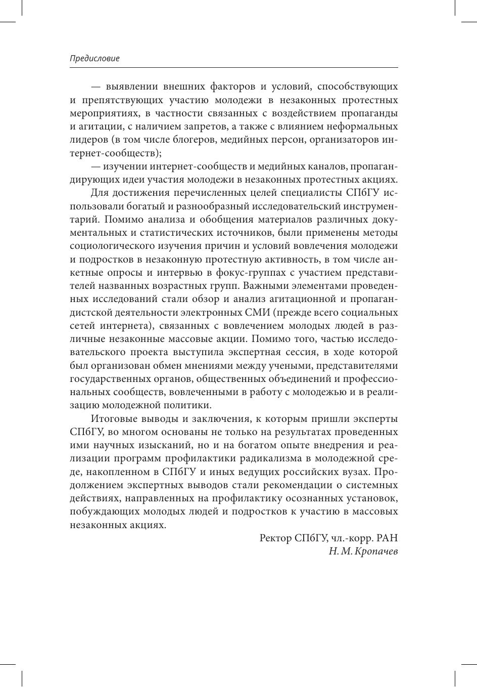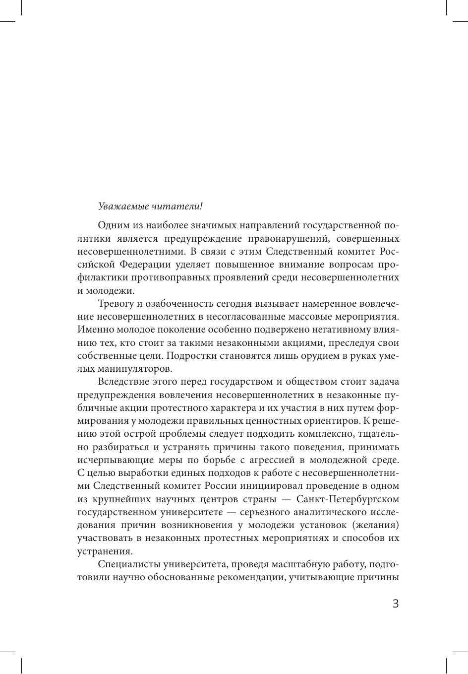 Монография подготовлена коллективом авторов, объединяющим специалистов в области психологии и социологии. В основу работы положены итоги социологических исследований, проведенных Санкт-Петербургским государственным университетом, и результаты анализа агитационной и пропагандистской активности электронных СМИ (прежде всего социальных сетей интернета). Выводы во многом опираются на опыт внедрения и реализации программ профилактики радикализма в молодежной среде, накопленный в СПбГУ и в иных ведущих российских вузах, а также дополнены рекомендациями по профилактике осознанных установок, побуждающих молодых людей и подростков к участию в массовых незаконных акциях. Коллективная монография адресована практическим работникам правоохранительных органов, а также ученым, аспирантам и студентам высших учебных заведений, интересующимся вопросами профилактики противоправного поведения несовершеннолетних и вопросами образования и воспитания.