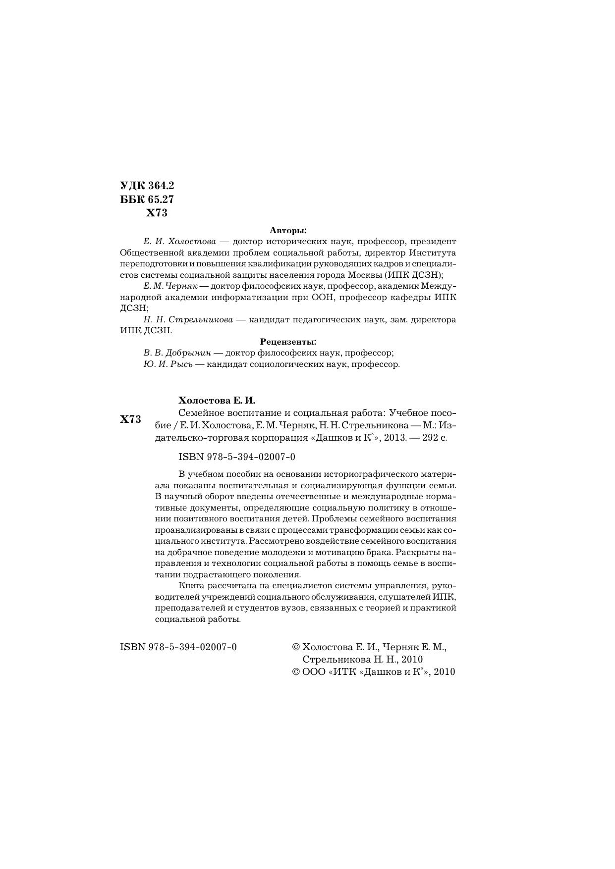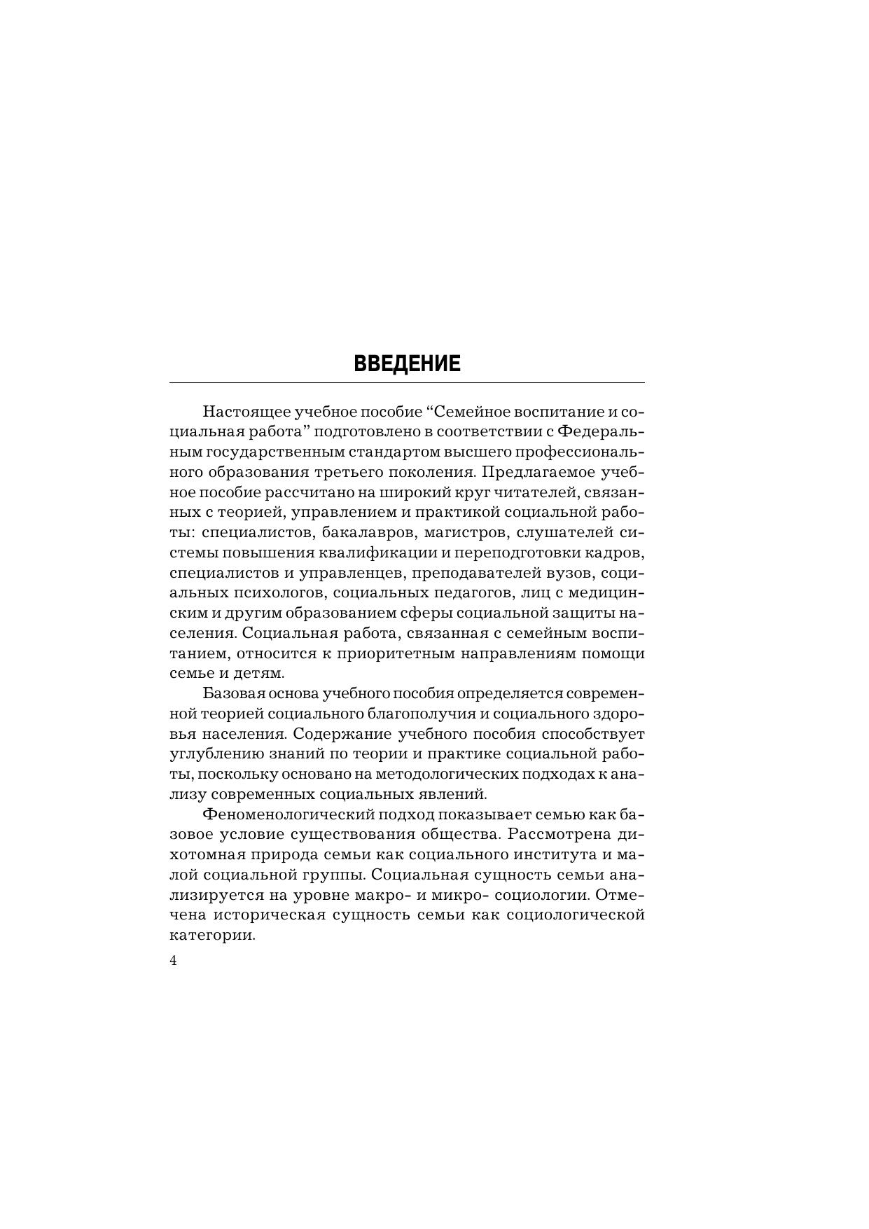В учебном пособии на основании историографического материала показаны воспитательная и социализирующая функции семьи. В научный оборот введены отечественные и международные нормативные документы, определяющие социальную политику в отношении позитивного воспитания детей. Проблемы семейного воспитания проанализированы в связи с процессами трансформации семьи как социального института. Рассмотрено воздействие семейного воспитания на добрачное поведение молодежи и мотивацию брака. Раскрыты направления и технологии социальной работы в помощь семье в воспитании подрастающего поколения. Книга рассчитана на специалистов системы управления, руководителей учреждений социального обслуживания, слушателей ИПК, преподавателей и студентов вузов, связанных с теорией и практикой социальной работы.