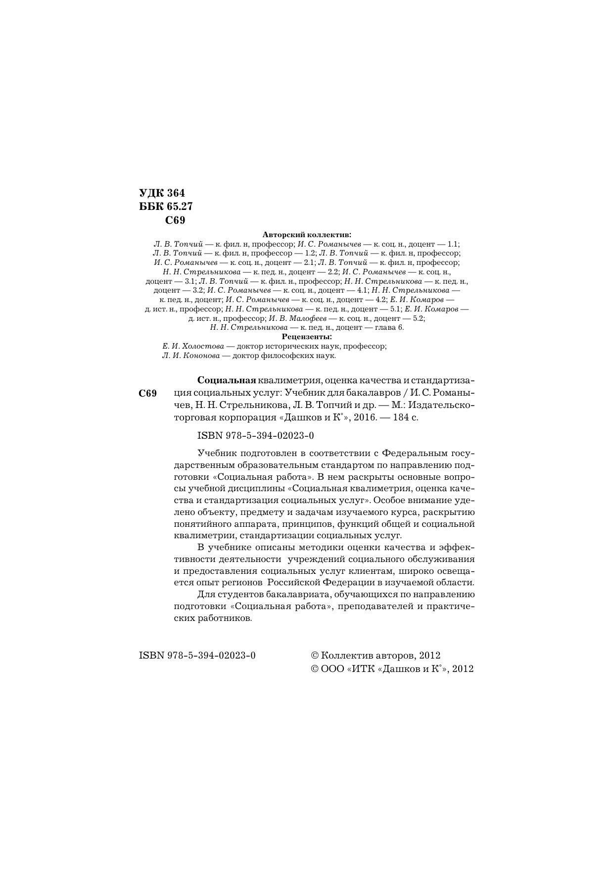 Учебник подготовлен в соответствии с ФГОС по направлению подготовки "Социальная работа". В нем раскрыты основные вопросы учебной дисциплины "Социальная квалиметрия, оценка качества и стандартизация социальных услуг". Особое внимание уделено объекту, предмету и задачам изучаемого курса, раскрытию понятийного аппарата, принципов, функций общей и социальной квалиметрии, стандартизации социальных услуг.