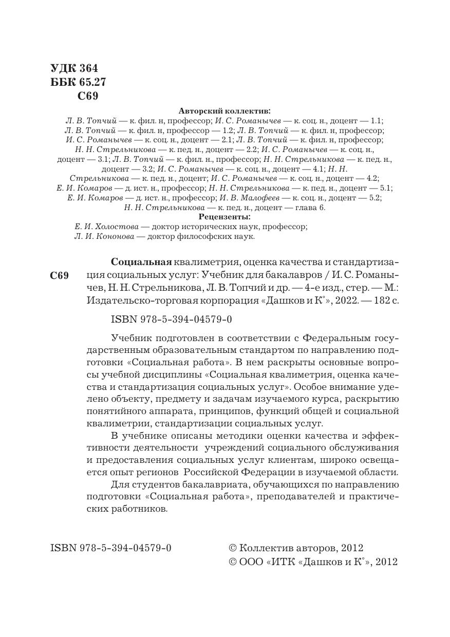 Учебник подготовлен в соответствии с ФГОС по направлению подготовки "Социальная работа". В нем раскрыты основные вопросы учебной дисциплины "Социальная квалиметрия, оценка качества и стандартизация социальных услуг". Особое внимание уделено объекту, предмету и задачам изучаемого курса, раскрытию понятийного аппарата, принципов, функций общей и социальной квалиметрии, стандартизации социальных услуг. В учебнике описаны методики оценки качества и эффективности деятельности учреждений социального обслуживания и предоставления социальных услуг клиентам, широко освещается опыт регионов Российской Федерации в изучаемой области. Для студентов бакалавриата, обучающихся по направлению подготовки "Социальная работа", преподавателей и практических работников.
