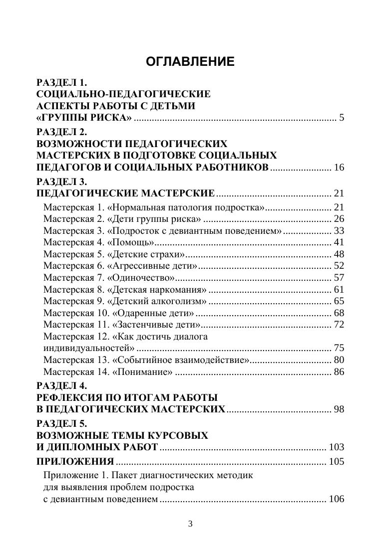 Учебное пособие создано с целью профессиональной подготовки студентов, готовящих себя к деятельности социальных педагогов и работников социальной службы. Проблемы, волнующие их в работе с детьми «группы риска», отразились в названиях мастерских. Эти мастерские могут быть использованы двояко: как средство обогащения и развития профессионального мышления студентов и как рабочие материалы для организации взаимодействия социальных работников и педагогов с людьми, от которых так или иначе зависит решение проблем детей «группы риска»: родителями, психологами, учителями. Кроме того, мастерские могут быть использованы при работе с детьми «группы риска», а при определенной доработке могут включаться учителями в работу с учащимися — старшими подростками. Пособие предназначается для студентов вузов таких направлений подготовки, как «Социальная работа», «Организация работы с молодежью», «Педагогическое образование», «Психолого-педагогическое образование», а также для студентов, избравших обучение по специальности «Педагогика и психология девиантного поведения».