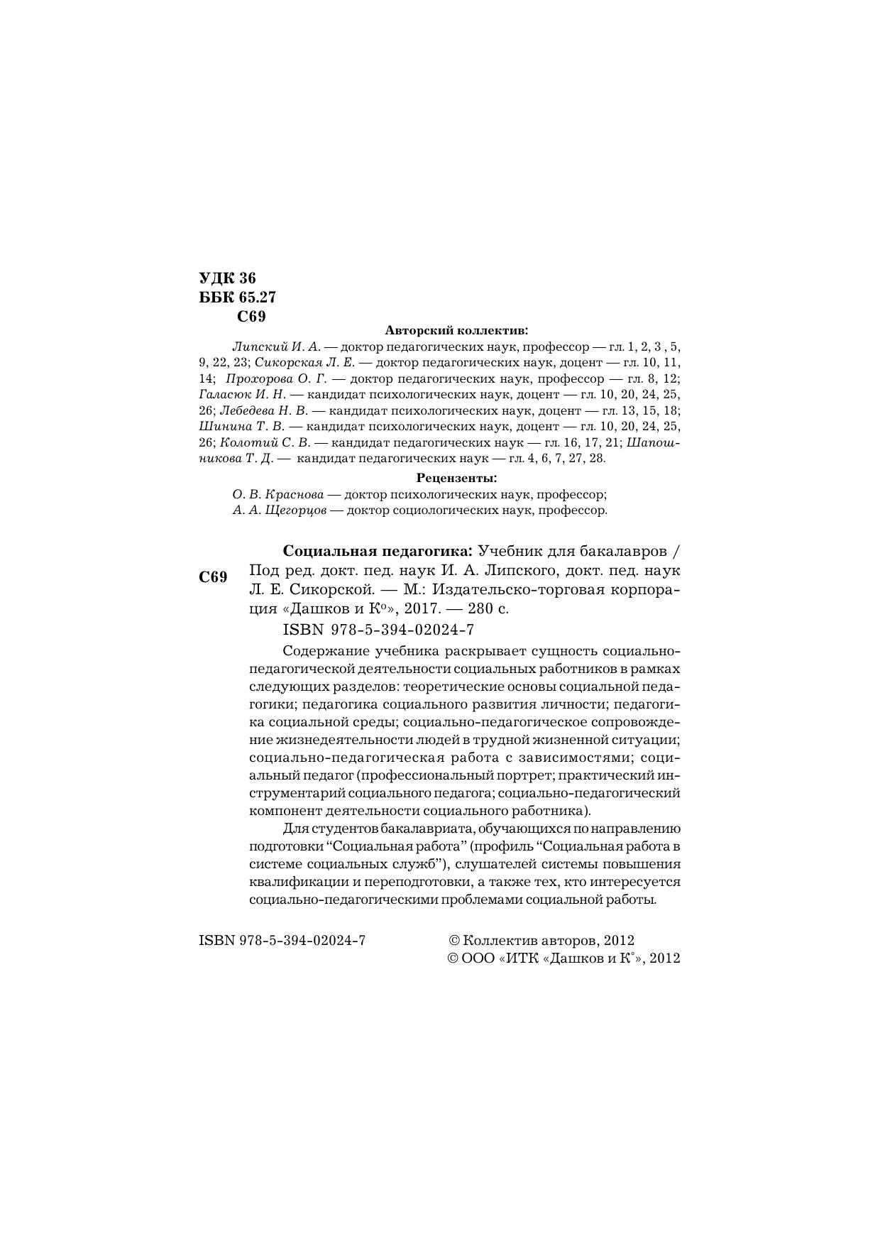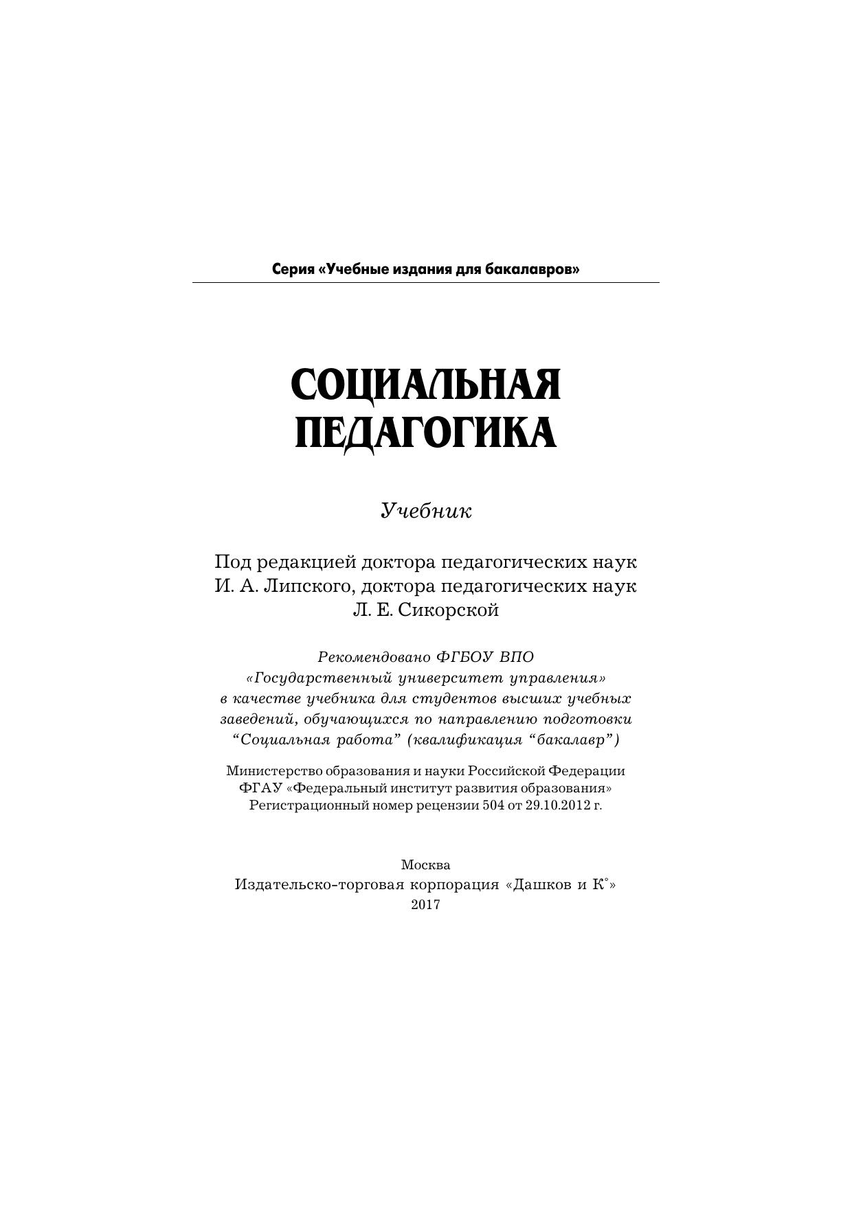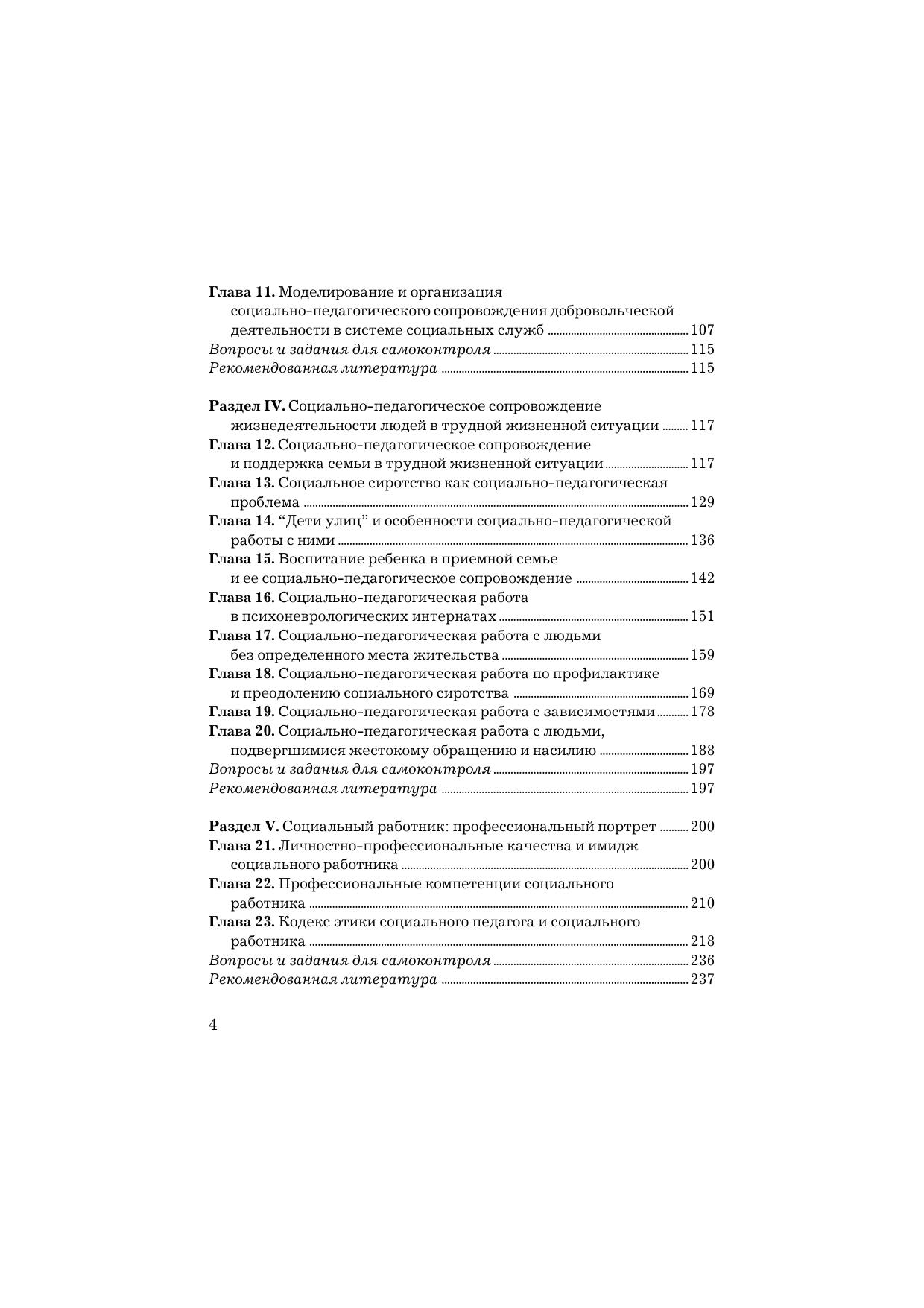 Содержание учебника раскрывает сущность социально-педагогической деятельности социальных работников в рамках следующих разделов: теоретические основы социальной педагогики; педагогика социального развития личности; педагогика социальной среды; социально-педагогическое сопровождение жизнедеятельности людей в трудной жизненной ситуации; социально-педагогическая работа с зависимостями; социальный педагог (профессиональный портрет; практический инструментарий социального педагога; социально-педагогический компонент деятельности социального работника). Для студентов бакалавриата, обучающихся по направлению подготовки “Социальная работа” (профиль “Социальная работа в