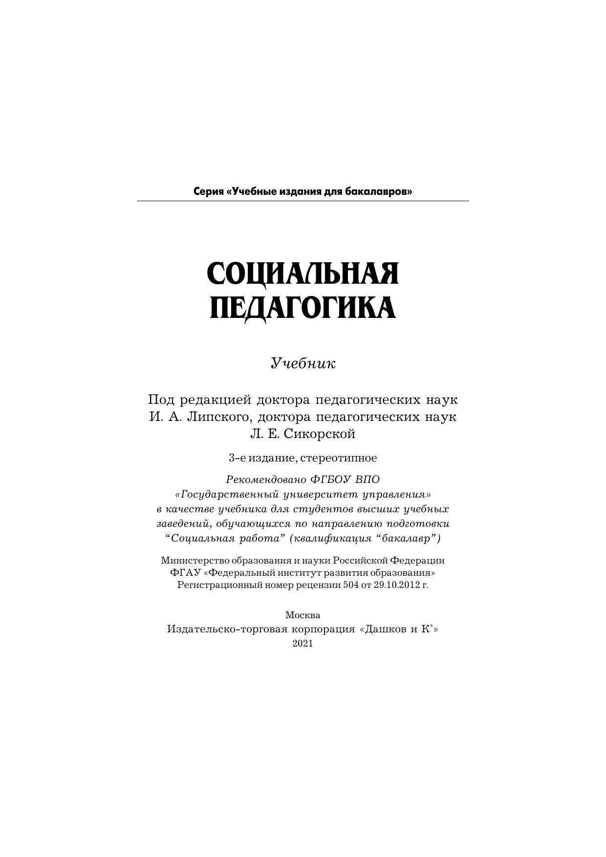 Содержание учебника раскрывает сущность социально-педагогической деятельности социальных работников в рамках следующих разделов: теоретические основы социальной педагогики, педагогика социального развития личности, педагогика социальной среды, социально-педагогическое сопровождение жизнедеятельности людей в трудной жизненной ситуации, социально-педагогическая работа с зависимостями, социальный педагог (профессиональный портрет, практический инструментарий социального педагога, социально-педагогический компонент деятельности социального работника). Для студентов бакалавриата, обучающихся по направлению подготовки “Социальная работа” (профиль “Социальная работа в системе социальных служб”), слушателей системы повышения квалификации и переподготовки, а также тех, кто интересуется социально-педагогическими проблемами социальной работы.