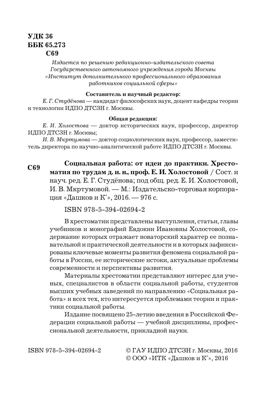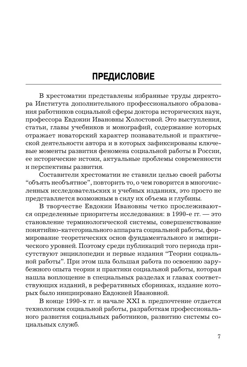 В хрестоматии представлены выступления, статьи, главы учебников и монографий Евдокии Ивановны Холостовой, содержание которых отражает новаторский характер ее познавательной и практической деятельности и в которых зафиксированы ключевые моменты развития феномена социальной работы в России, ее исторические истоки, актуальные проблемы современности и перспективы развития. Материалы хрестоматии представляют интерес для ученых, специалистов в области социальной работы, студентов высших учебных заведений по направлению «Социальная работа» и всех тех, кто интересуется проблемами теории и практики социальной работы. Издание посвящено 25-летию введения в Российской Федерации социальной работы — учебной дисциплины, профессиональной деятельности, прикладной науки.