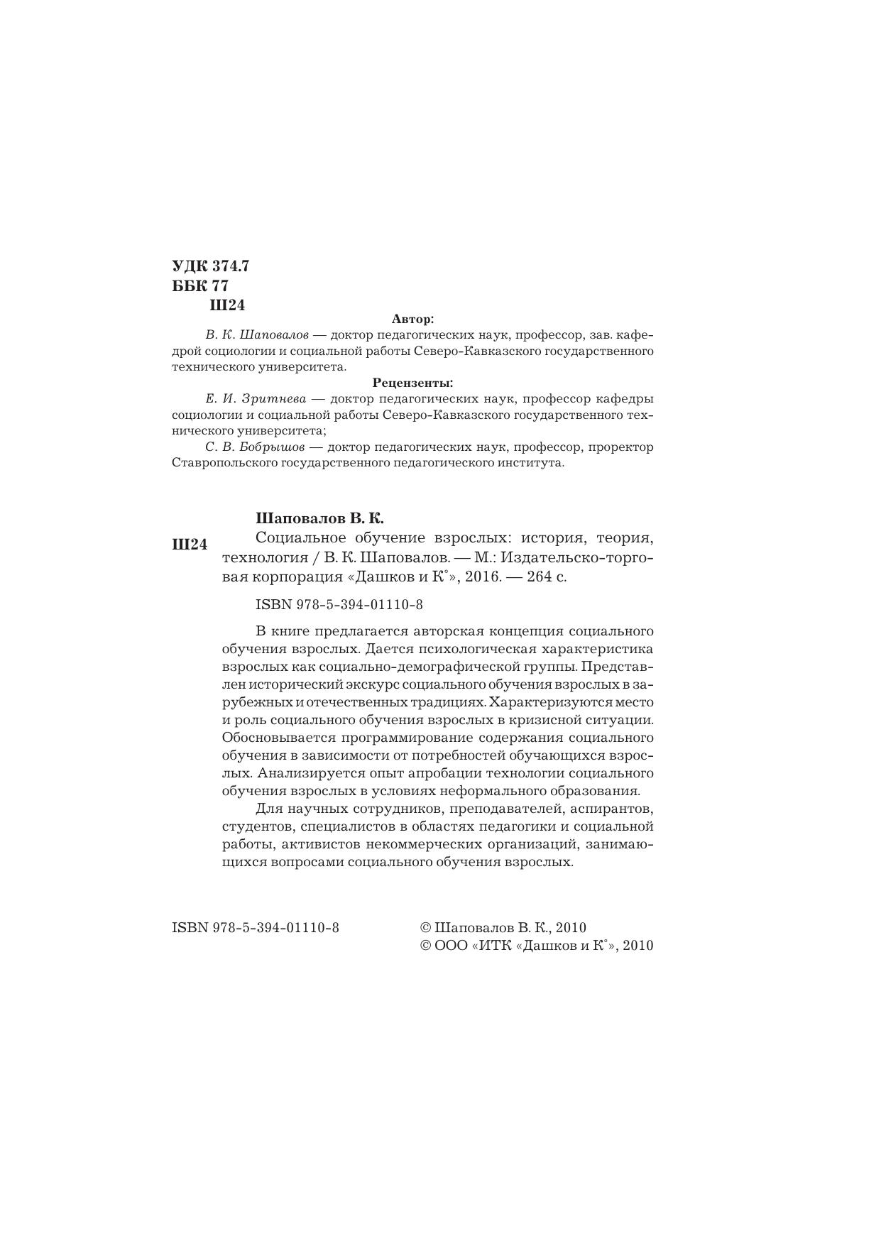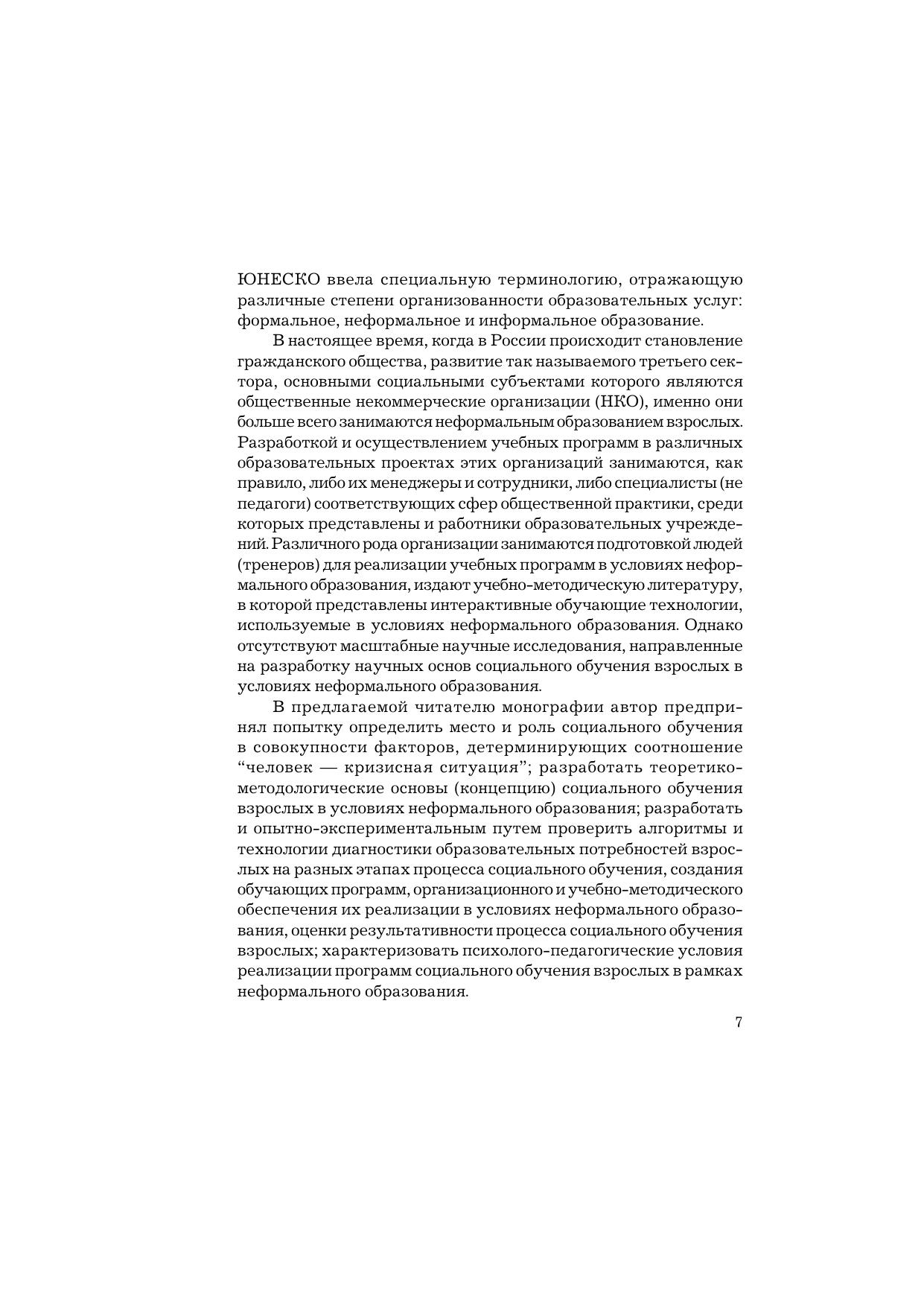 В книге предлагается авторская концепция социального обучения взрослых. Дается психологическая характеристика взрослых как социально-демографической группы. Представлен исторический экскурс социального обучения взрослых в зарубежных и отечественных традициях. Характеризуются место и роль социального обучения взрослых в кризисной ситуации. Обосновывается программирование содержания социального обучения в зависимости от потребностей обучающихся взрослых. Анализируется опыт апробации технологии социального обучения взрослых в условиях неформального образования.