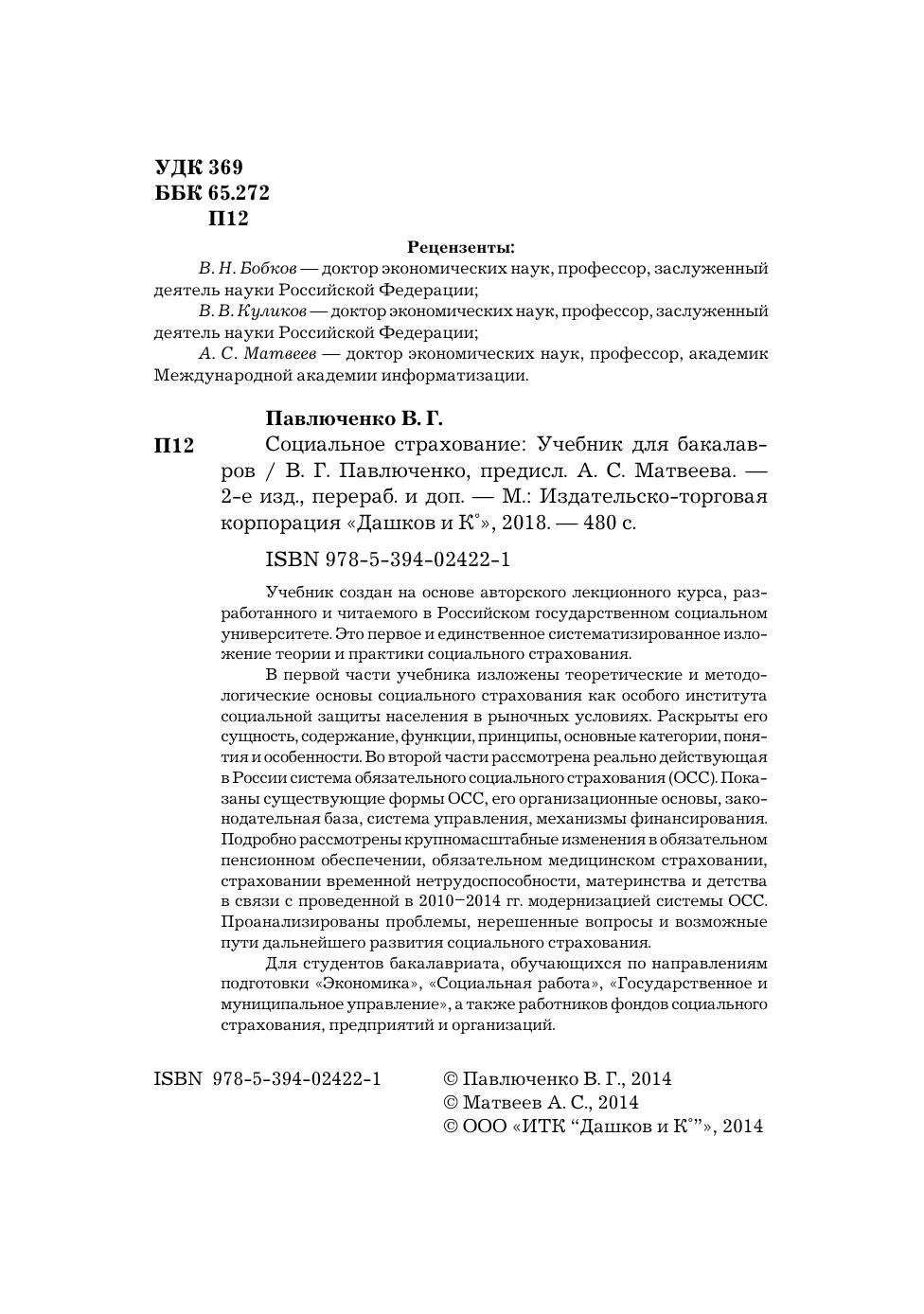 Учебник создан на основе авторского лекционного курса, разработанного и читаемого в Российском государственном социальном университете. Это первое и единственное систематизированное изложение теории и практики социального страхования. В первой части учебника изложены теоретические и методологические основы социального страхования как особого института социальной защиты населения в рыночных условиях. Раскрыты его сущность, содержание, функции, принципы, основные категории, понятия и особенности. Во второй части рассмотрена реально действующая в России система обязательного социального страхования (ОСС). Показаны существующие формы ОСС, его организационные основы, законодательная база, система управления, механизмы финансирования. Подробно рассмотрены крупномасштабные изменения в обязательном пенсионном обеспечении, обязательном медицинском страховании, страховании временной нетрудоспособности, материнства и детства в связи с проведенной в 2010–2014 гг. модернизацией системы ОСС. Проанализированы проблемы, нерешенные вопросы и возможные пути дальнейшего развития социального страхования. Для студентов бакалавриата, обучающихся по направлениям подготовки «Экономика», «Социальная работа», «Государственное и муниципальное управление», а также работников фондов социального страхования, предприятий и организаций.