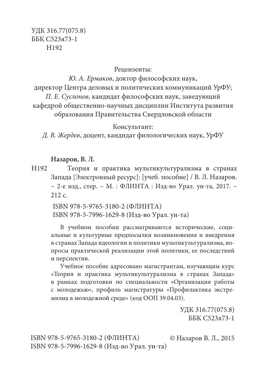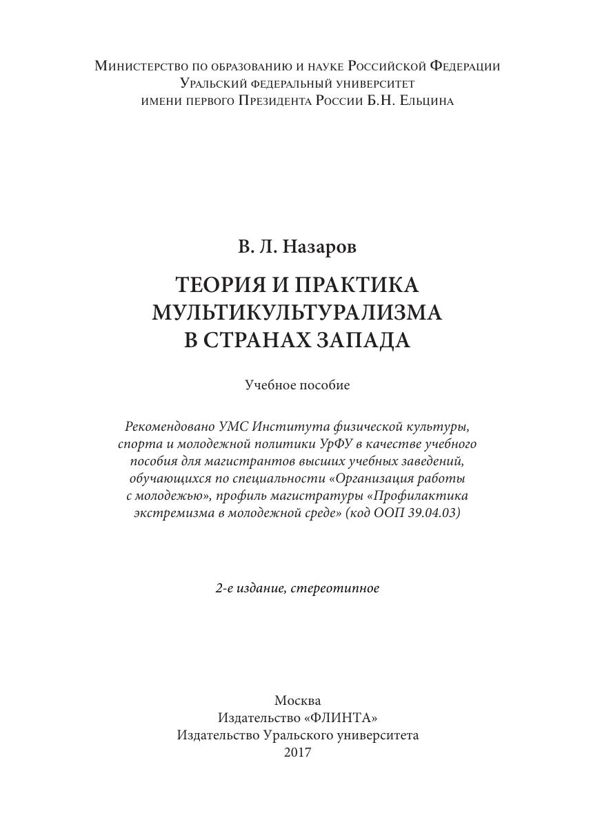 В учебном пособии рассматриваются исторические, социальные и культурные предпосылки возникновения и внедрения в странах Запада идеологии и политики мультикультурализма, вопросы практической реализации этой политики, ее последствий и перспектив. Учебное пособие адресовано магистрантам, изучающим курс «Теория и практика мультикультурализма в странах Запада» в рамках подготовки по специальности «Организация работы с молодежью», профиль магистратуры «Профилактика экстремизма в молодежной среде» (код ООП 39.04.03).