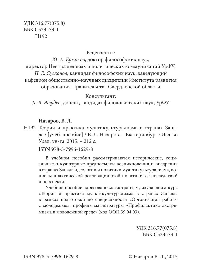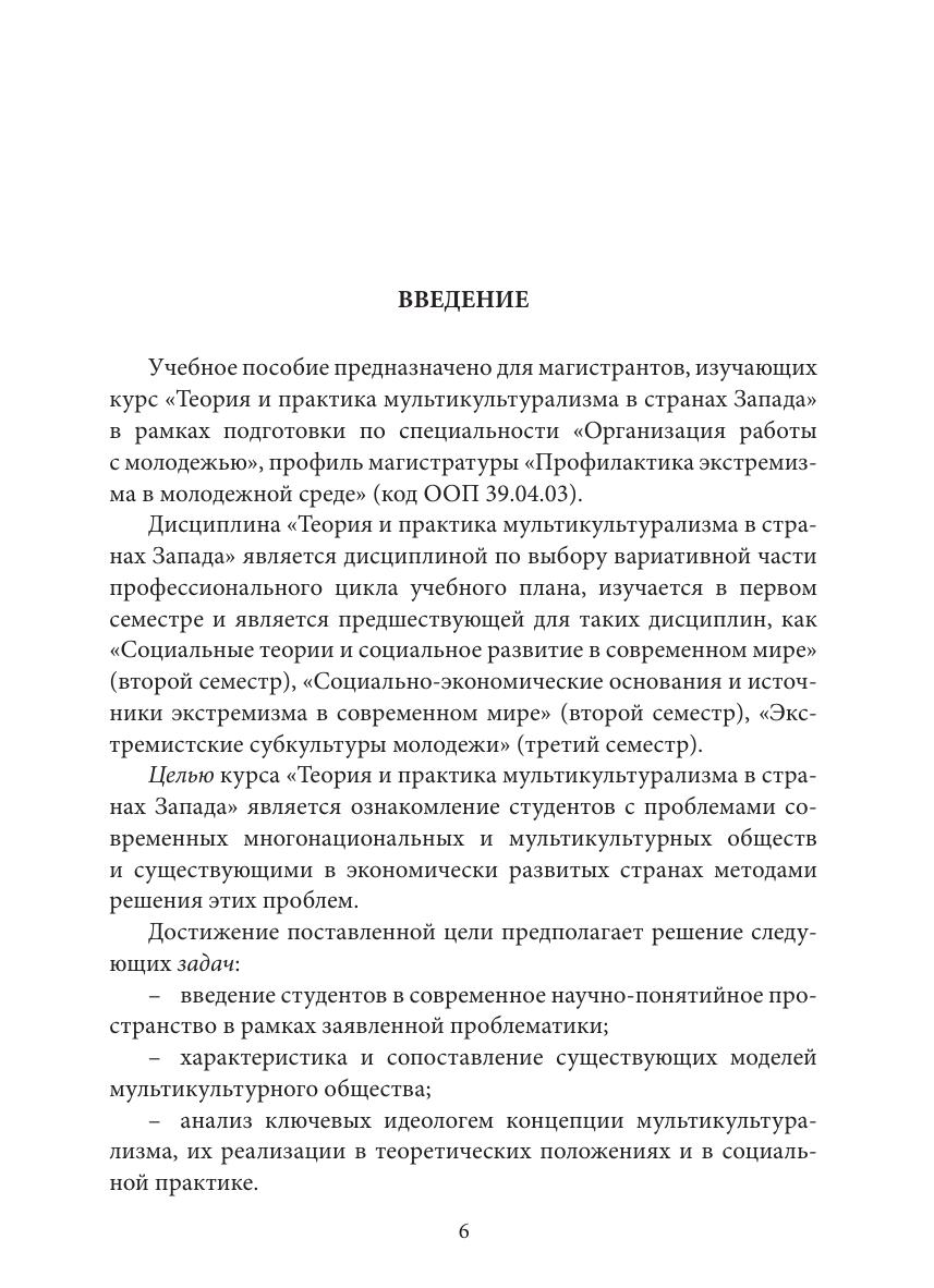 В учебном пособии рассматриваются исторические, социальные и культурные предпосылки возникновения и внедрения в странах Запада идеологии и политики мультикультурализма, вопросы практической реализации этой политики, ее последствий и перспектив. Учебное пособие адресовано магистрантам, изучающим курс «Теория и практика мультикультурализма в странах Запада» в рамках подготовки по специальности «Организация работы с молодежью», профиль магистратуры «Профилактика экстремизма в молодежной среде» (код ООП 39.04.03).