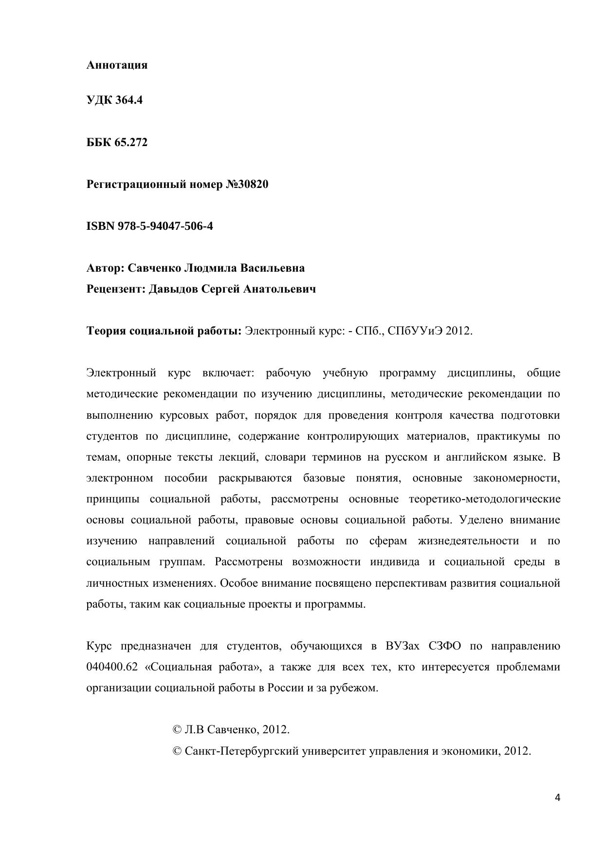 Электронный курс включает: рабочую учебную программу дисциплины, общие методические рекомендации по изучению дисциплины, методические рекомендации по выполнению курсовых работ, порядок для проведения контроля качества подготовки студентов по дисциплине, содержание контролирующих материалов, практикумы по темам, опорные тексты лекций, словари терминов на русском и английском языке. В электронном пособии раскрываются базовые понятия, основные закономерности, принципы социальной работы, рассмотрены основные теоретико-методологические основы социальной работы, правовые основы социальной работы. Уделено внимание изучению направлений социальной работы по сферам жизнедеятельности и по социальным группам. Рассмотрены возможности индивида и социальной среды в личностных изменениях. Особое внимание посвящено перспективам развития социальной работы, таким как социальные проекты и программы. Курс предназначен для студентов, обучающихся в ВУЗах СЗФО по направлению 040400.62 «Социальная работа», а также для всех тех, кто интересуется проблемами организации социальной работы в России и за рубежом.