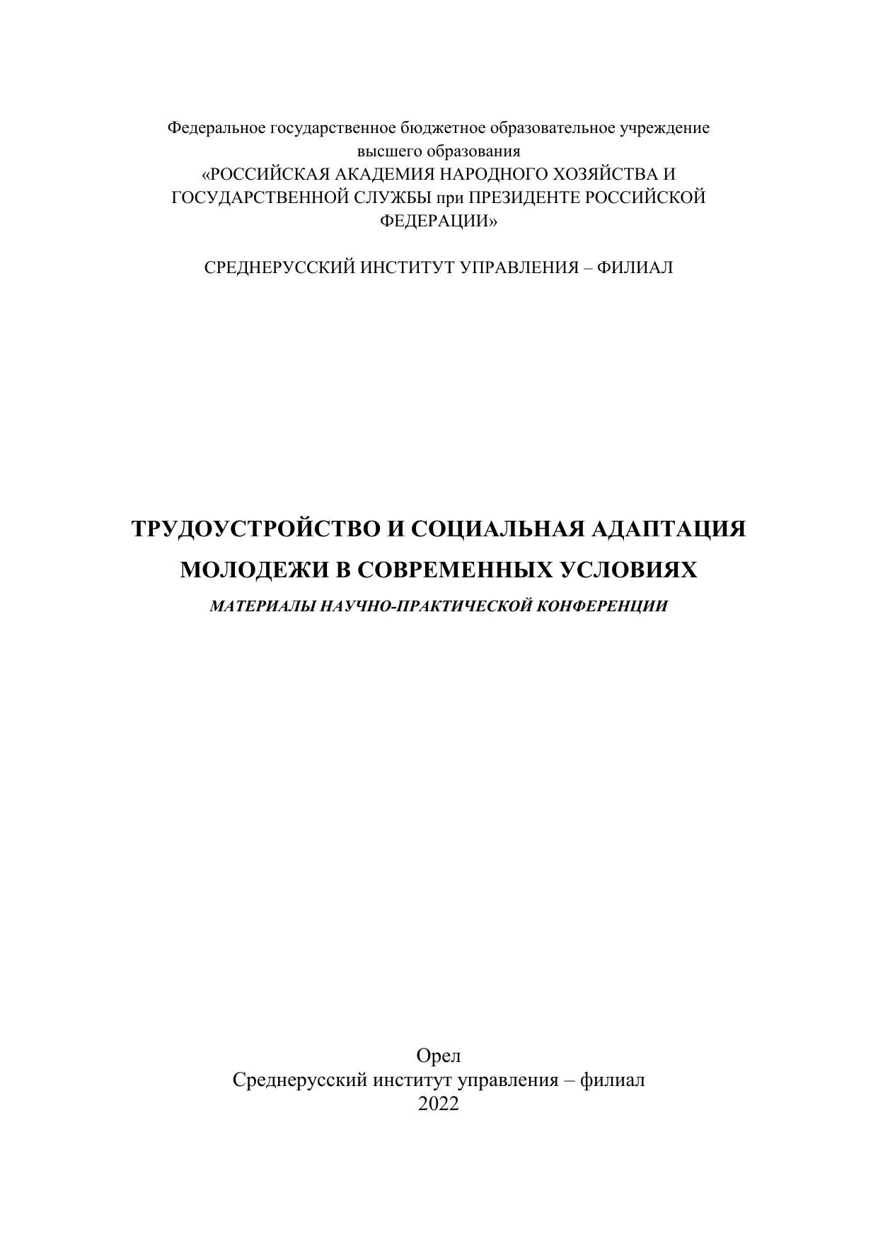 Трудоустройство и социальная адаптация молодежи в современных условиях. Материалы научно-практической конференции