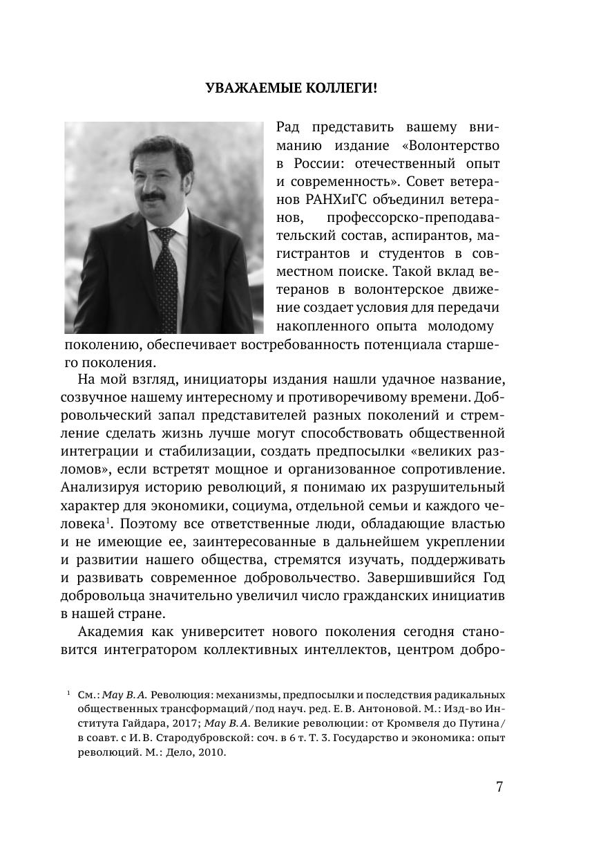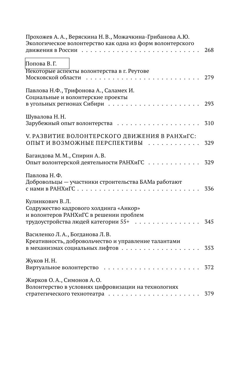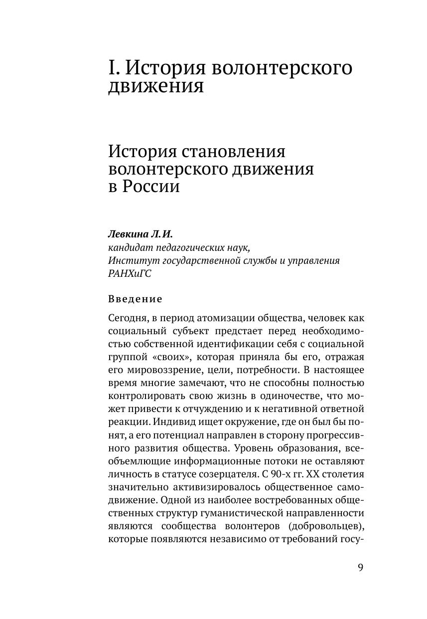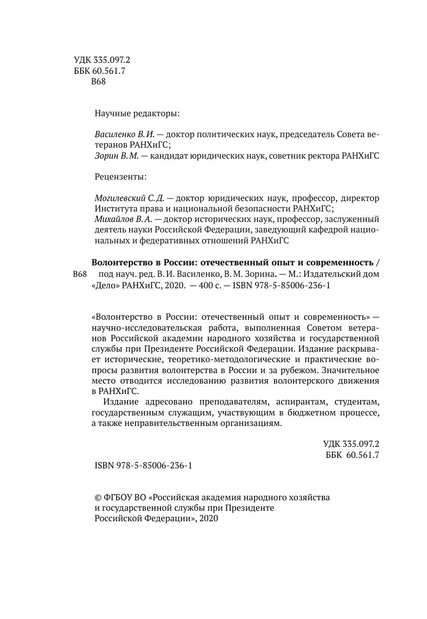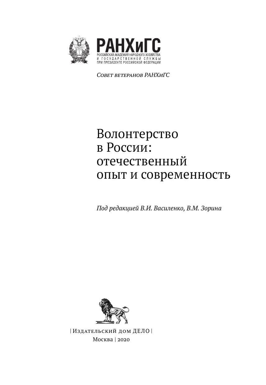 «Волонтерство в России: отечественный опыт и современность» — научно-исследовательская работа, выполненная Советом ветеранов Российской академии народного хозяйства и государственной службы при Президенте Российской Федерации. Издание раскрывает исторические, теоретико-методологические и практические вопросы развития волонтерства в России и за рубежом. Значительное место отводится исследованию развития волонтерского движения в РАНХиГС. Издание адресовано преподавателям, аспирантам, студентам, государственным служащим, участвующим в бюджетном процессе, а также неправительственным организациям.