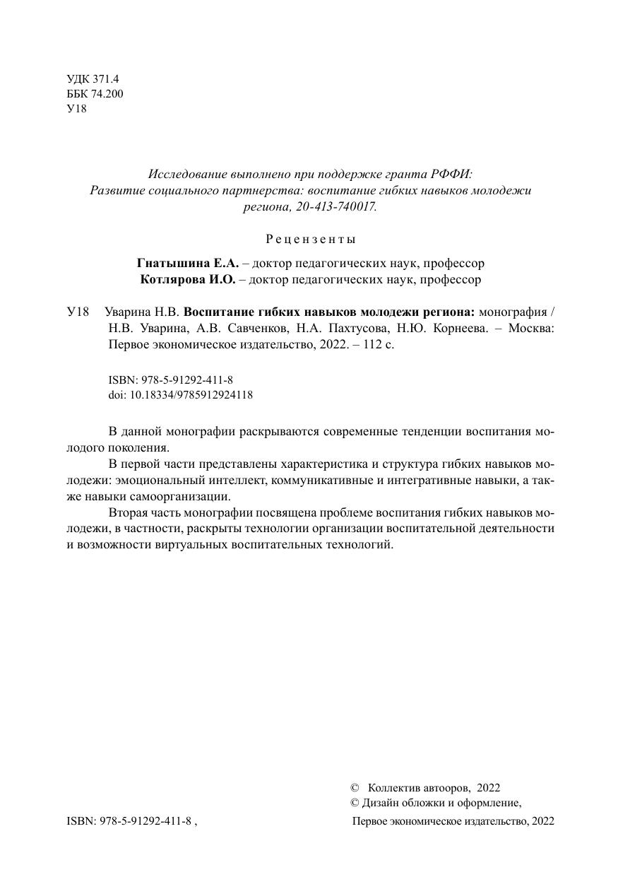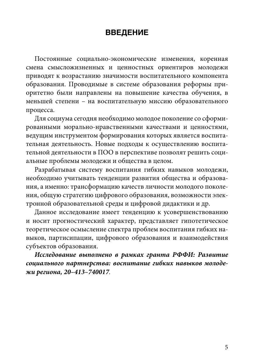 Вторая часть монографии посвящена проблеме воспитания гибких навыков молодежи, в частности, раскрыты технологии организации воспитательной деятельности и возможности виртуальных воспитательных технологий.