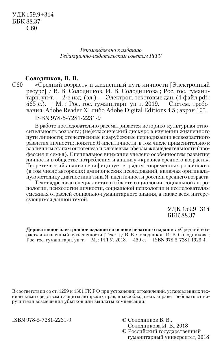 В работе последовательно рассматривается историко-культурная относительность возраста; (не)классический дискурс в изучении жизненного пути личности; отечественные и зарубежные периодизации всевозрастного развития личности; понятие Я-идентичности, в том числе применительно к различным этапам онтогенеза и ключевым сферам жизнедеятельности (профессия и семья). Специальное внимание уделено особенностям развития личности в обществе потребления и анализу «кризиса среднего возраста». Теоретический анализ верифицируется рядом современных российских (в том числе авторских) эмпирических исследований, включая оригинальную методику диагностики типа Я-идентичности россиян среднего возраста.