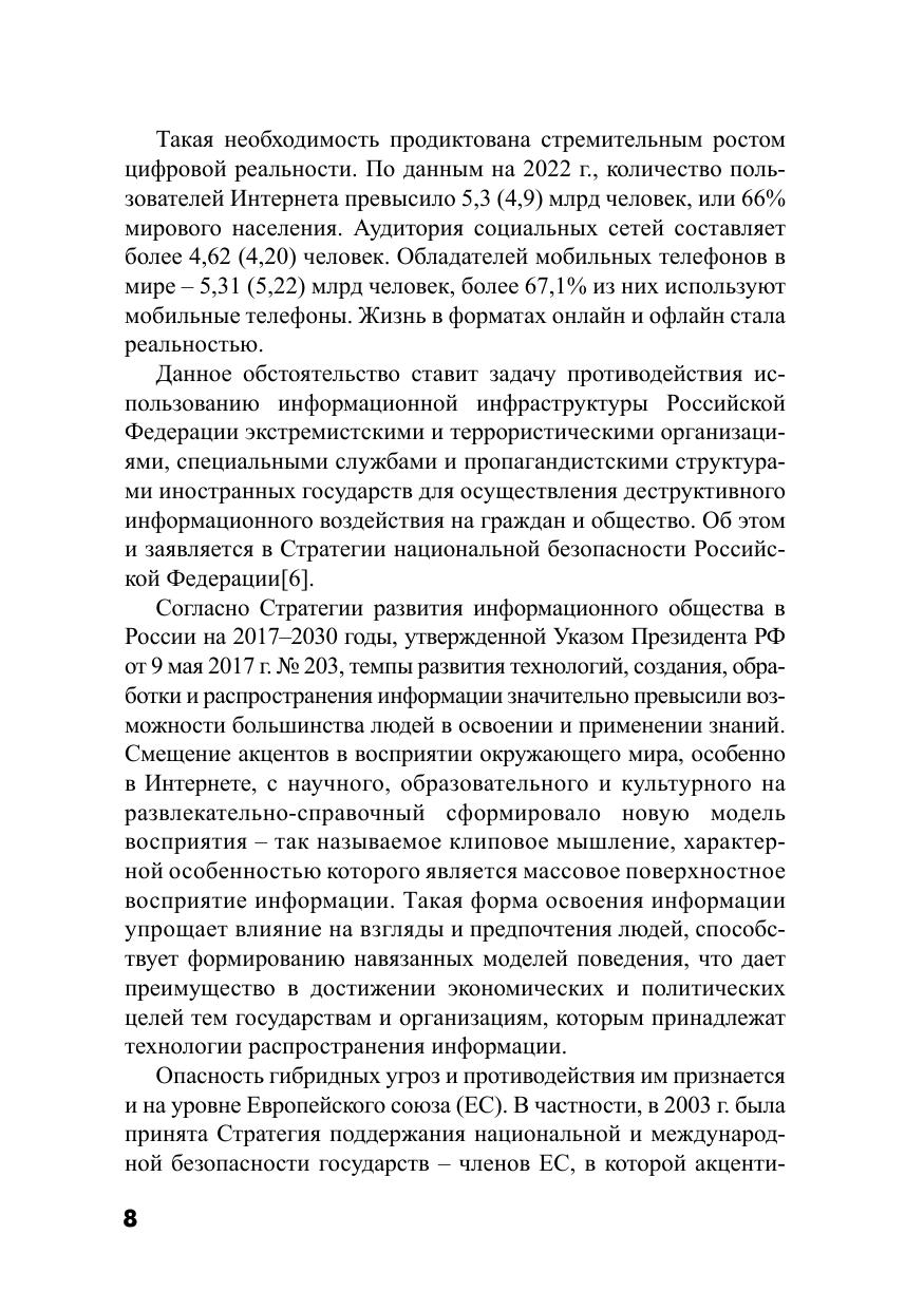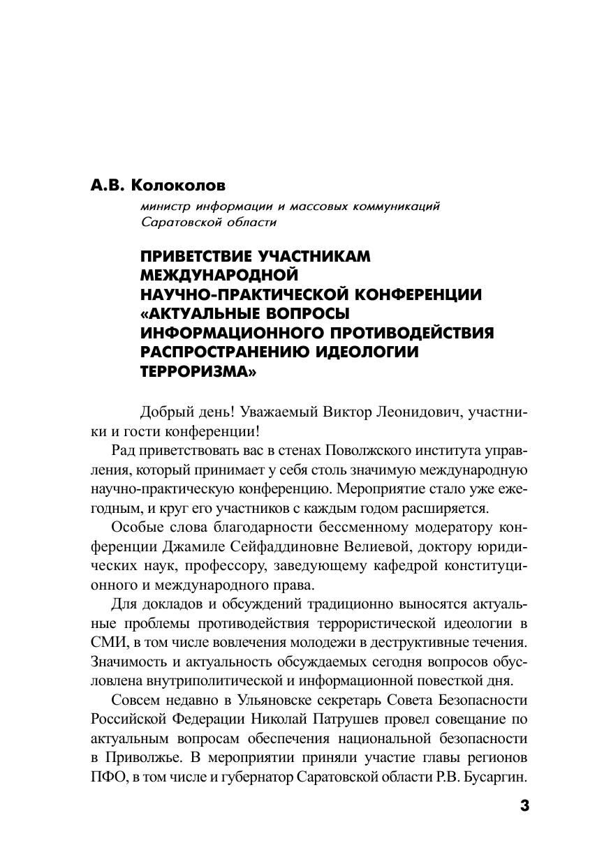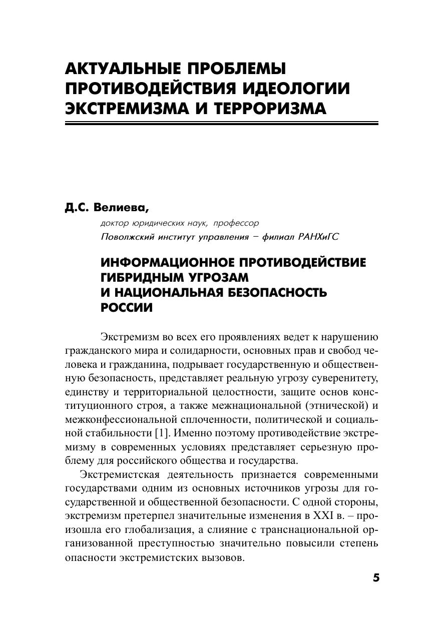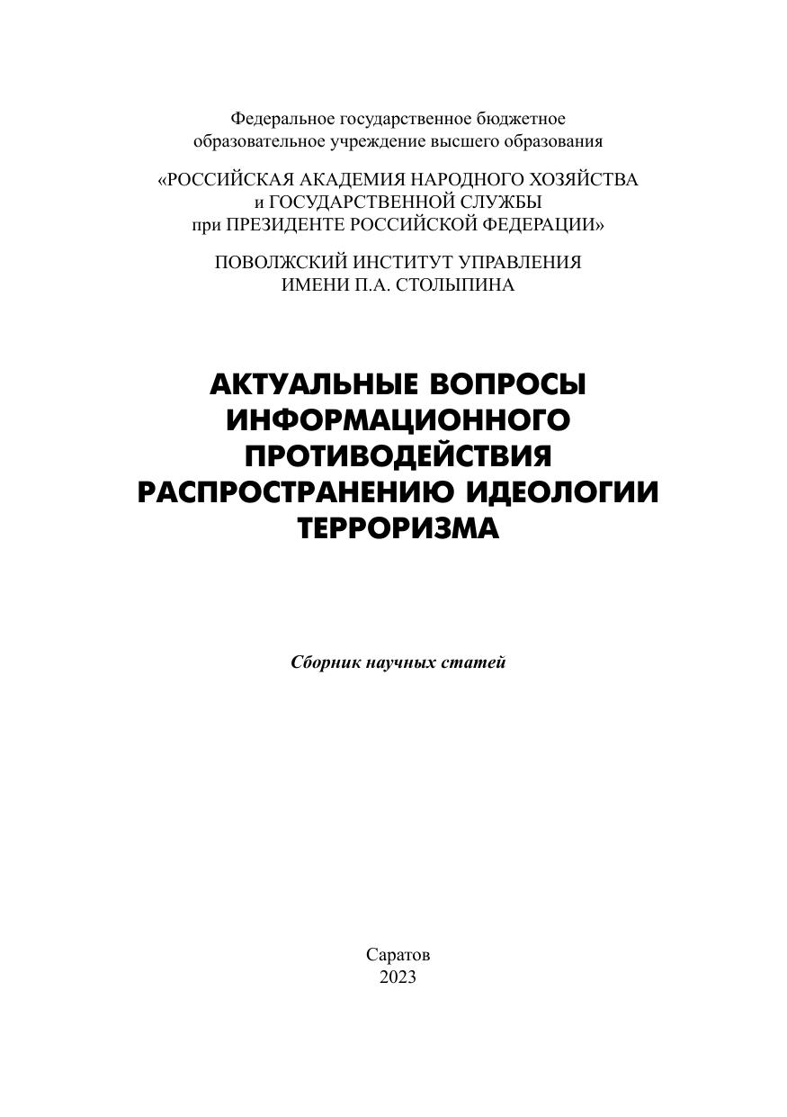 Сборник содержит статьи по материалам Международной научно-практической конференции «Актуальные вопросы информационного противодействия распространению идеологии терроризма», состоявшейся 24 марта 2023 г. в Поволжском институте управления – филиале РАНХиГС. Рассматриваются проблемы противодействия террористической идеологии в СМИ в условиях гибридных угроз; международные аспекты информационной безопасности; вопросы обеспечения информационной безопасности детей и молодежи; профилактика этнических конфликтов в образовательной среде. Для студентов, магистрантов, аспирантов вузов, а также всех интересующихся вопросами обеспечения безопасности в сфере противодействия распространению идеологии терроризма.