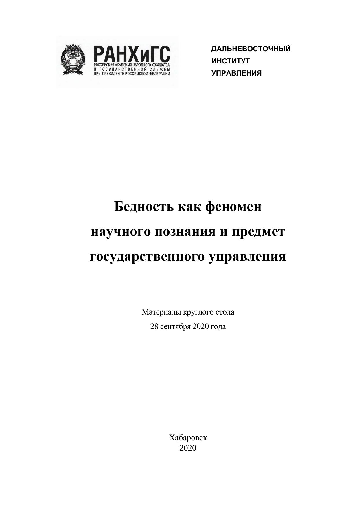 В сборнике материалов представлены доклады участников круглого стола «Бедность как феномен научного познания и предмет государственного управления», состоявшегося 28 сентября 2020 года в Дальневосточном институте управления – филиале РАНХиГС.