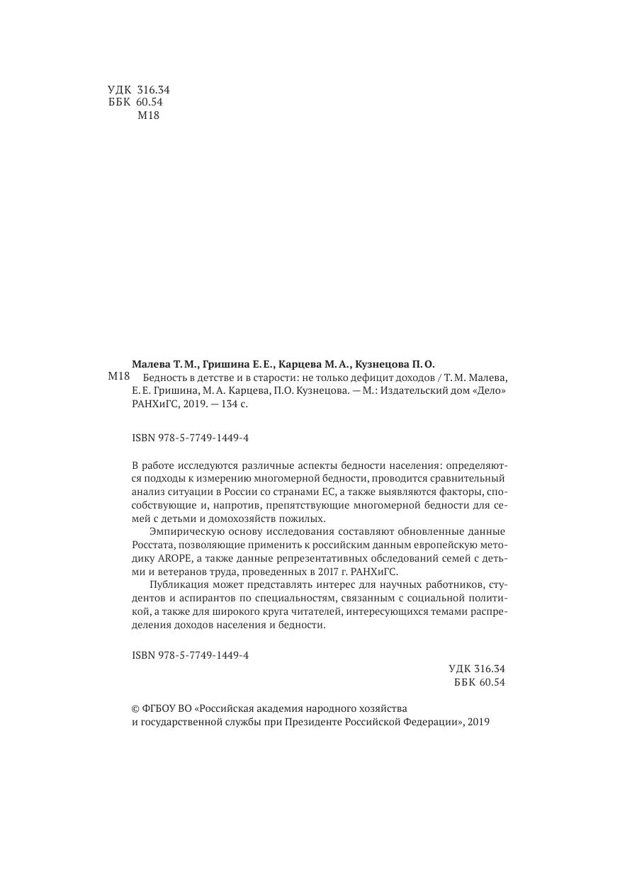 В работе исследуются различные аспекты бедности населения: определяются подходы к измерению многомерной бедности, проводится сравнительный анализ ситуации в России со странами ЕС, а также выявляются факторы, способствующие и, напротив, препятствующие многомерной бедности для семей с детьми и домохозяйств пожилых. Эмпирическую основу исследования составляют обновленные данные Росстата, позволяющие применить к российским данным европейскую методику AROPE, а также данные репрезентативных обследований семей с детьми и ветеранов труда, проведенных в 2017 г. РАНХиГС. Публикация может представлять интерес для научных работников, студентов и аспирантов по специальностям, связанным с социальной политикой, а также для широкого круга читателей, интересующихся темами распределения доходов населения и бедности.