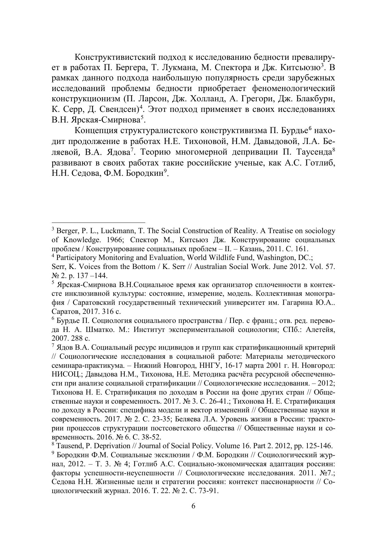 В монографии разработана социологическая концепция исследования бедных слоев населения, основанная на применении интегративного многомерного иерархического подхода, сочетающего в себе субъективные и объективные критерии бедности. Предложена методология идентификации российских бедных на региональном уровне, которая предполагает их комплексное исследование на основе материально-имущественного, социально-профессионального, самоидентификационного критериев. Результаты исследования могут быть использованы при разработке и корректировке учебно-методических материалов таких учебных дисциплин, как «Основы социологии», «Социальная стратификация», «Социальное неравенство и социальная напряженность», «Экономическая социология».