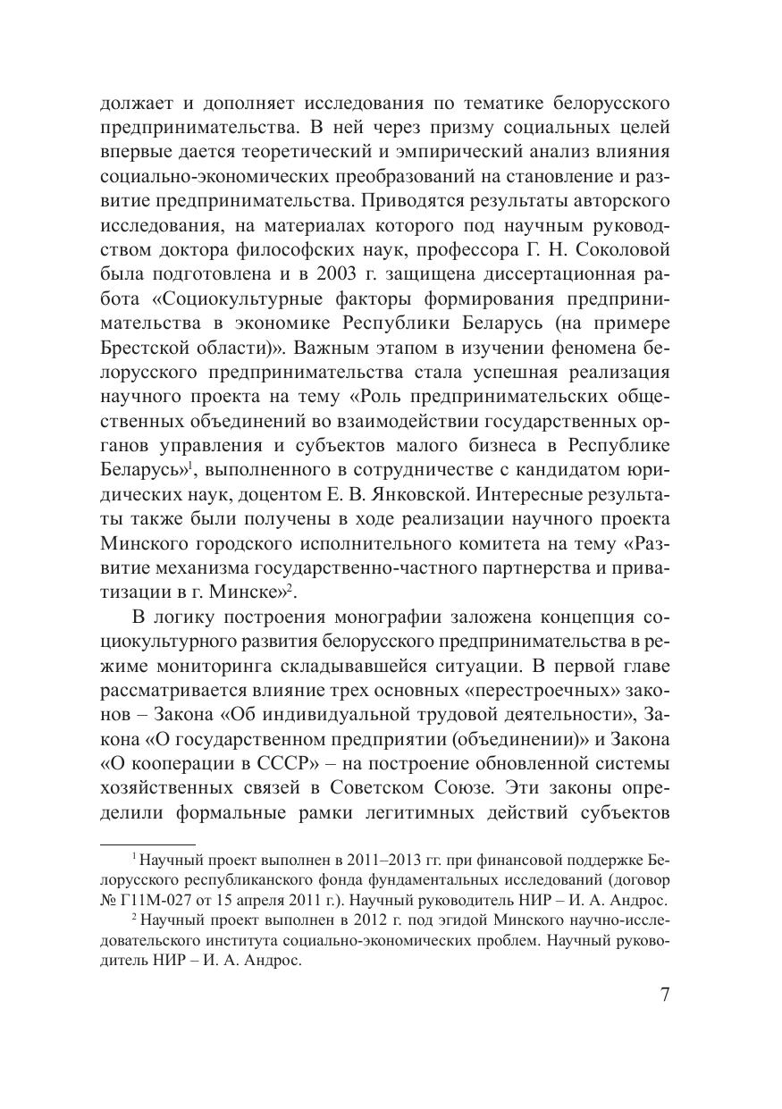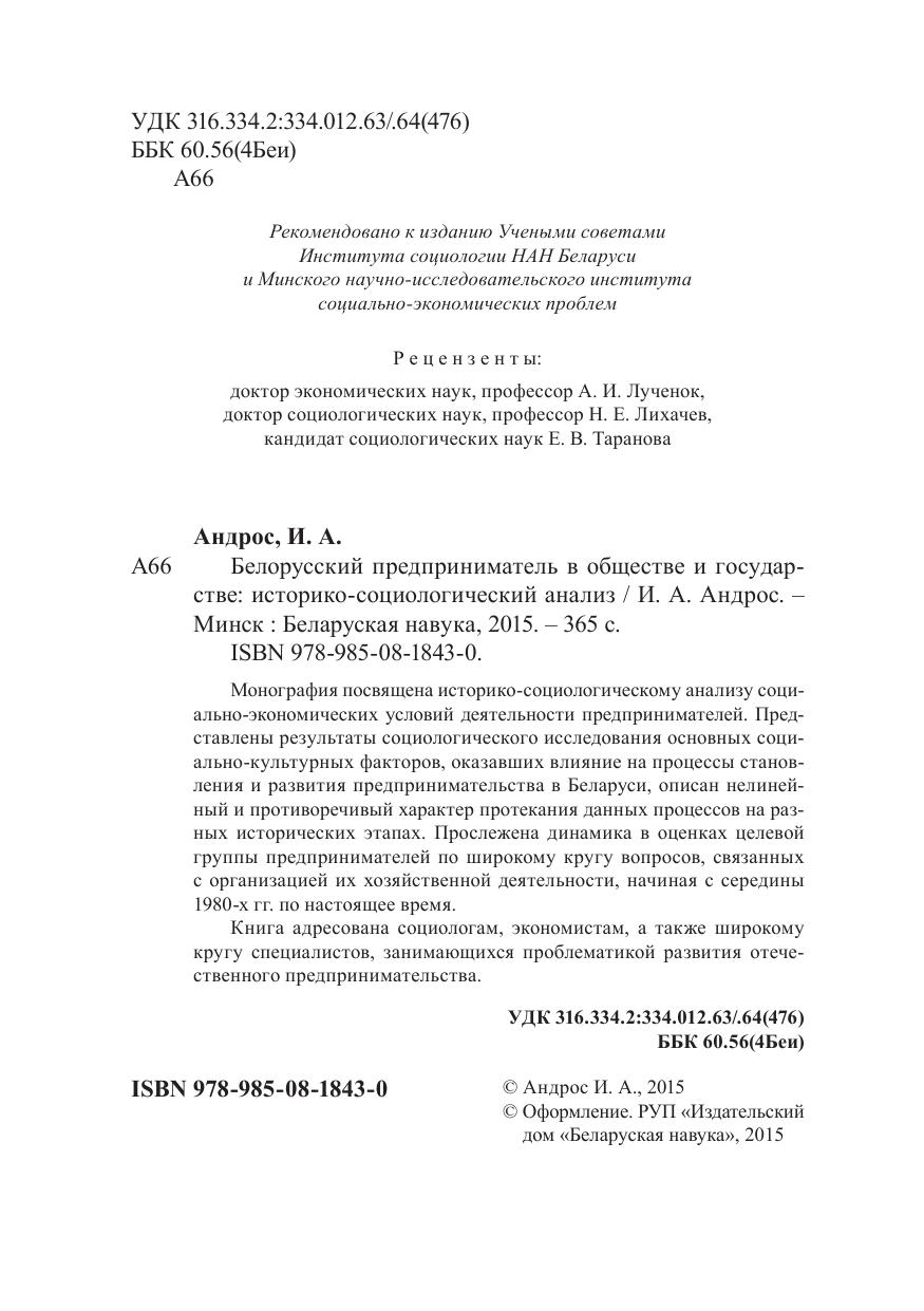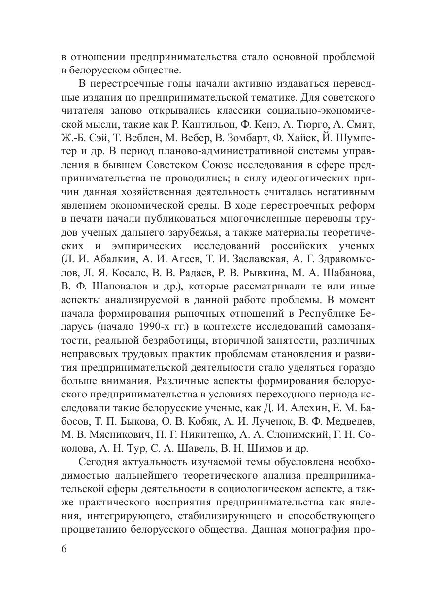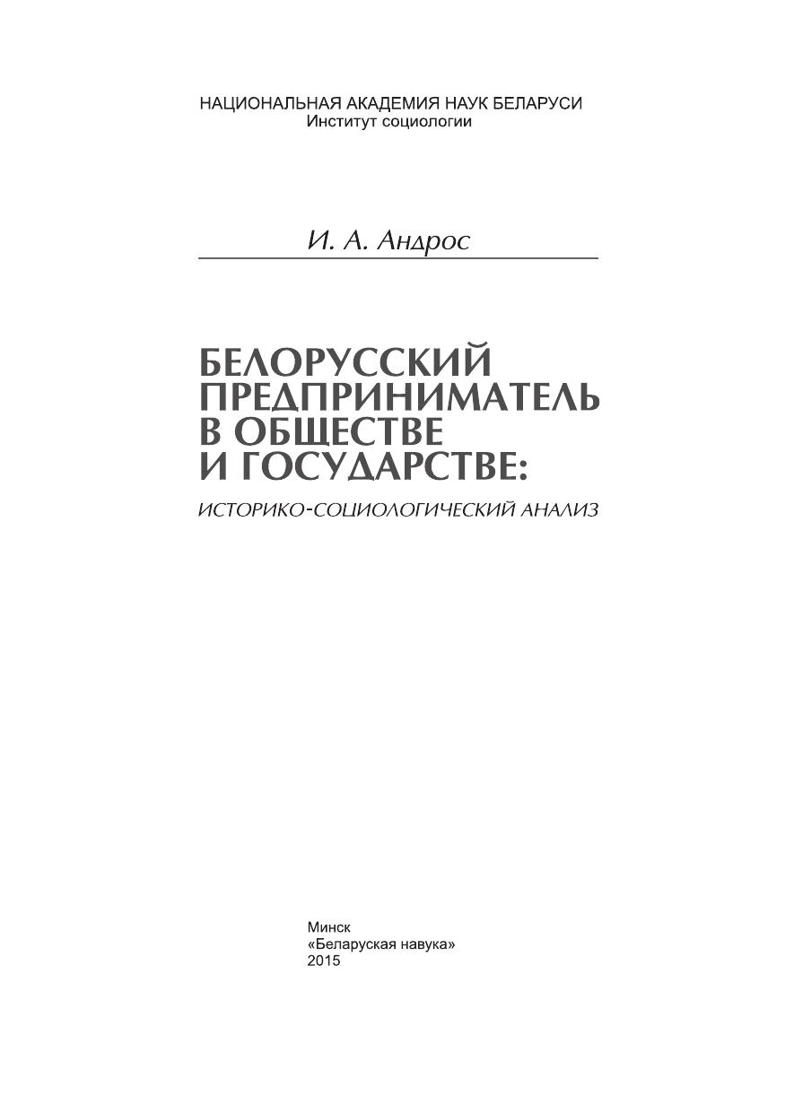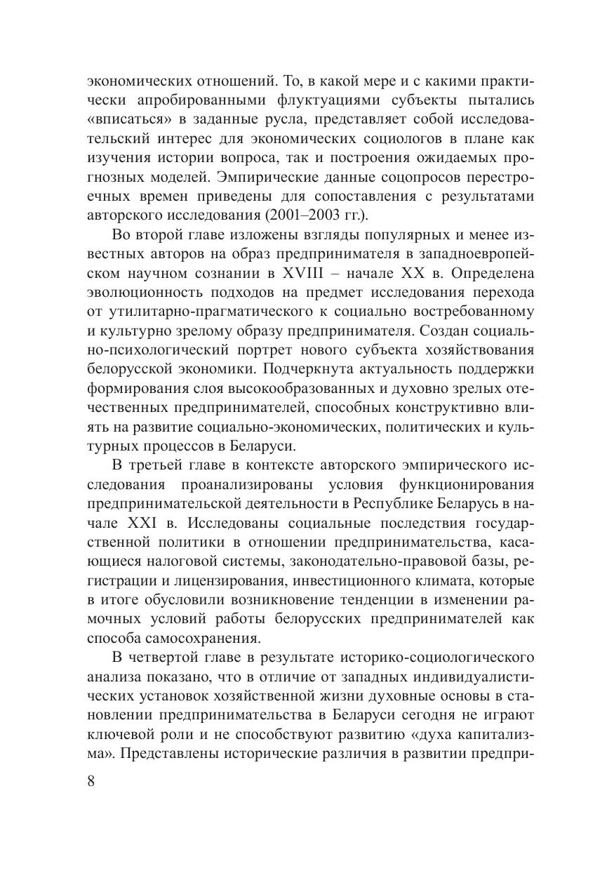 Монография посвящена историкосоциологическому анализу социальноэкономических условий деятельности предпринимателей. Представлены результаты социологического исследования основных социальнокультурных факторов, оказавших влияние на процессы становления и развития предпринимательства в Беларуси, описан нелинейный и противоречивый характер протекания данных процессов на разных исторических этапах. Прослежена динамика в оценках целевой группы предпринимателей по широкому кругу вопросов, связанных с организацией их хозяйственной деятельности, начиная с середины 1980х гг. по настоящее время. Книга адресована социологам, экономистам, а также широкому кругу специалистов, занимающихся проблематикой развития отечественного предпринимательства.