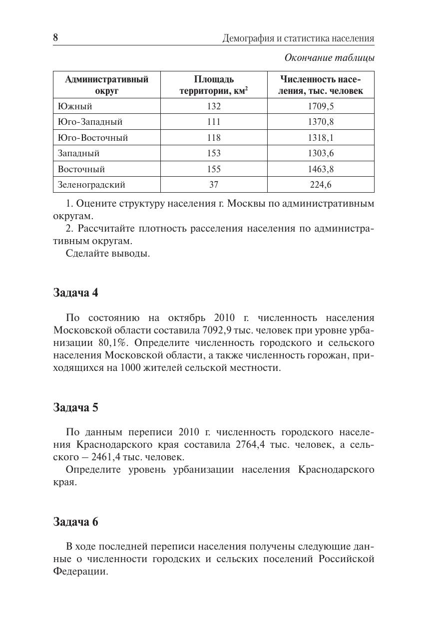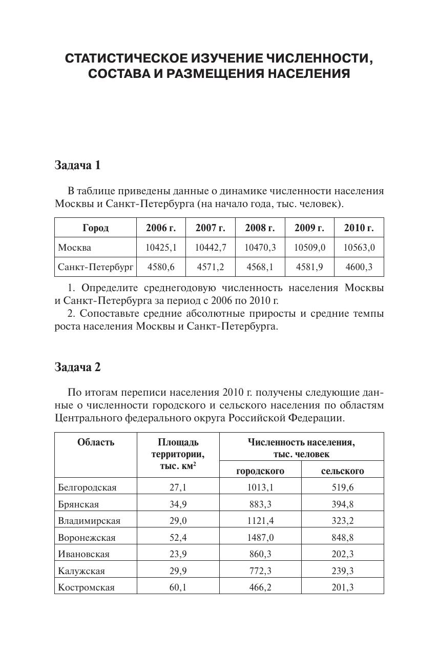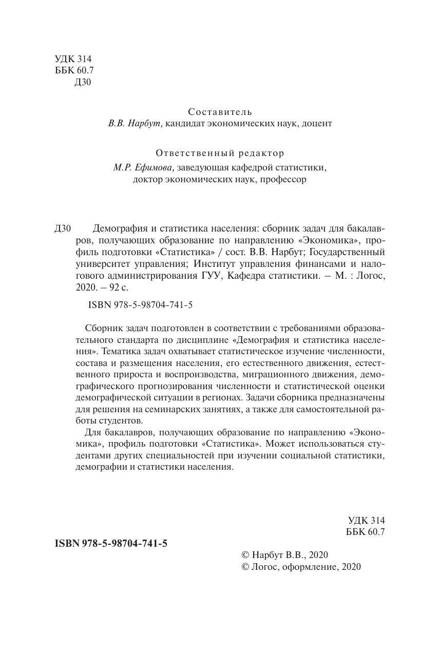 Сборник задач подготовлен в соответствии с требованиями образовательного стандарта по дисциплине «Демография и статистика населения». Тематика задач охватывает статистическое изучение численности, состава и размещения населения, его естественного движения, естественного прироста и воспроизводства, миграционного движения, демографического прогнозирования численности и статистической оценки демографической ситуации в регионах. Задачи сборника предназначены для решения на семинарских занятиях, а также для самостоятельной работы студентов. Для бакалавров, получающих образование по направлению «Экономика», профиль подготовки «Статистика». Может использоваться студентами других специальностей при изучении социальной статистики, демографии и статистики населения.