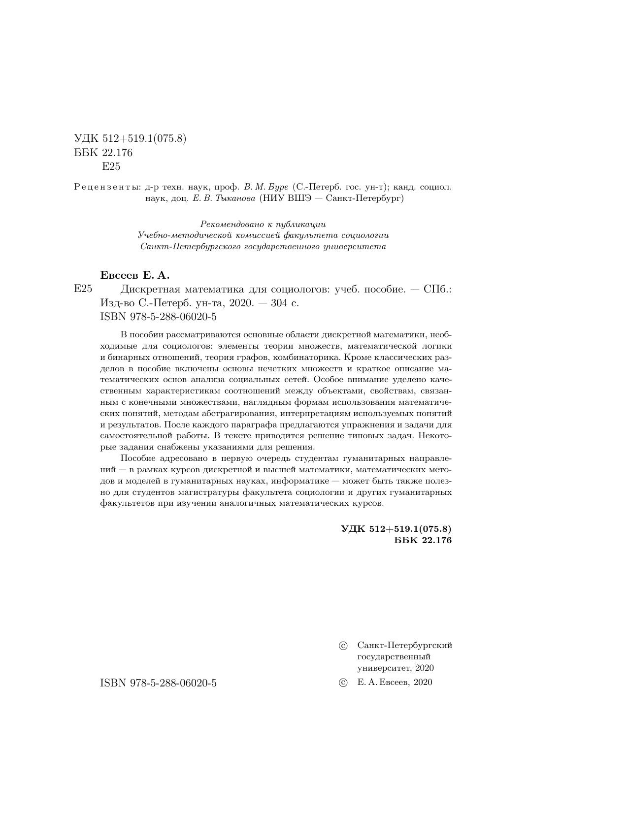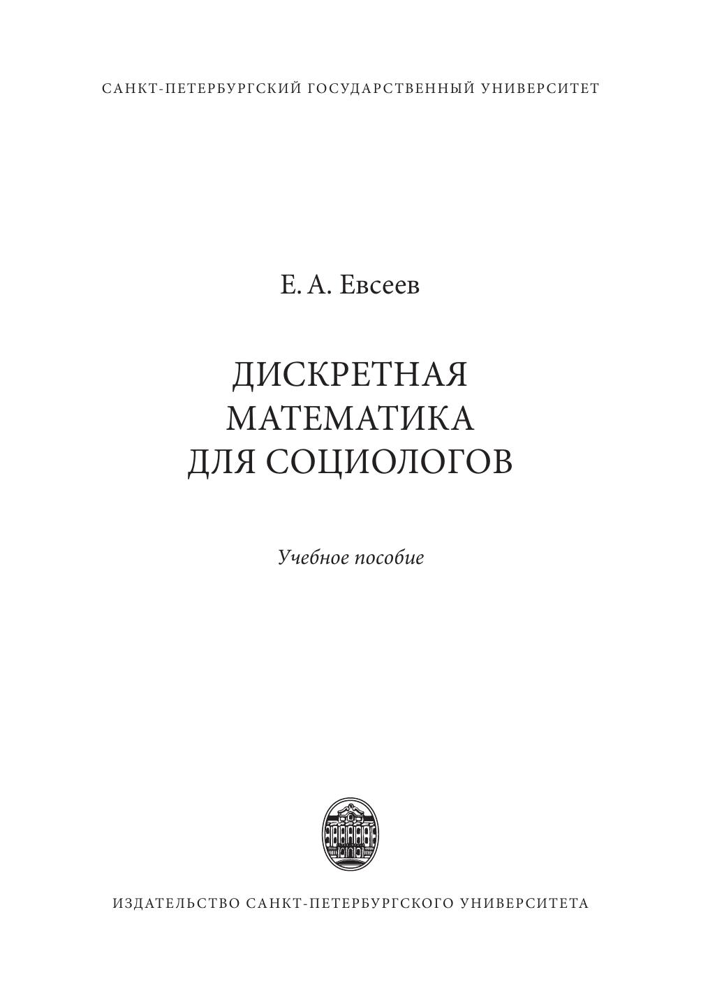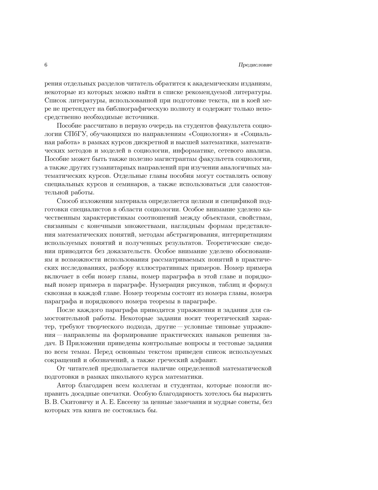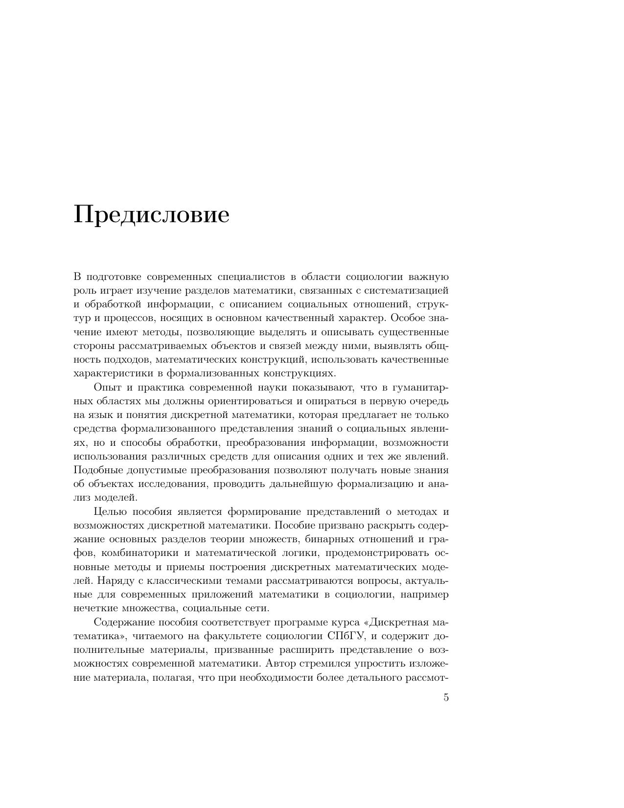 В пособии рассматриваются основные области дискретной математики, необходимые для социологов: элементы теории множеств, математической логики и бинарных отношений, теория графов, комбинаторика. Кроме классических разделов в пособие включены основы нечетких множеств и краткое описание математических основ анализа социальных сетей. Особое внимание уделено качественным характеристикам соотношений между объектами, свойствам, связанным с конечными множествами, наглядным формам использования математических понятий, методам абстрагирования, интерпретациям используемых понятий и результатов. После каждого параграфа предлагаются упражнения и задачи для самостоятельной работы. В тексте приводится решение типовых задач. Некоторые задания снабжены указаниями для решения.
