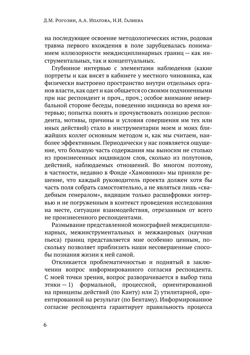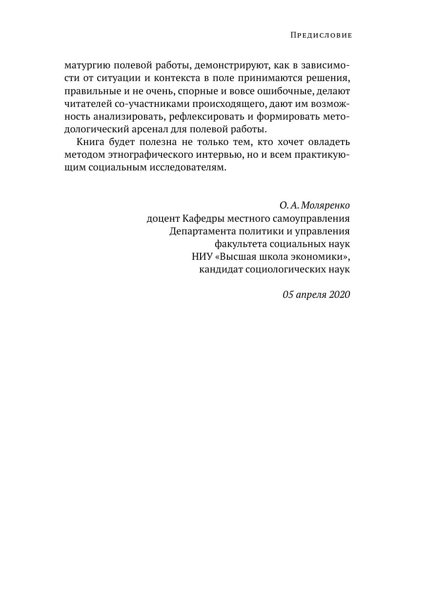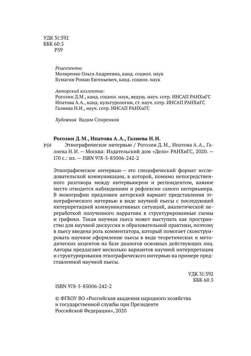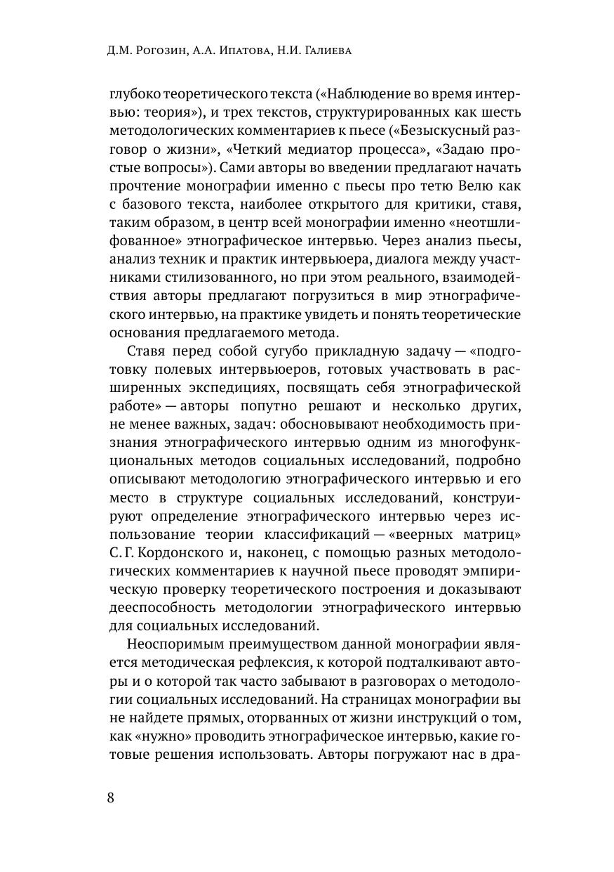 Этнографическое интервью — это специфический формат исследовательской коммуникации, в которой, помимо непосредственного разговора между интервьюером и респондентом, важное место отводится наблюдениям и рефлексии самого интервьюера. В монографии предложен авторский вариант представления этнографического интервью в виде научной пьесы с последующей интерпретацией коммуникативных ситуаций, аналитической переработкой полученного нарратива в структурированные схемы и графики. Такая научная пьеса может выступать как пространство для научной дискуссии и образовательной практики, поэтому в пьесу введена роль комментатора, который помогает сконструировать научное оформление пьесы в виде теоретических и методических акцентов на базе диалогов основных действующих лиц. Авторы предлагают несколько вариантов научной интерпретации и структурирования этнографического интервью на примере представленной научной пьесы.