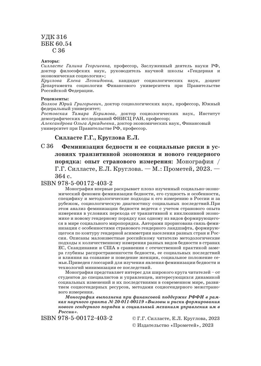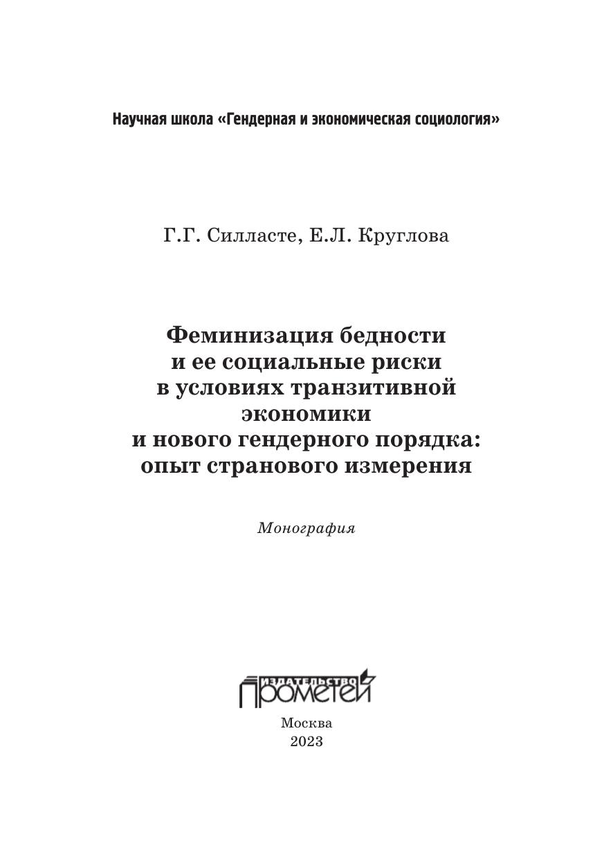 Монография впервые раскрывает плохо изученный социально-экономический феномен феминизации бедности, его сущность и особенности, специфику и методологические подходы к его измерению в России и за рубежом, социологическую диагностику социальных последствий. При этом анализ феминизации бедности ведется с учетом странового опыта измерения в условиях перехода от транзитивной к инклюзивной экономике и новому гендерному порядку как одному из видов формирующегося в мире социального миропорядка. Авторами прорисована связь феминизации с особенностями странового гендерного ландшафта, формирующегося по контуру гендерной асимметрии населения разных стран и России. Описаны малоизвестные российскому читателю методологические подходы к количественному измерения разных видов бедности в странах ЕС, Скандинавии и США в сравнении с отечественной практикой замера глубины распространеннгости бедности, ее социальных последствий и влияния на сознание и поведение женщин, социальное положение семьи.Приведен глоссарий для изучения явления феминизации бедности и технологий минимизации ее последствий.