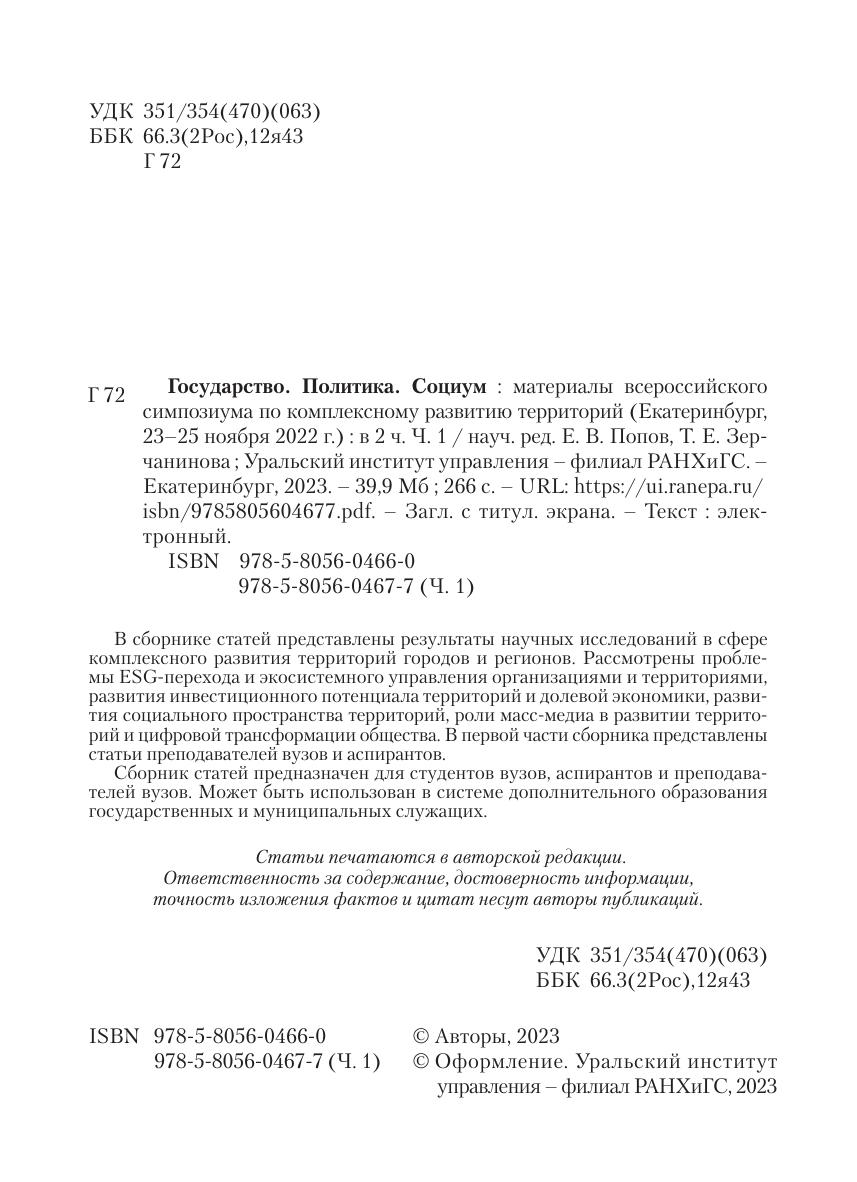 Государство. Политика. Социум: материалы всероссийского симпозиума по комплексному развитию территорий (Екатеринбург,23–25 ноября 2022 г.): в 2 ч. Ч. 1