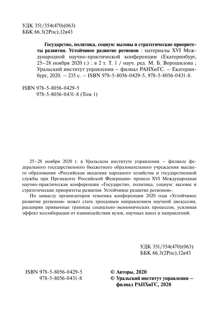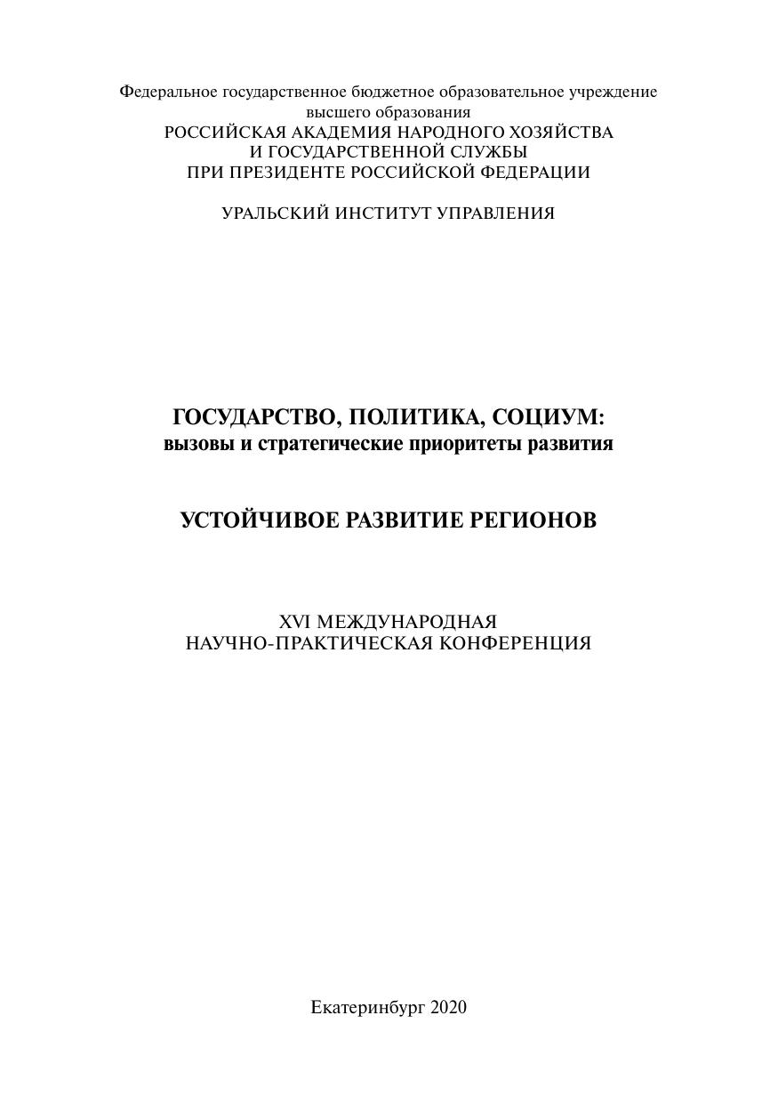 Государство, политика,социум: вызовы и стратегические приоритеты развития. Устойчивое развитие регионов: материалы XVI Международной научно-практической конференции (Екатеринбург 25-28 ноября 2020 г.). В 2 т. Т. 1