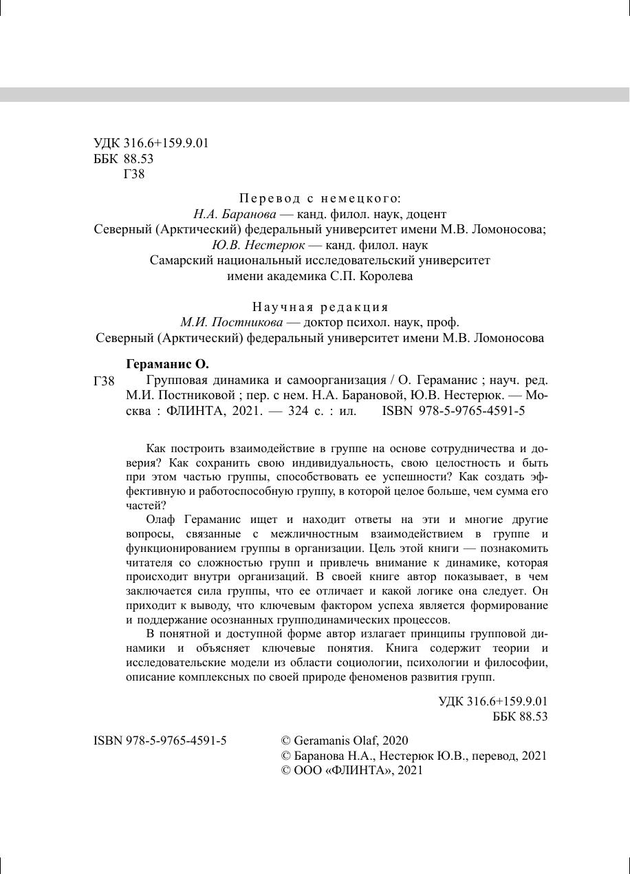Олаф Гераманис ищет и находит ответы на эти и многие другие вопросы, связанные с межличностным взаимодействием в группе и функционированием группы в организации. Цель этой книги — познакомить читателя со сложностью групп и привлечь внимание к динамике, которая происходит внутри организаций. В своей книге автор показывает, в чем заключается сила группы, что ее отличает и какой логике она следует. Он приходит к выводу, что ключевым фактором успеха является формирование и поддержание осознанных групподинамических процессов.