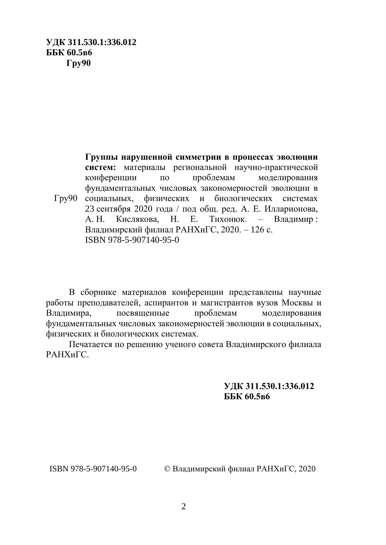 Группы нарушенной симметрии в процессах эволюции систем: материалы региональной научно-практической конференции по проблемам моделирования фундаментальных числовых закономерностей эволюции в социальных, физических и биологических системах 23 сентября 2020 года