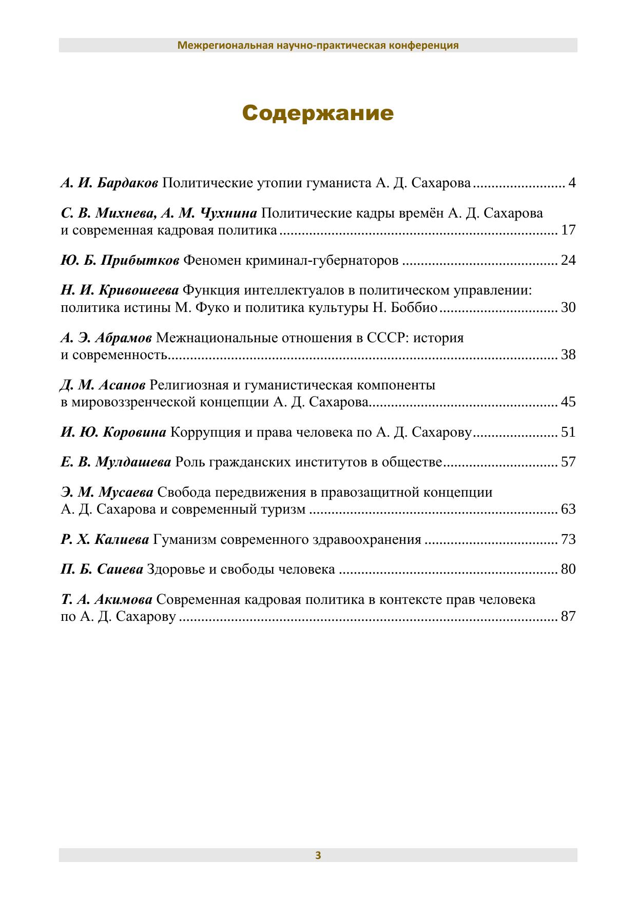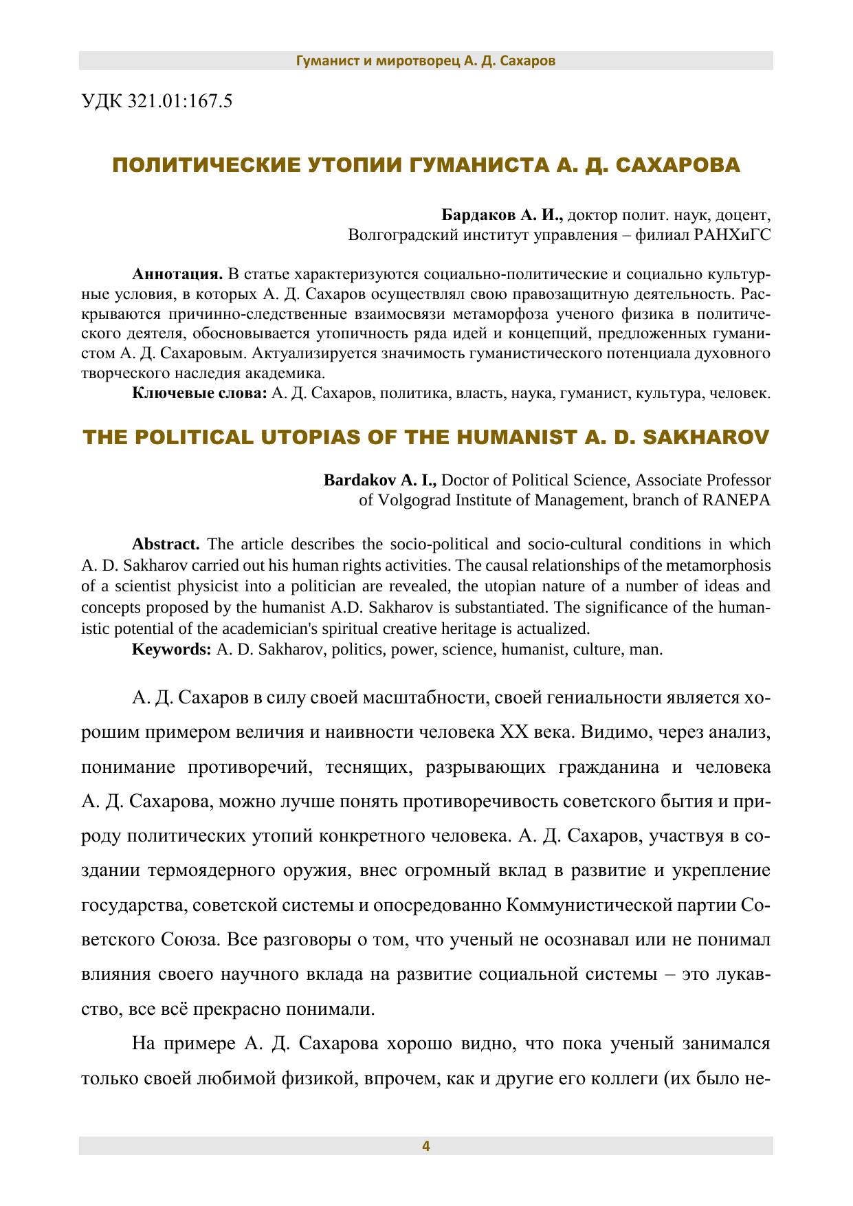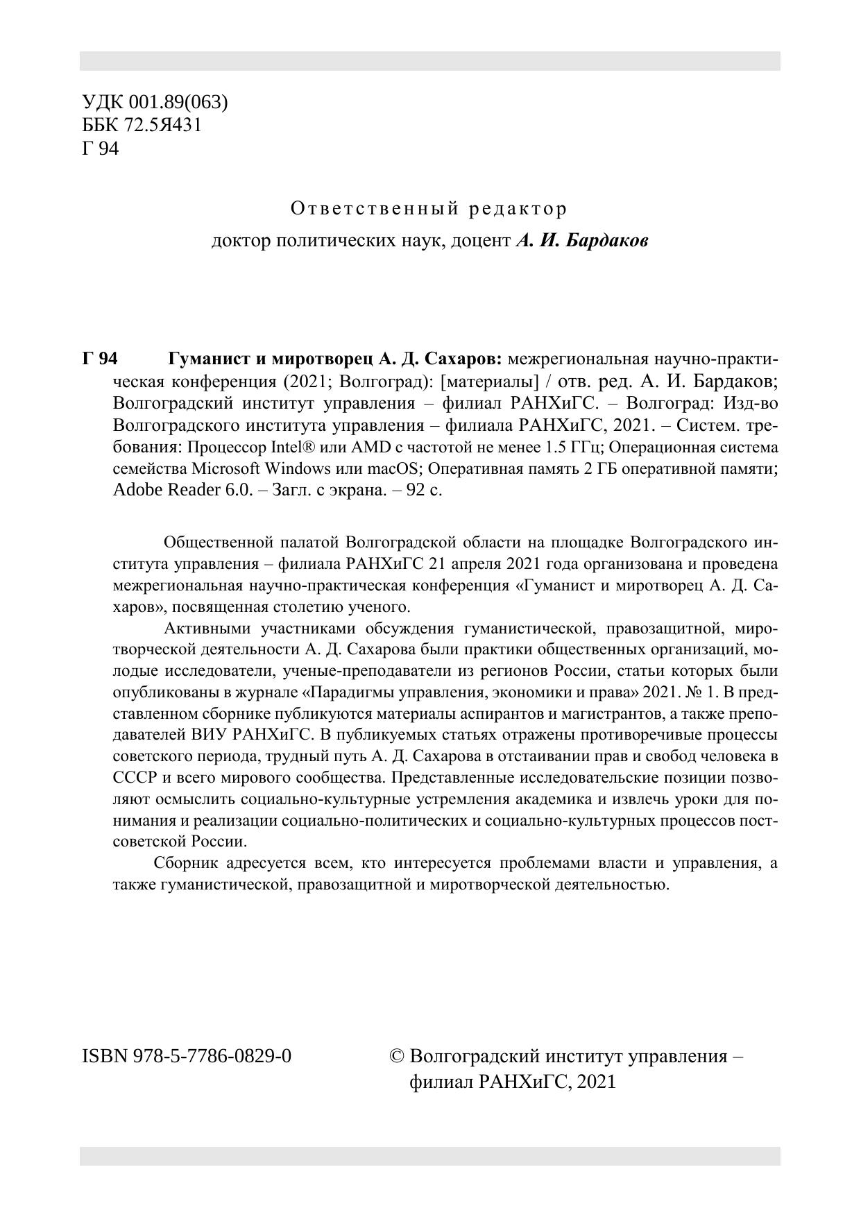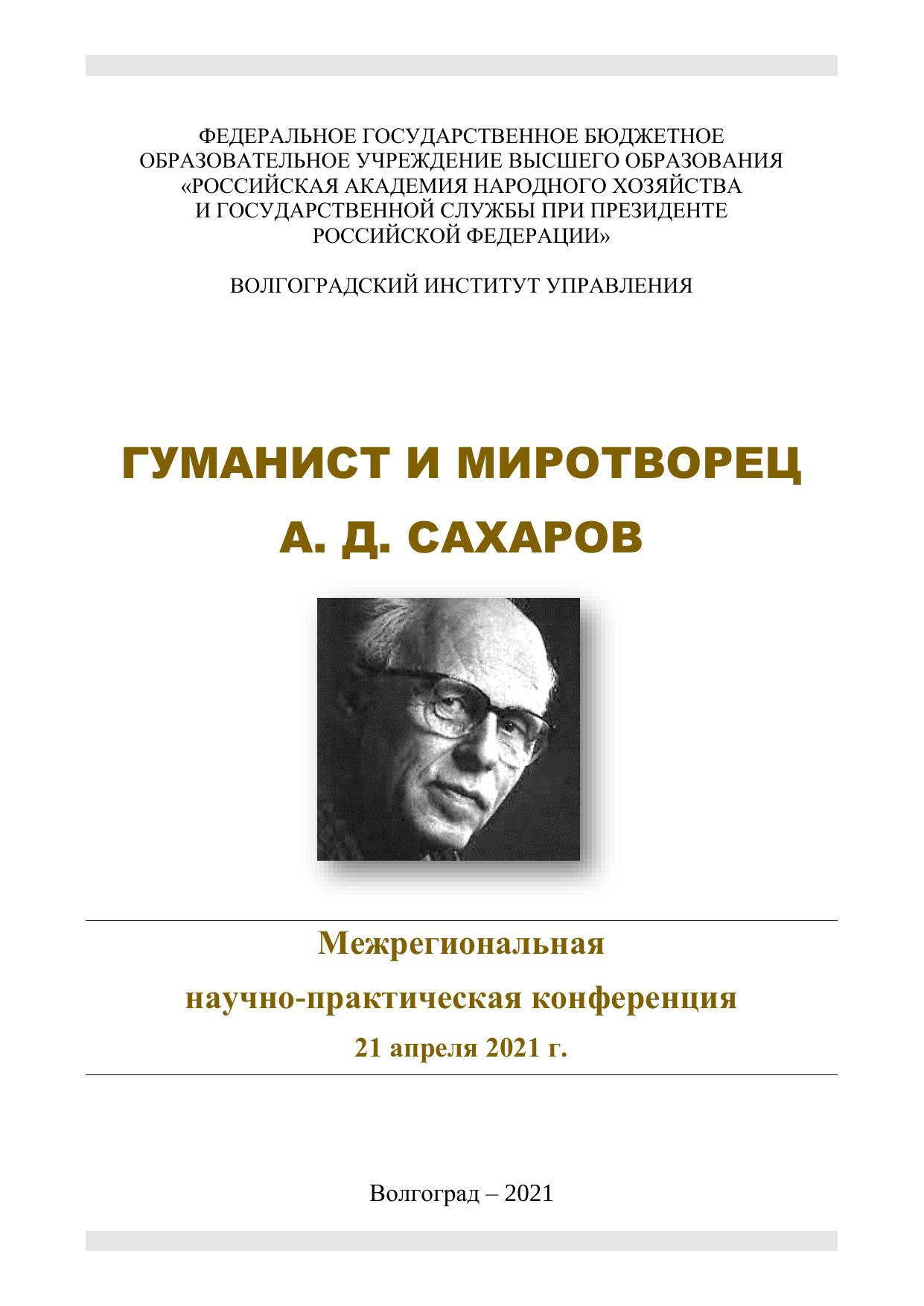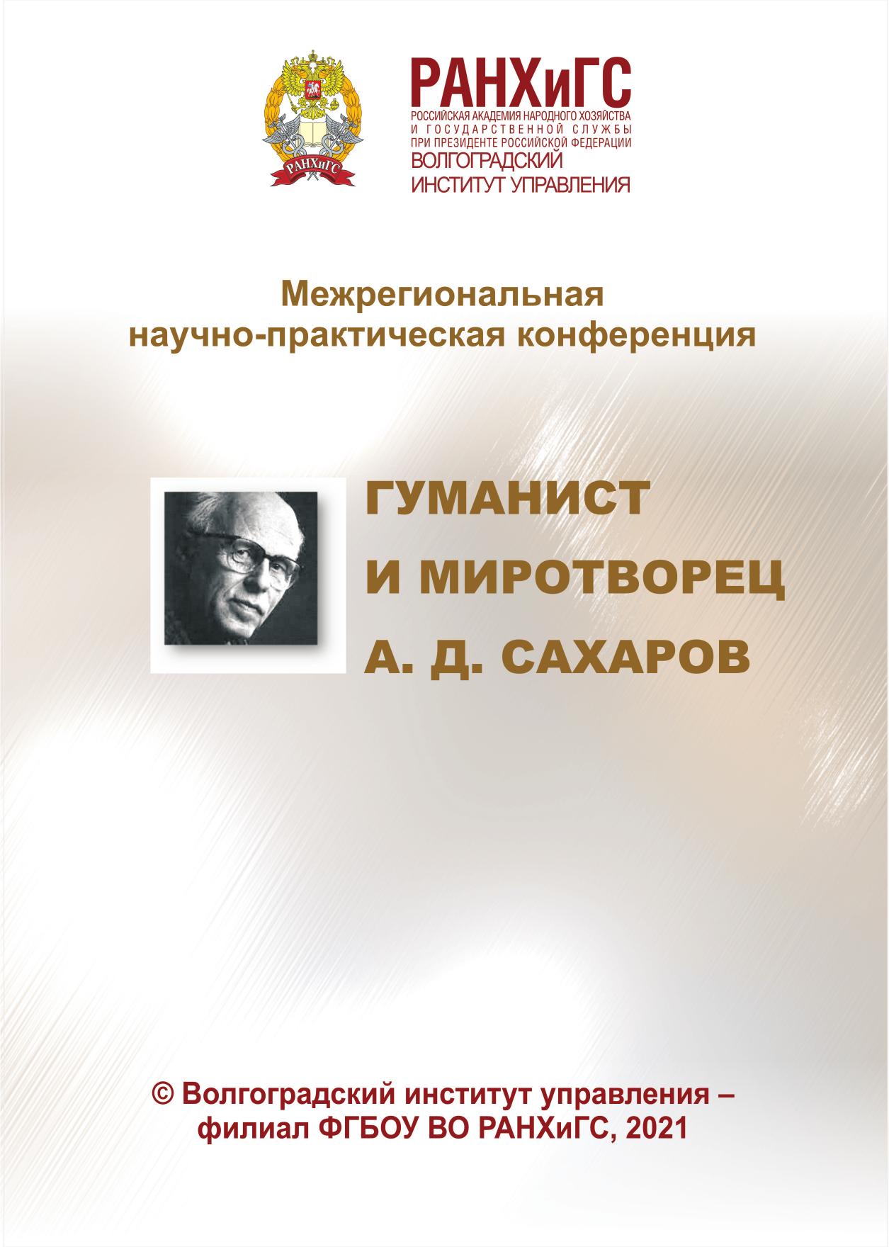 Общественной палатой Волгоградской области на площадке Волгоградского института управления – филиала РАНХиГС 21 апреля 2021 года организована и проведена межрегиональная научно-практическая конференция «Гуманист и миротворец А. Д. Сахаров», посвященная столетию ученого. Активными участниками обсуждения гуманистической, правозащитной, миротворческой деятельности А. Д. Сахарова были практики общественных организаций, молодые исследователи, ученые-преподаватели из регионов России, статьи которых были опубликованы в журнале «Парадигмы управления, экономики и права» 2021. № 1. В представленном сборнике публикуются материалы аспирантов и магистрантов, а также преподавателей ВИУ РАНХиГС. В публикуемых статьях отражены противоречивые процессы советского периода, трудный путь А. Д. Сахарова в отстаивании прав и свобод человека в СССР и всего мирового сообщества. Представленные исследовательские позиции позволяют осмыслить социально-культурные устремления академика и извлечь уроки для понимания и реализации социально-политических и социально-культурных процессов постсоветской России. Сборник адресуется всем, кто интересуется проблемами власти и управления, а также гуманистической, правозащитной и миротворческой деятельностью.
