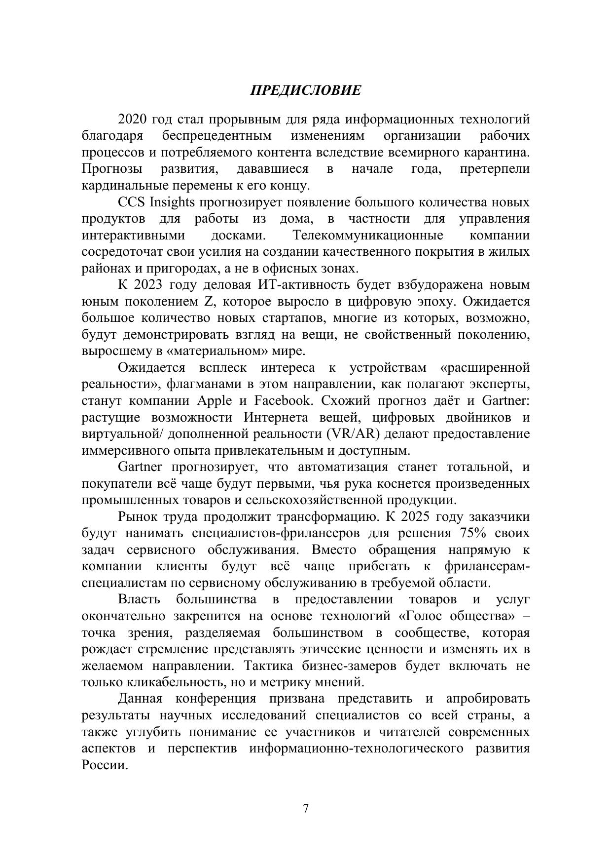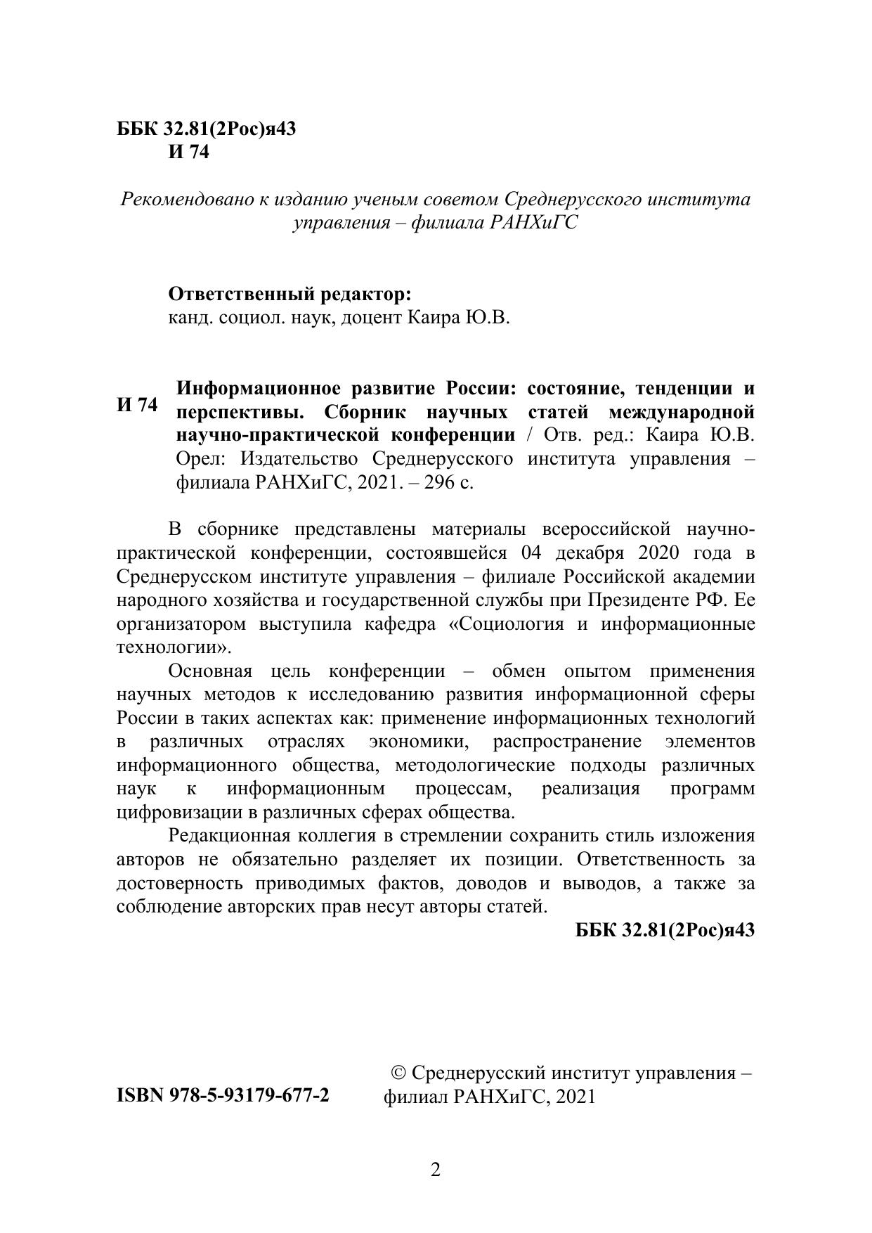 В сборнике представлены материалы всероссийской научнопрактической конференции, состоявшейся 04 декабря 2020 года в Среднерусском институте управления – филиале Российской академии народного хозяйства и государственной службы при Президенте РФ. Ее организатором выступила кафедра «Социология и информационные технологии». Основная цель конференции – обмен опытом применения научных методов к исследованию развития информационной сферы России в таких аспектах как: применение информационных технологий в различных отраслях экономики, распространение элементов информационного общества, методологические подходы различных наук к информационным процессам, реализация программ цифровизации в различных сферах общества. Редакционная коллегия в стремлении сохранить стиль изложения авторов не обязательно разделяет их позиции. Ответственность за достоверность приводимых фактов, доводов и выводов, а также за соблюдение авторских прав несут авторы статей.